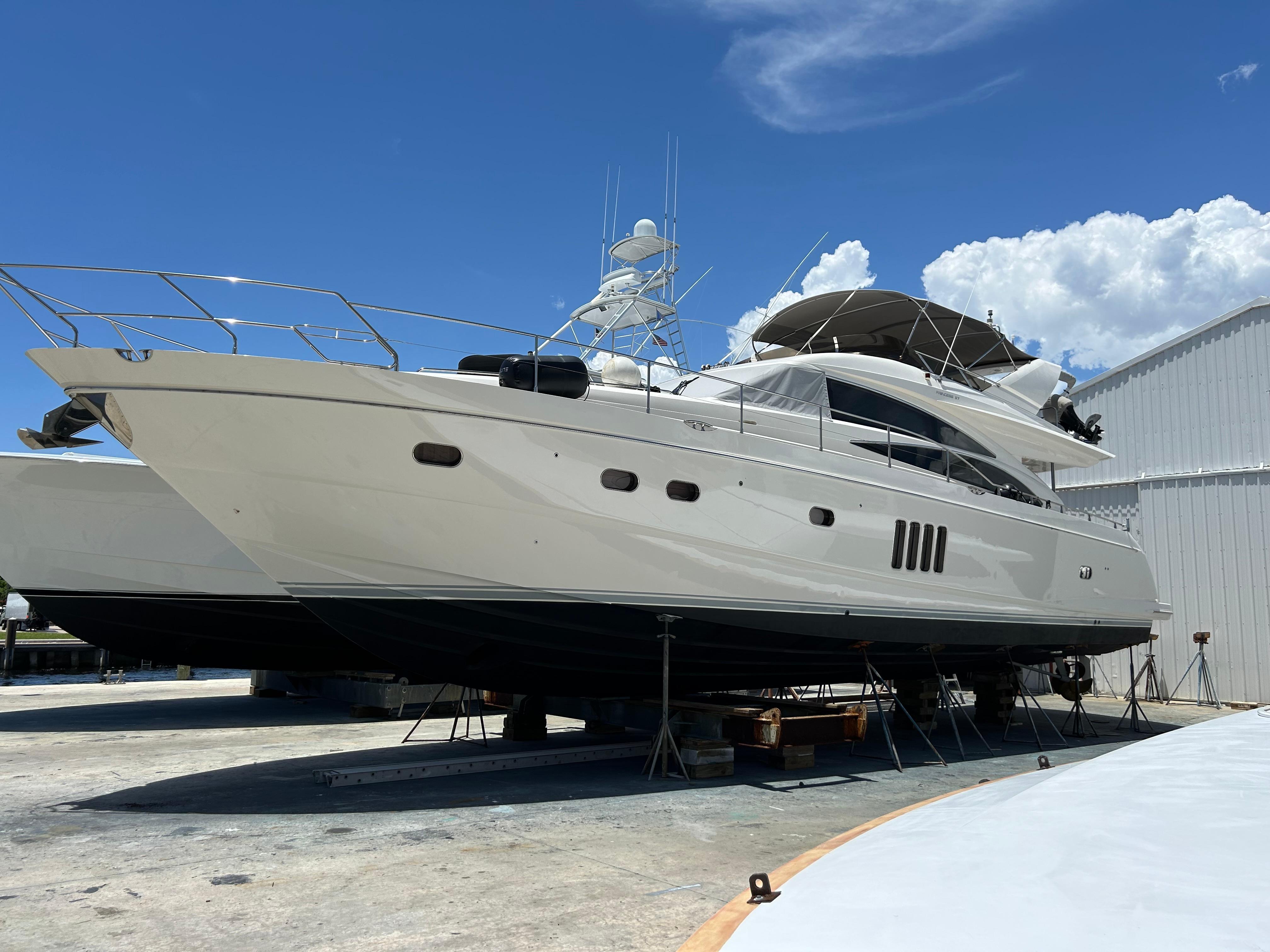 UNIQ ExteriorPrincess Yachts is one of the premium builders of top pedigree production yachts. UNIQ is a fine example of how a 17-year-old yacht can look when properly maintained. If you inspect this boat, you will find a waxed and polished white fiberglass gelcoat exterior. The hull does not have all the scuffs, scratches and blemishes we usually see on a boat this age. In fact, the hull of this Princess received a multi-step compound, polish and seal treatment during her last boatyard visit in June 2023. The superstructure is polished on a schedule. The owner of this boat has high standards and in 2023, every exterior cushion was replaced on the aft deck, flybridge and on the forward sun lounge. The main windshield cover was replaced and these upgrades helped to propel UNIQ up to one of the finer looking yachts in this size and price category.