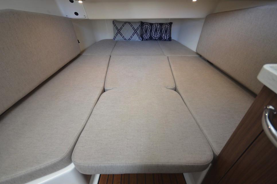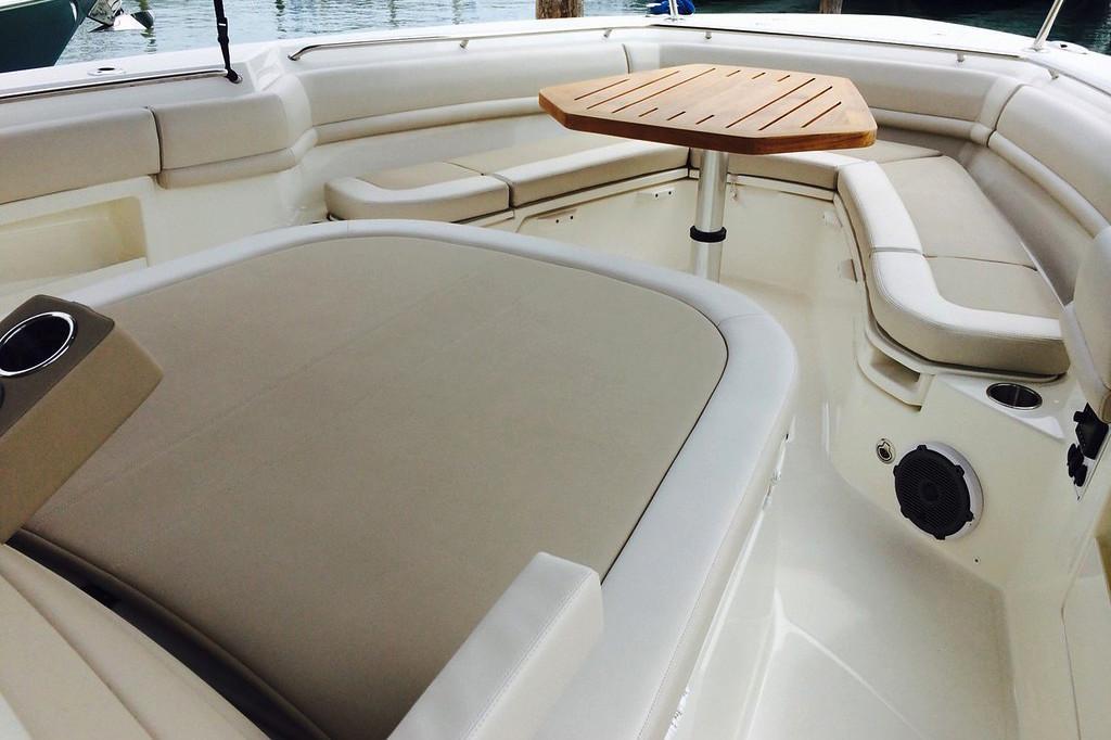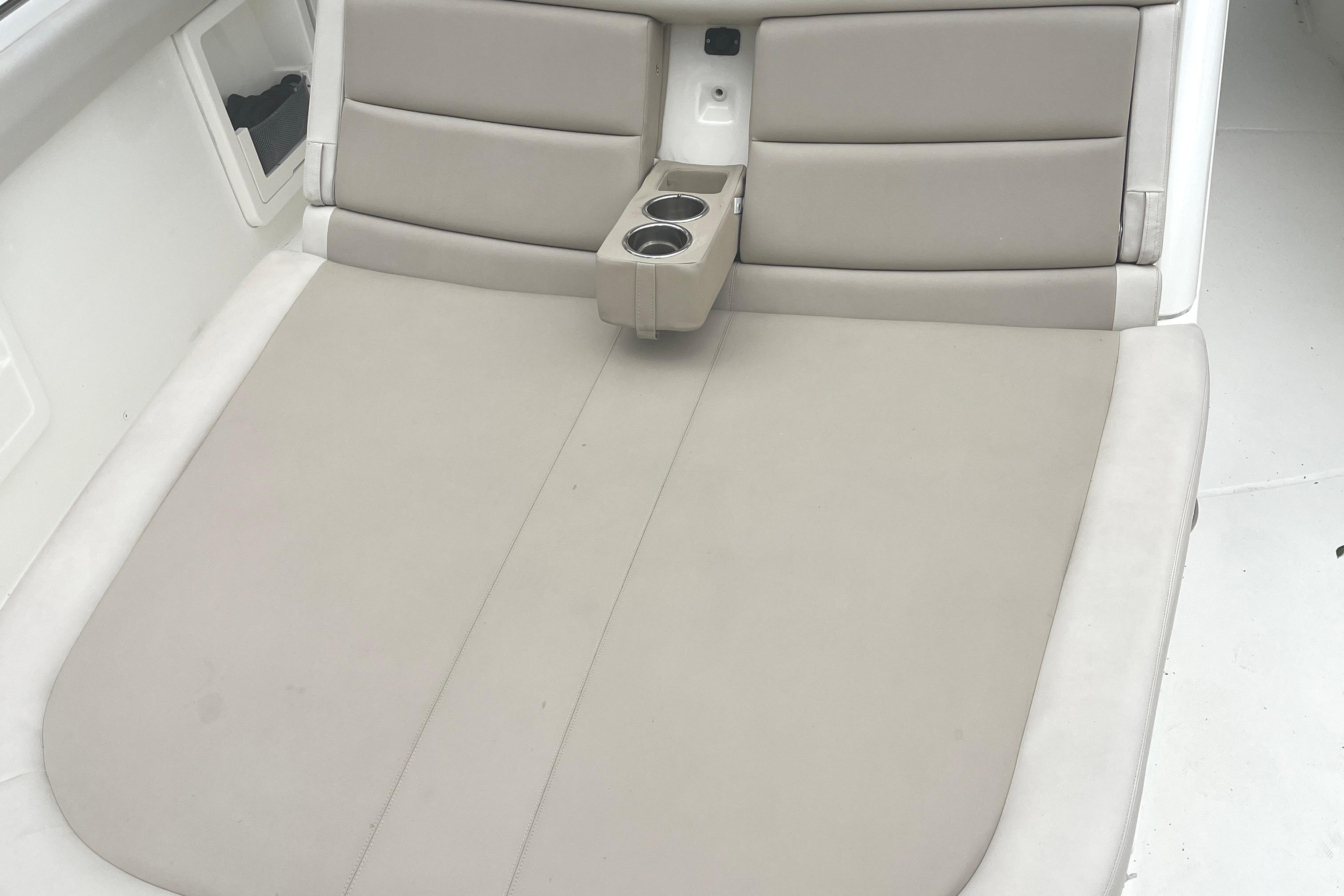 - Aft facing couch with insulated cooler storage under hinged seat, stainless steel cup holders recessed into seating arms (2)(optional 40 gallon livewell under seat)