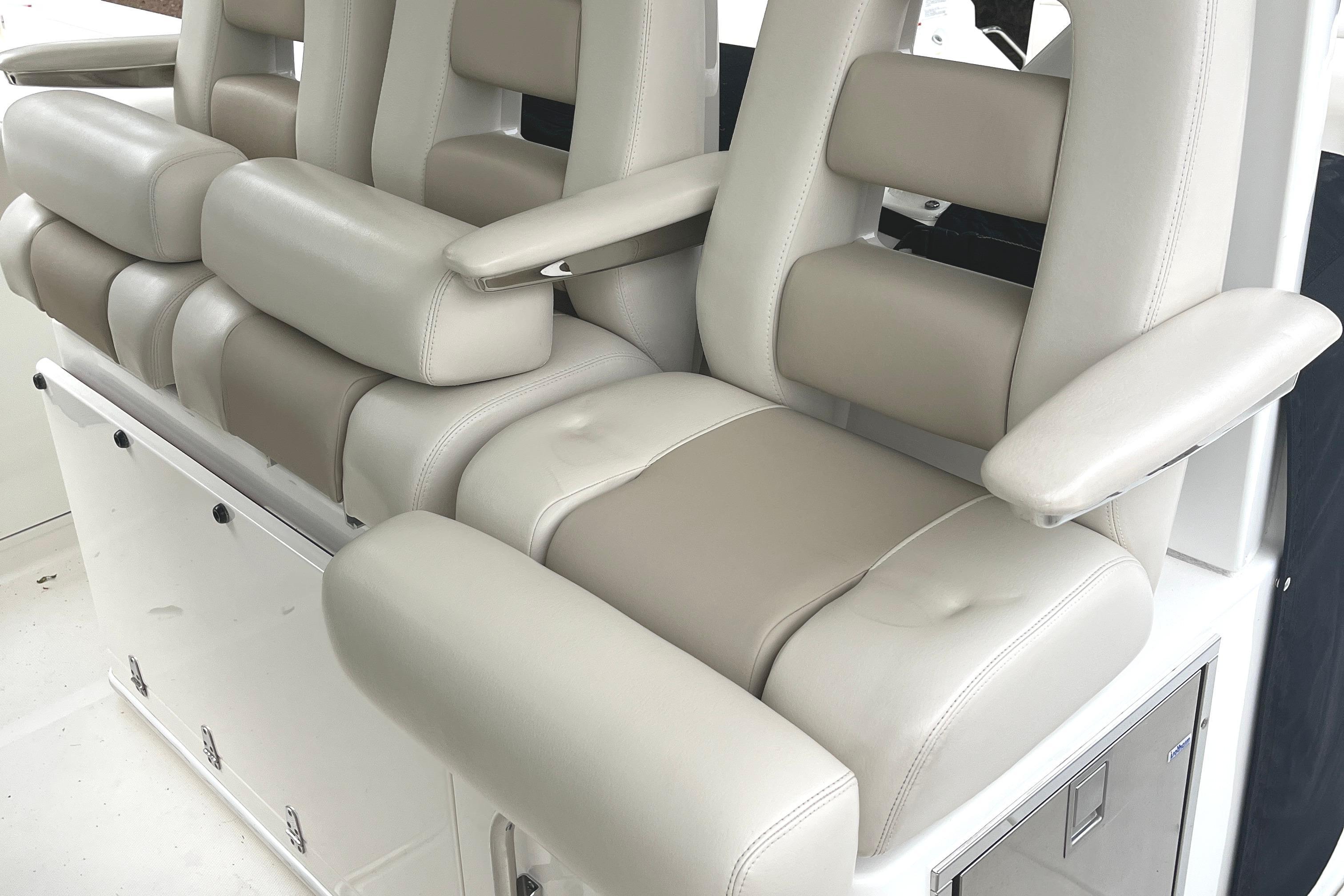 - Helm and companion bolster style seats (3) with fold-down armrests (center seat is electrically actuated) (side seats have manual fore and aft slides)