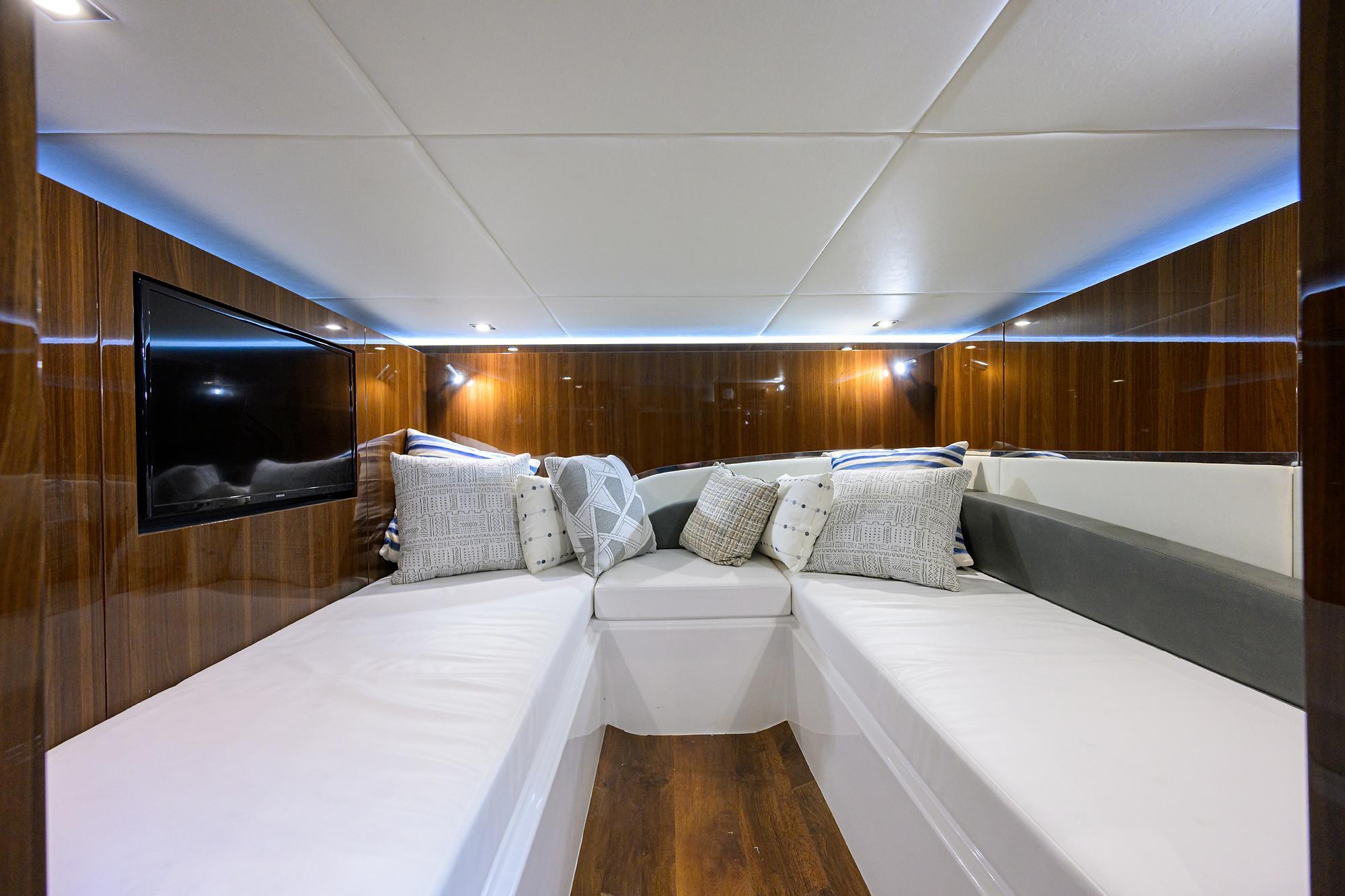 - Forward stateroom with queen berth, privacy doors, skylight with opening porthole, and 32” Samsung TV