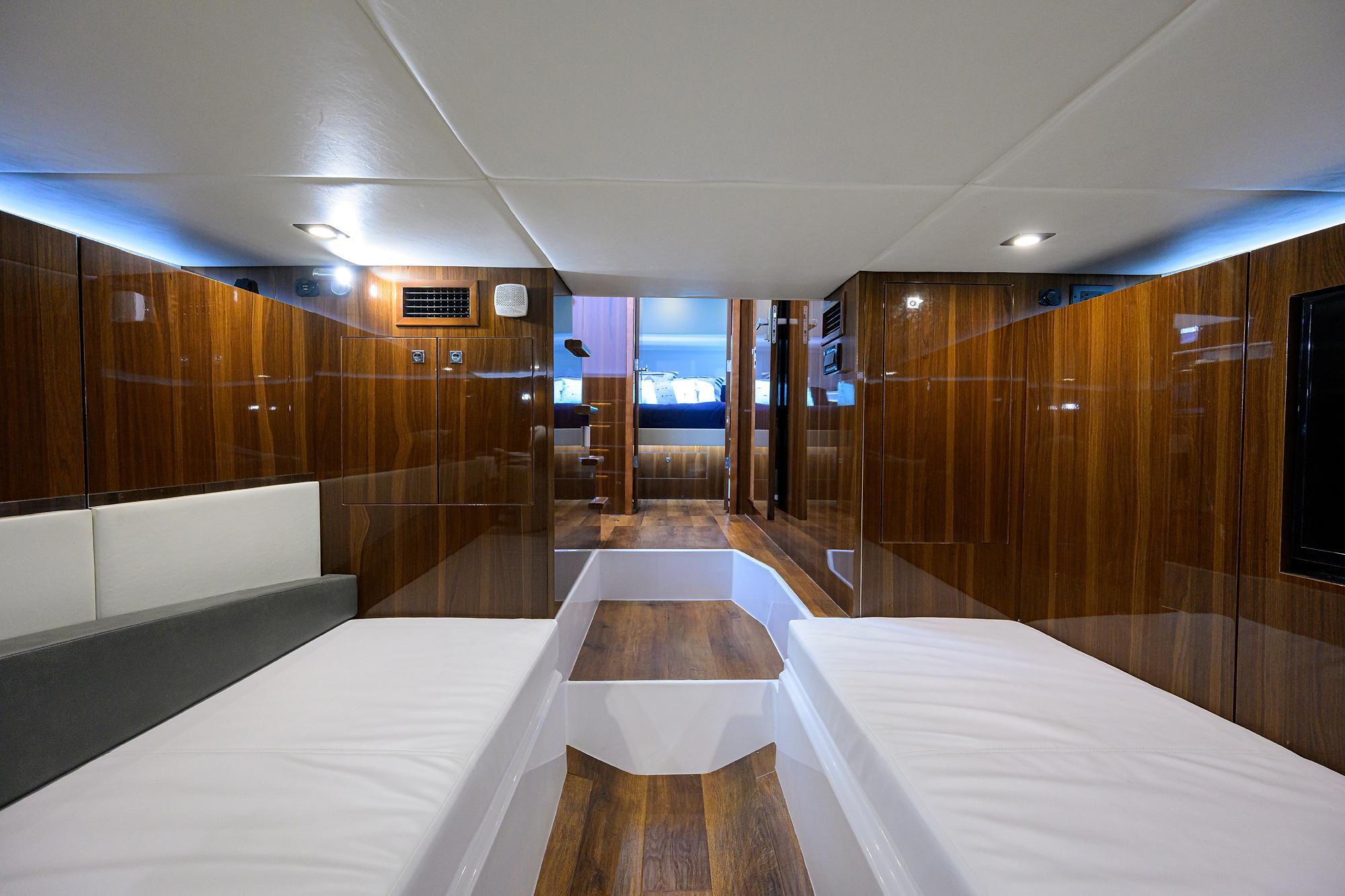- Convertible mid-cabin doubles as additional sleeping space with hidden storage