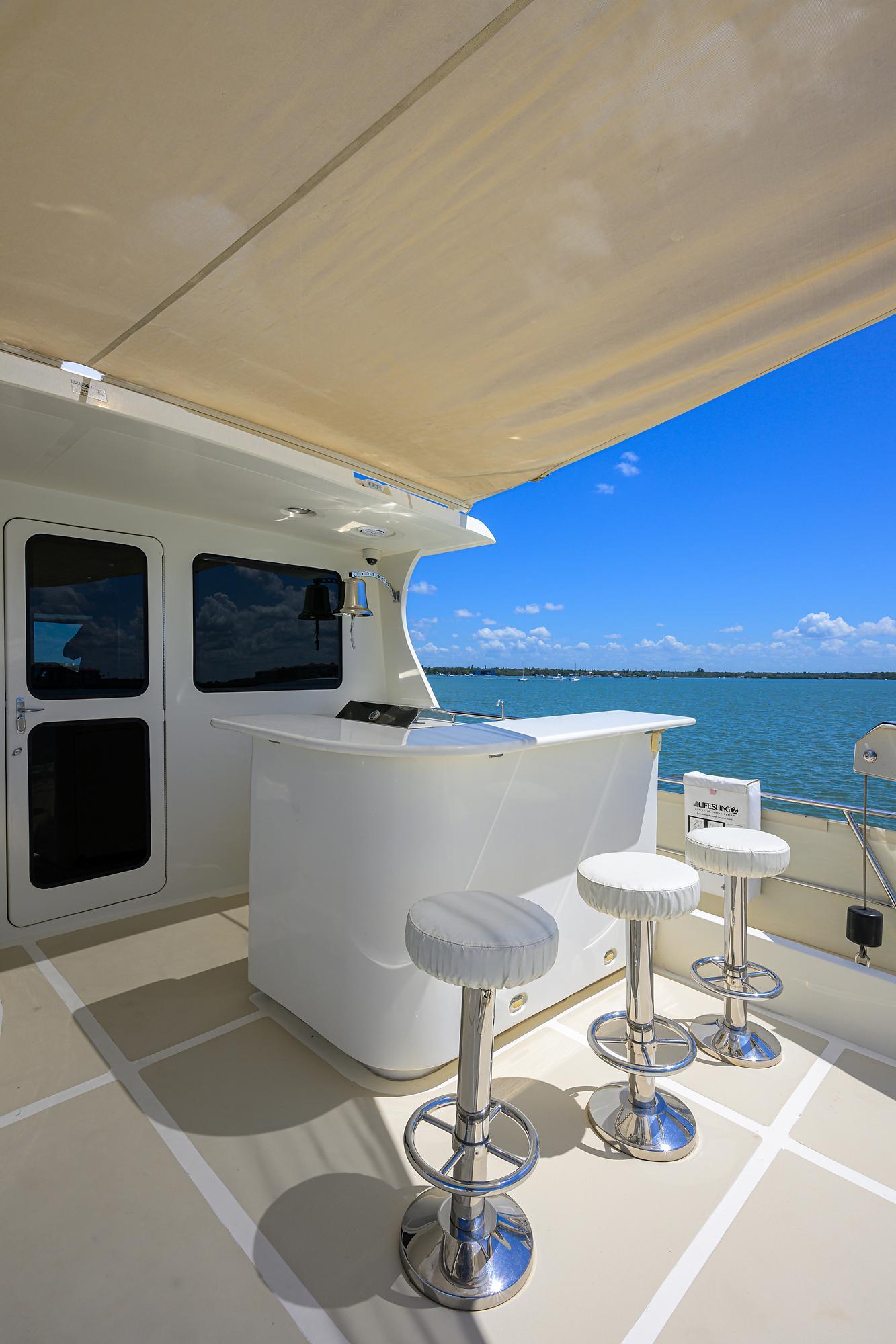 - Outdoor bar to starboard with refrigerator, sink, Magma Propane BBQ grill and bar stools
