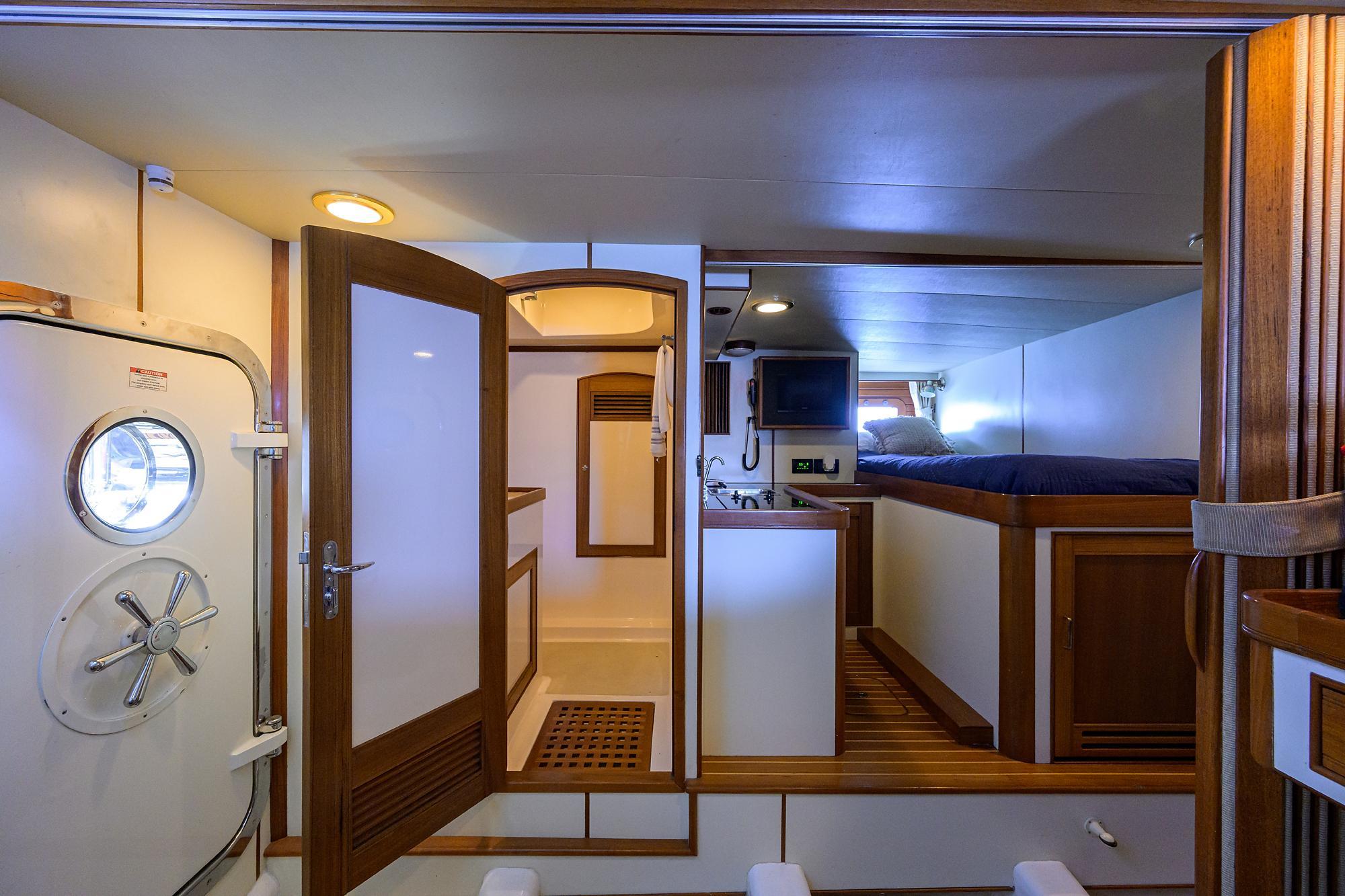 - Opposing large sofas port and starboard. Storage below and behind each sofa