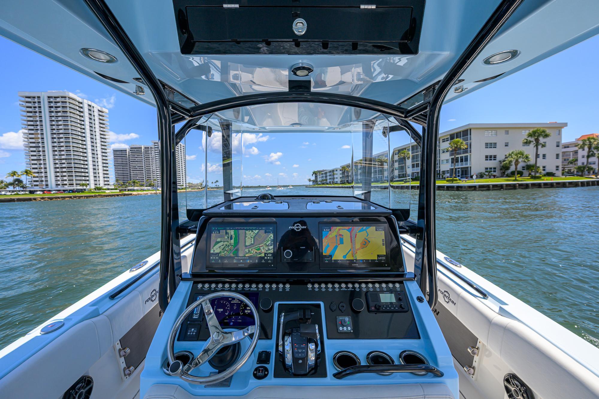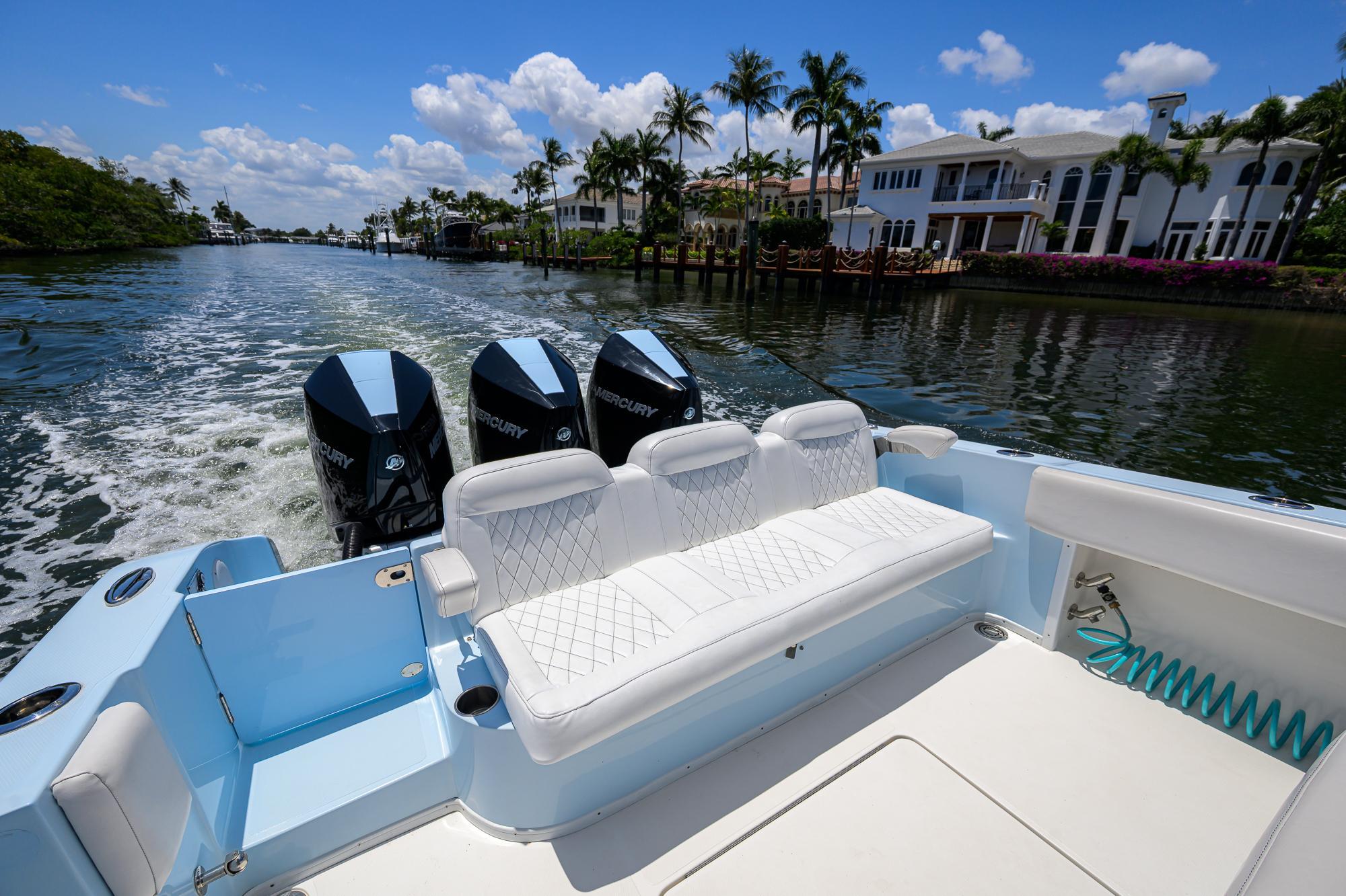 This 34 Fountain is a very well-built fishing machine. She has been well-loved and has caught a ton of fish. Her striking blue hull and interior set the boat apart from the rest and demand attention. This 34 Fountain is loaded with Garmin electronics, has triple 300 Mercury outboards (all with new upgraded HD lower units), and even has a bow thruster for ease of docking. She is equally at home in rough offshore fishing conditions as she is at the sandbar on a family Sunday! Call today to come see this awesome boat!