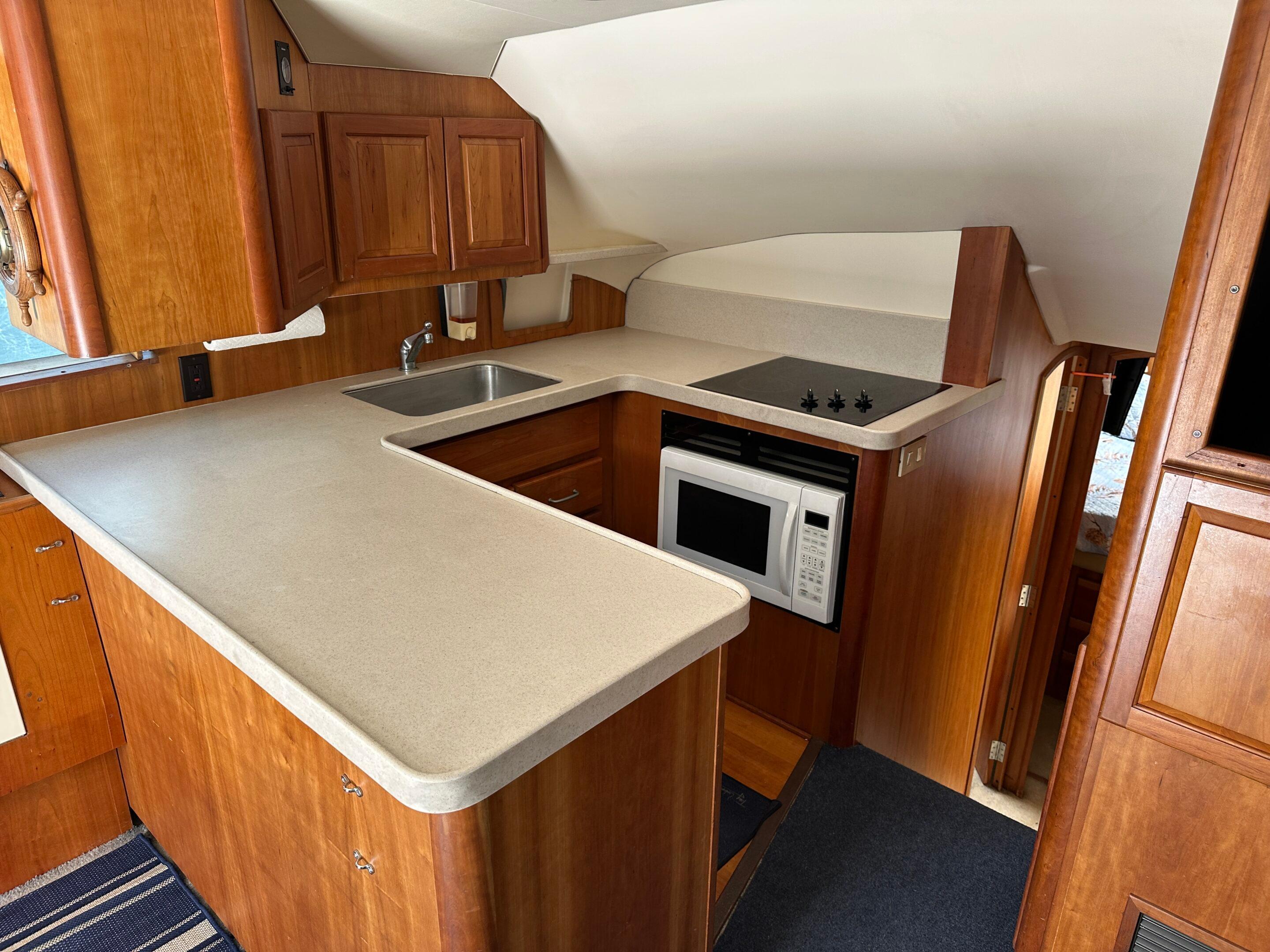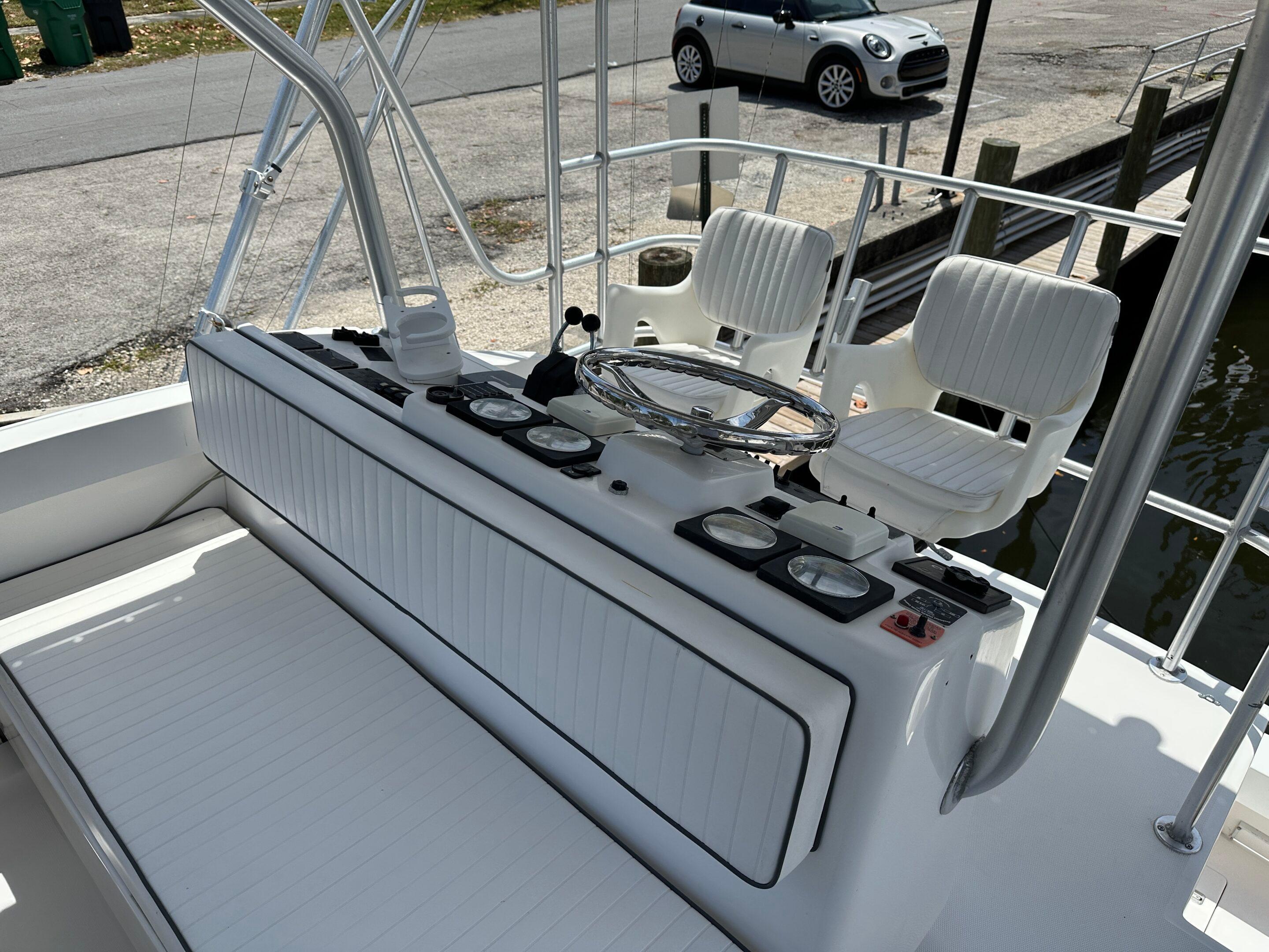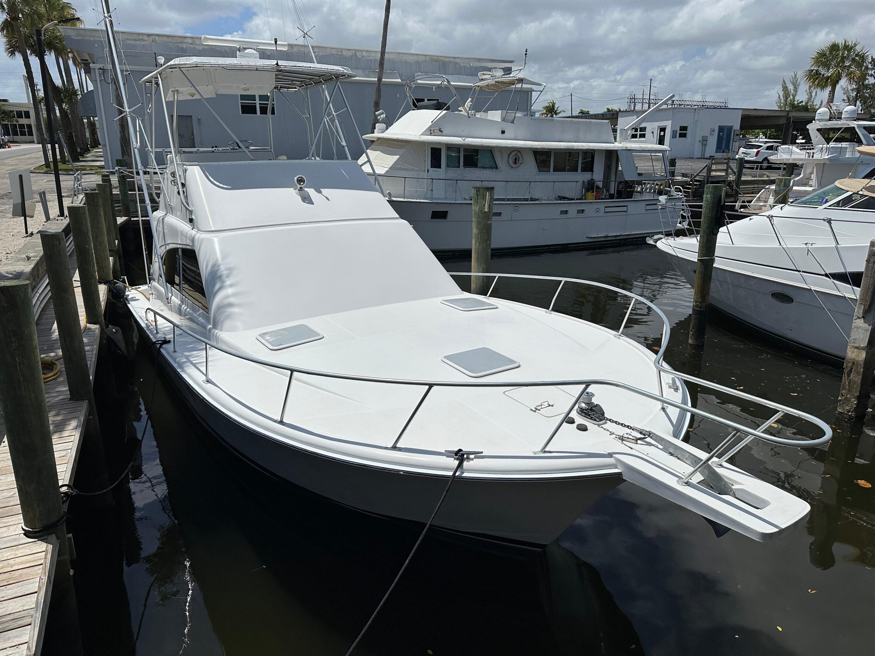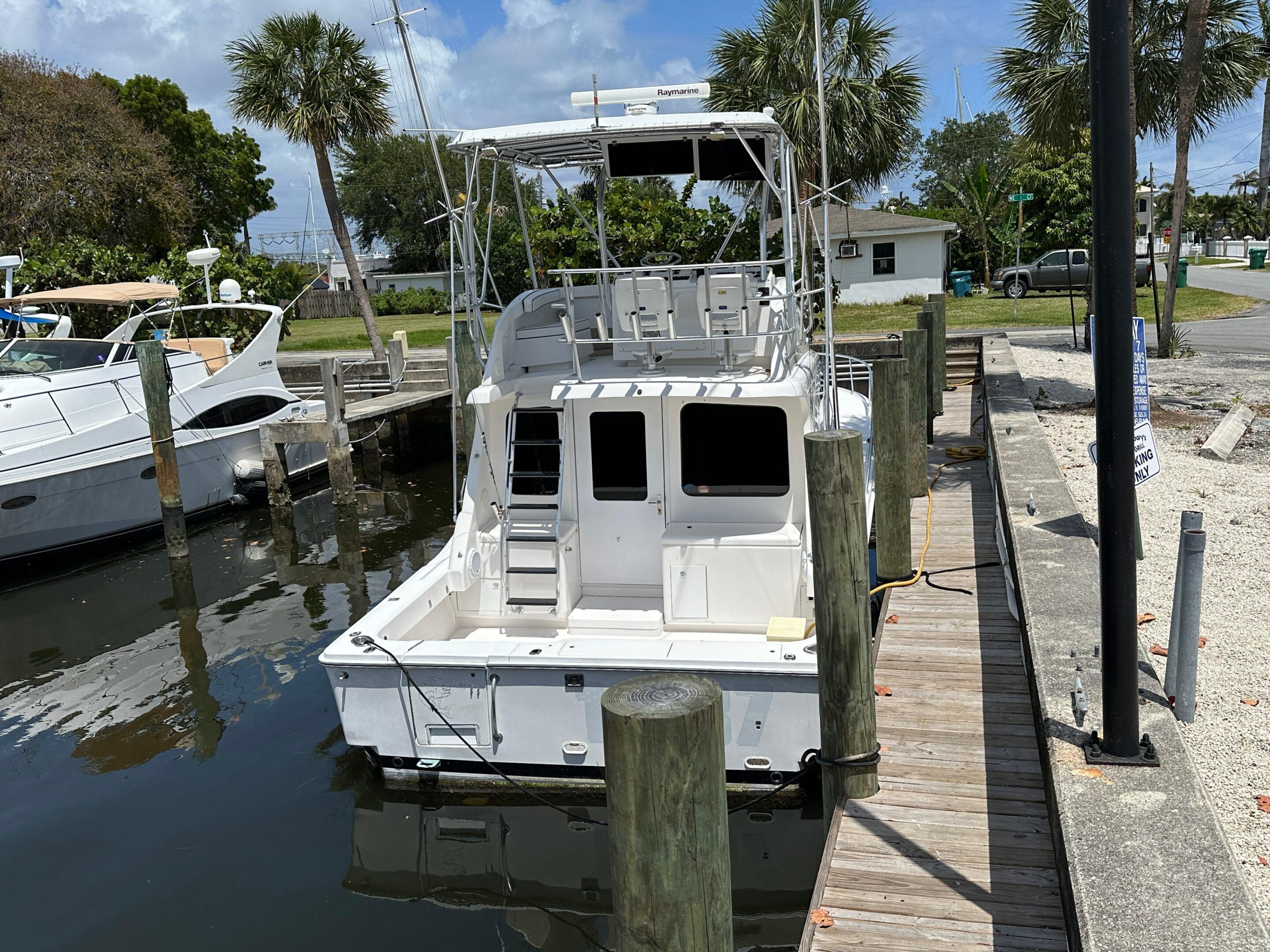 A popular boat for many years, the Luhrs 40 Convertible is a big 40-footer by any standard. With an LOA of nearly 41 feet and a beam of 14’11” feet, she dwarfs other boats in this class when it comes to interior space and accommodations. The 40 CNV rides on a modified-V hull with generous flare at the bow and balsa coring in the hullsides. The cherry interior has a two-stateroom configuration featuring a spacious main salon with convertible sofa to port and the galley forward, a large master stateroom forward, and a port guest cabin with over/under single berths. The double-entry head has a separate stall shower. A large cockpit with molded tackle centers, transom livewell, and in-deck fish/storage boxes provides a stable fishing platform. The 380/40/38 came with a long inventory of standard equipment including air conditioning, generator, rocket launchers, and factory hardtop.