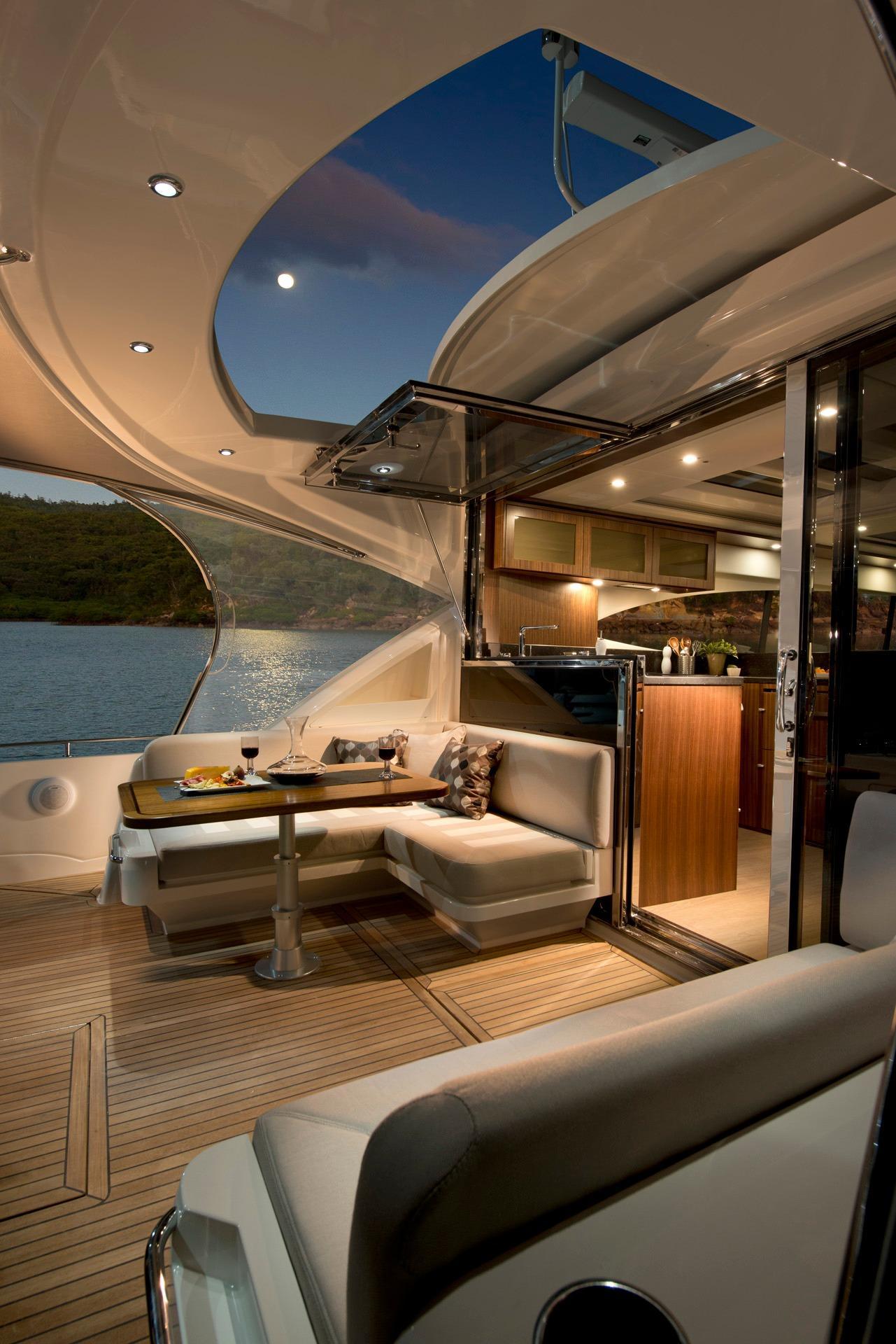 Generous entertainer’s cockpit measuring 10.5m2 (113ft2), with deep lounges both to port and starboard, as well as an aft wet bar, twin BBQ, drawer fridge and freezer