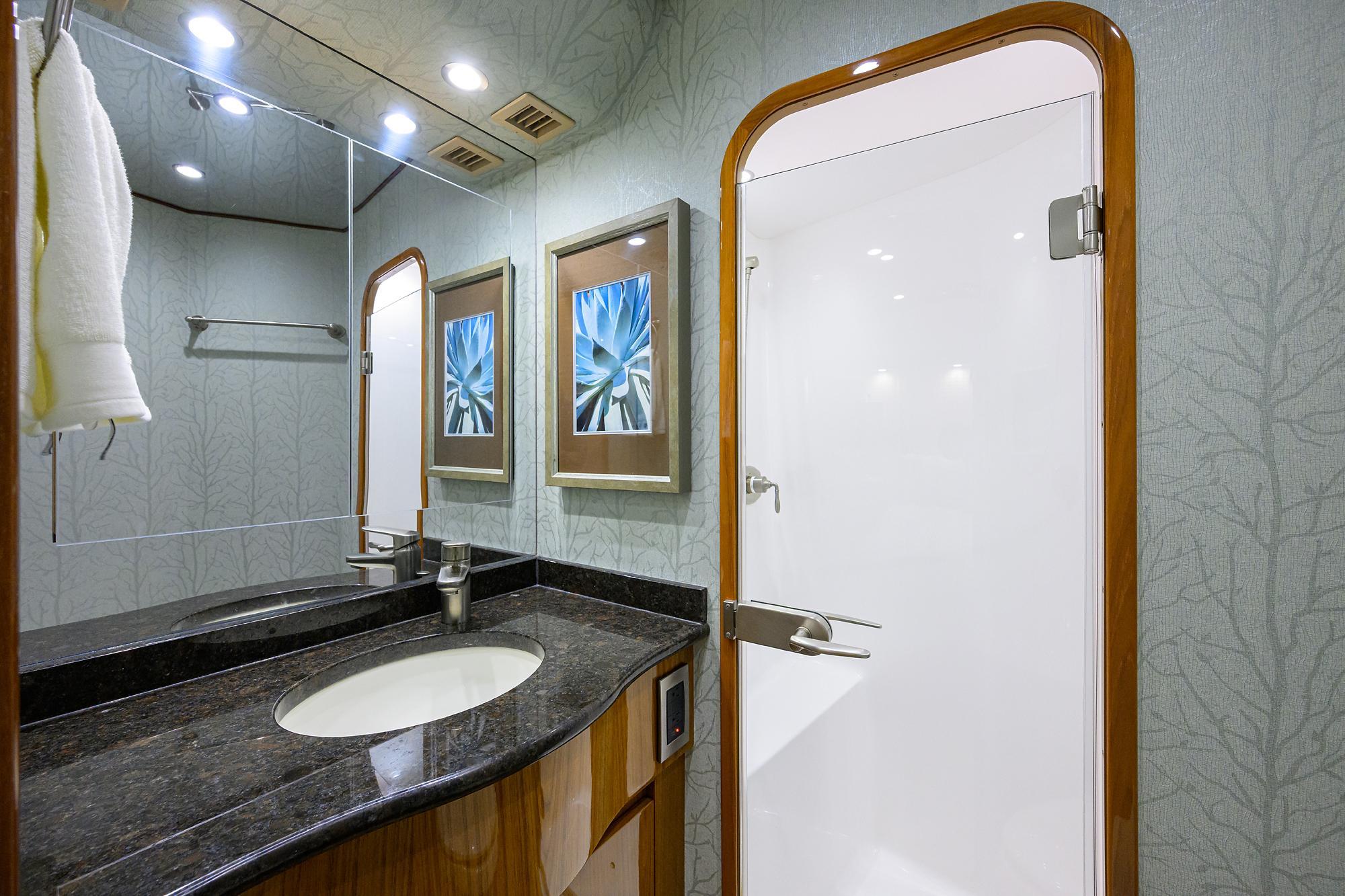 The 5 Stateroom layout conceived and executed by Viking on their 82 convertible is the envy of the industry. Highlights include a full beam master suite aft, a centerline queen berth forward; (2) guest suites amidship (port has queen berth; starboard has twin lower berths) and an upper and lower berth cabin to port. Each suite features a private head with stall shower, and each stateroom has a TV. All the head ceilings are mirrored. The vanities are granite, liberal use of custom flooring, wall coverings, and teak trim is evident in this totally upgraded interior.