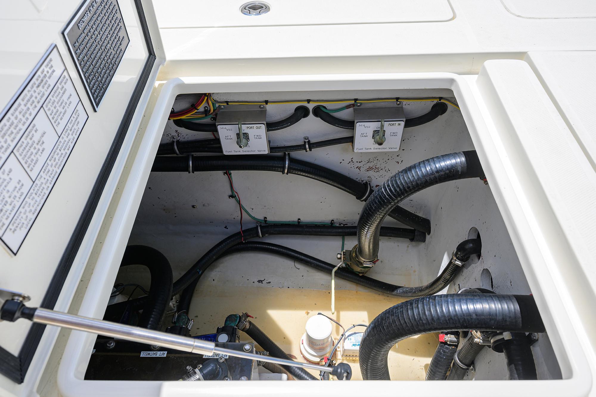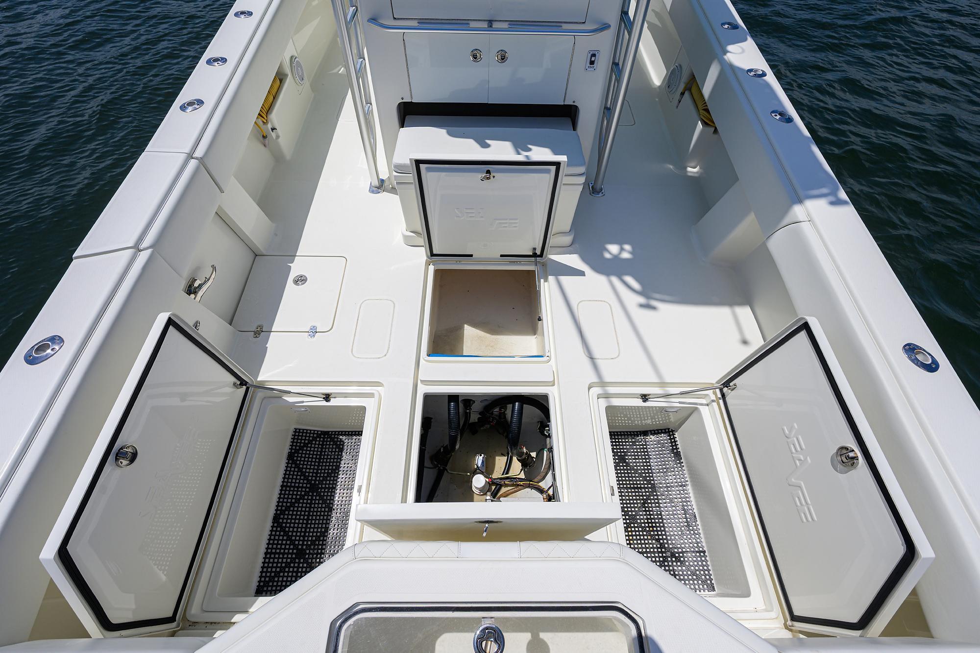 Very large in deck storage fish box and two andtwo large storage boxes forward of the console