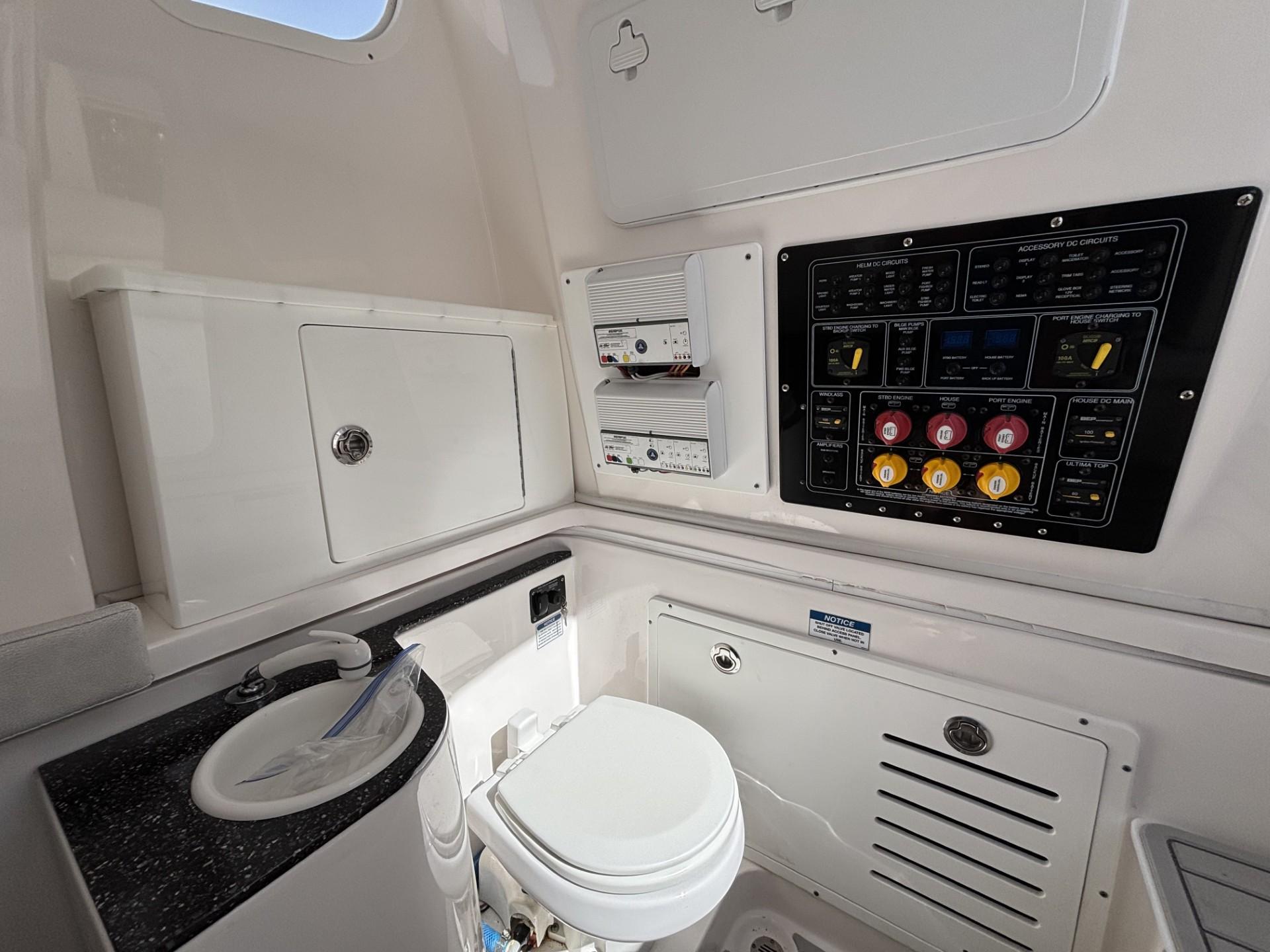 - Console - electric toilet w/12-gallon holding tank with overboard waste discharge, sink w/shower head, Corian countertop, net storage, rod storage under cushion & sleeping quarters