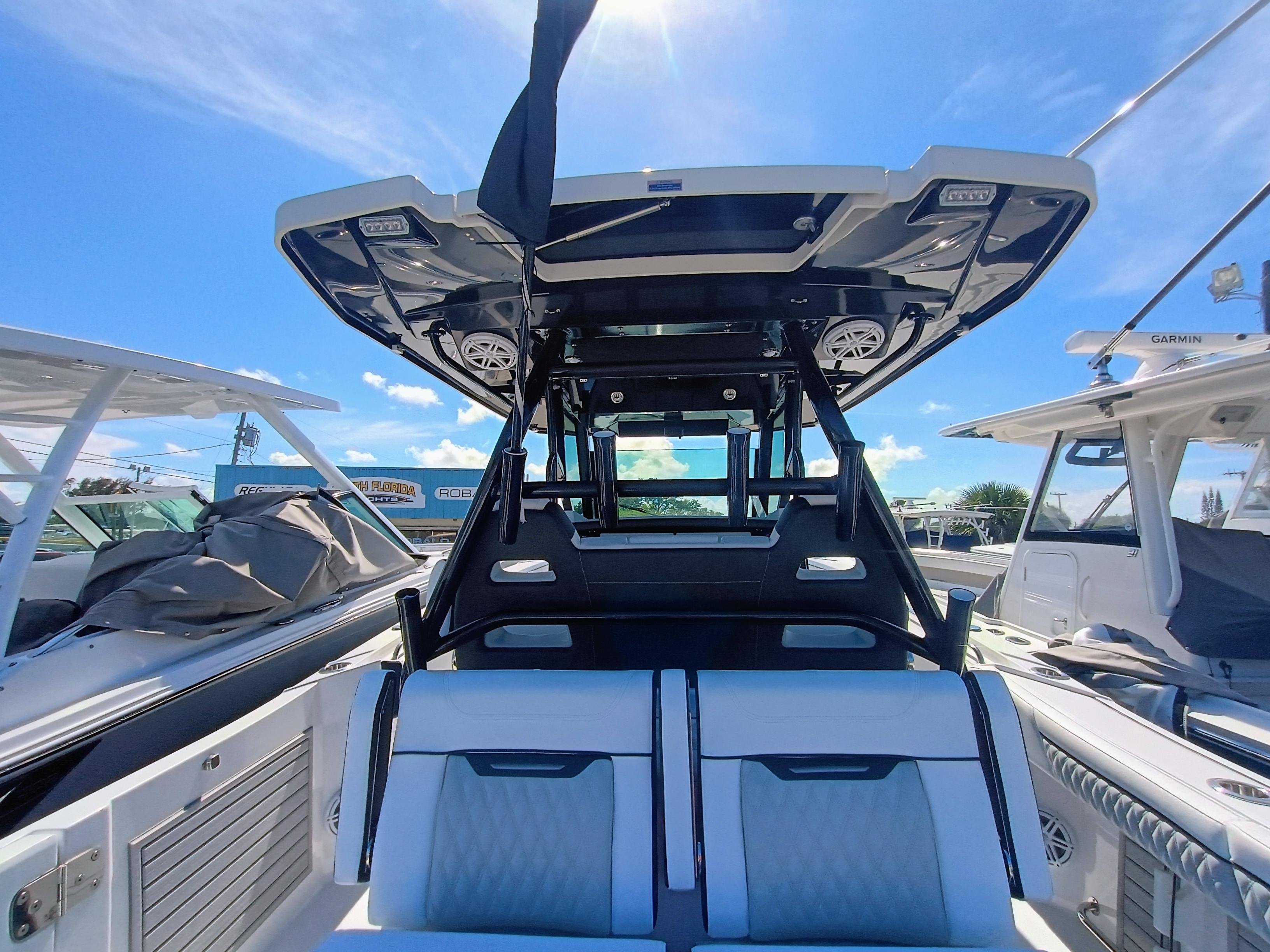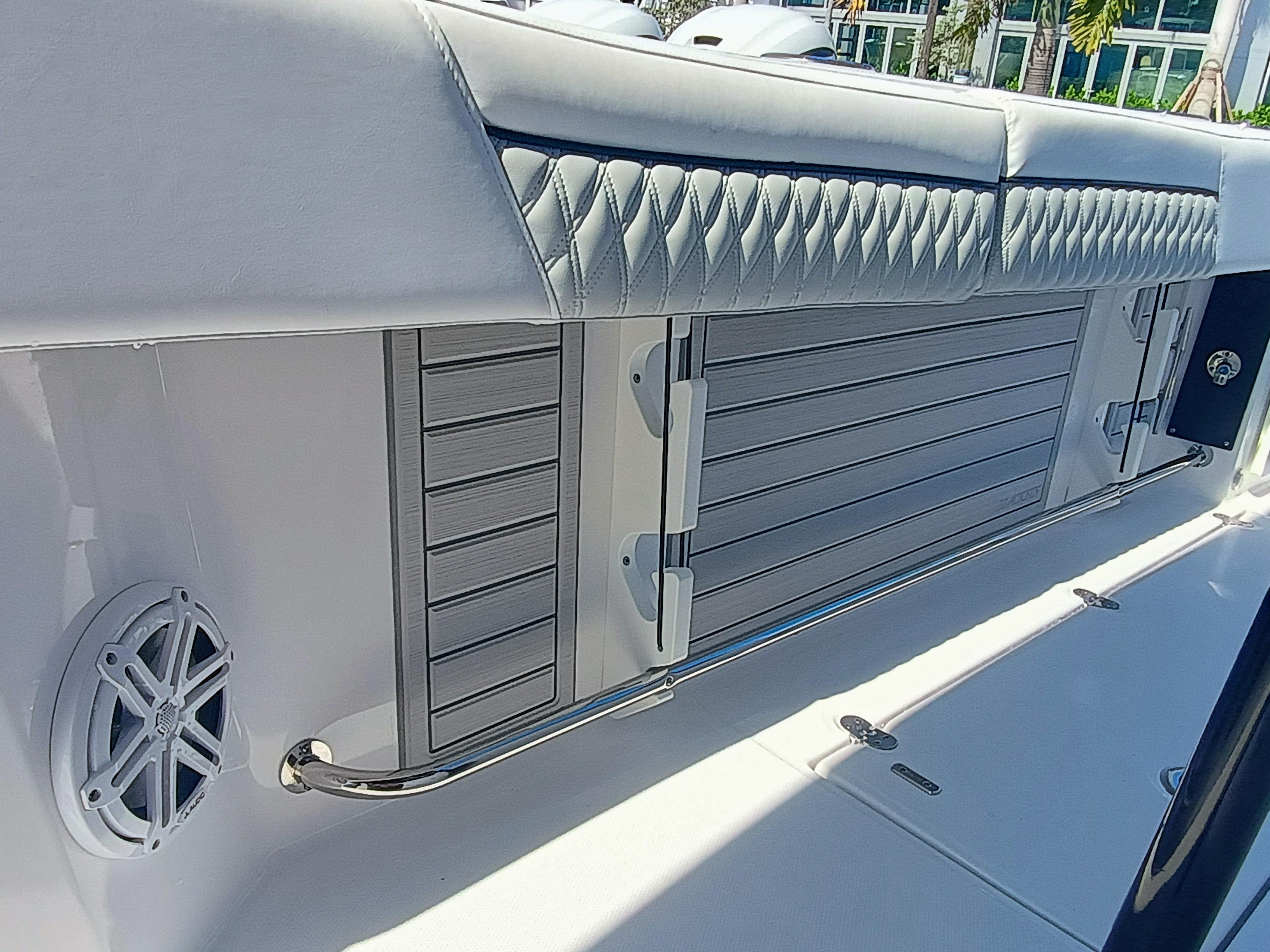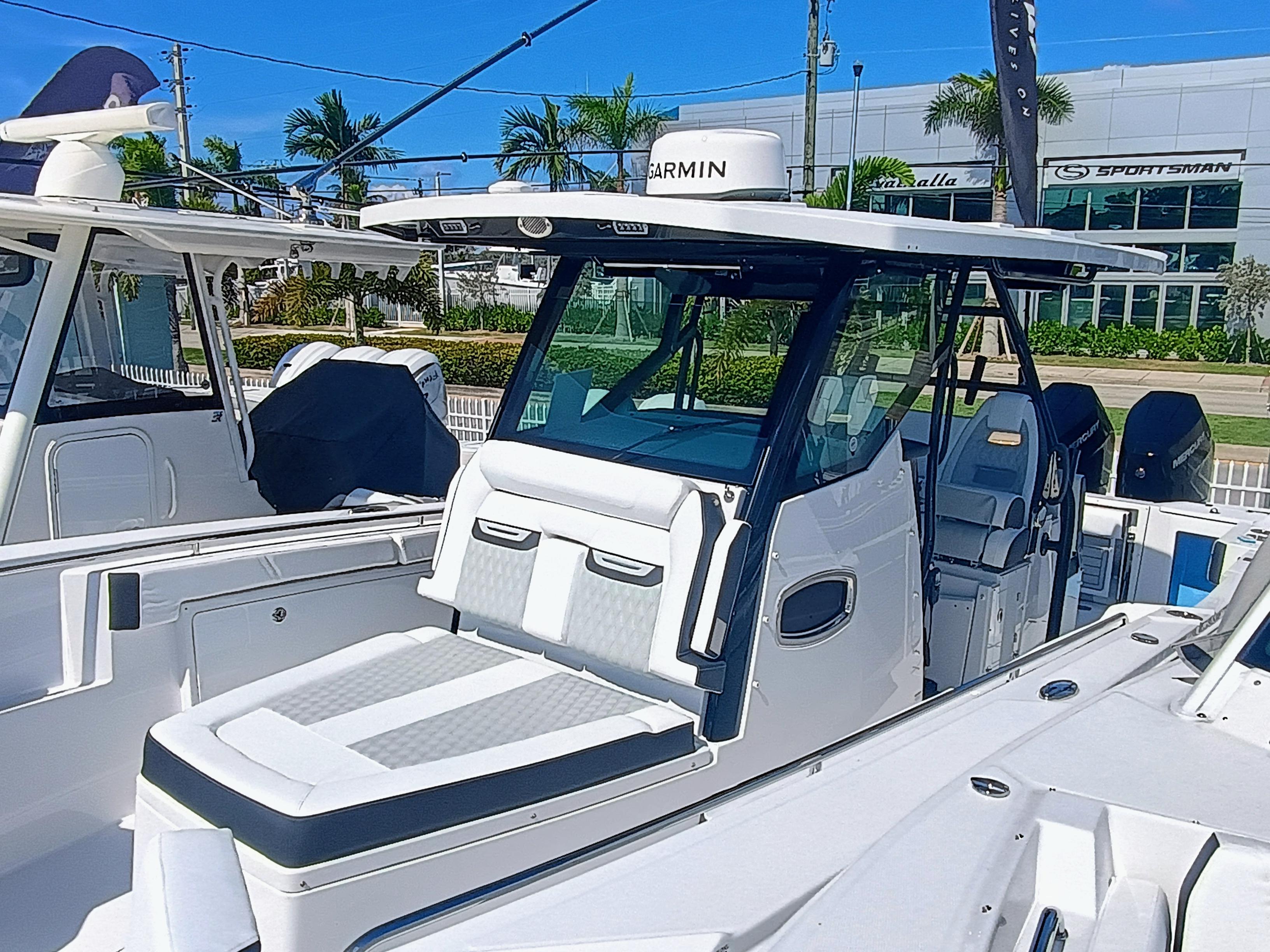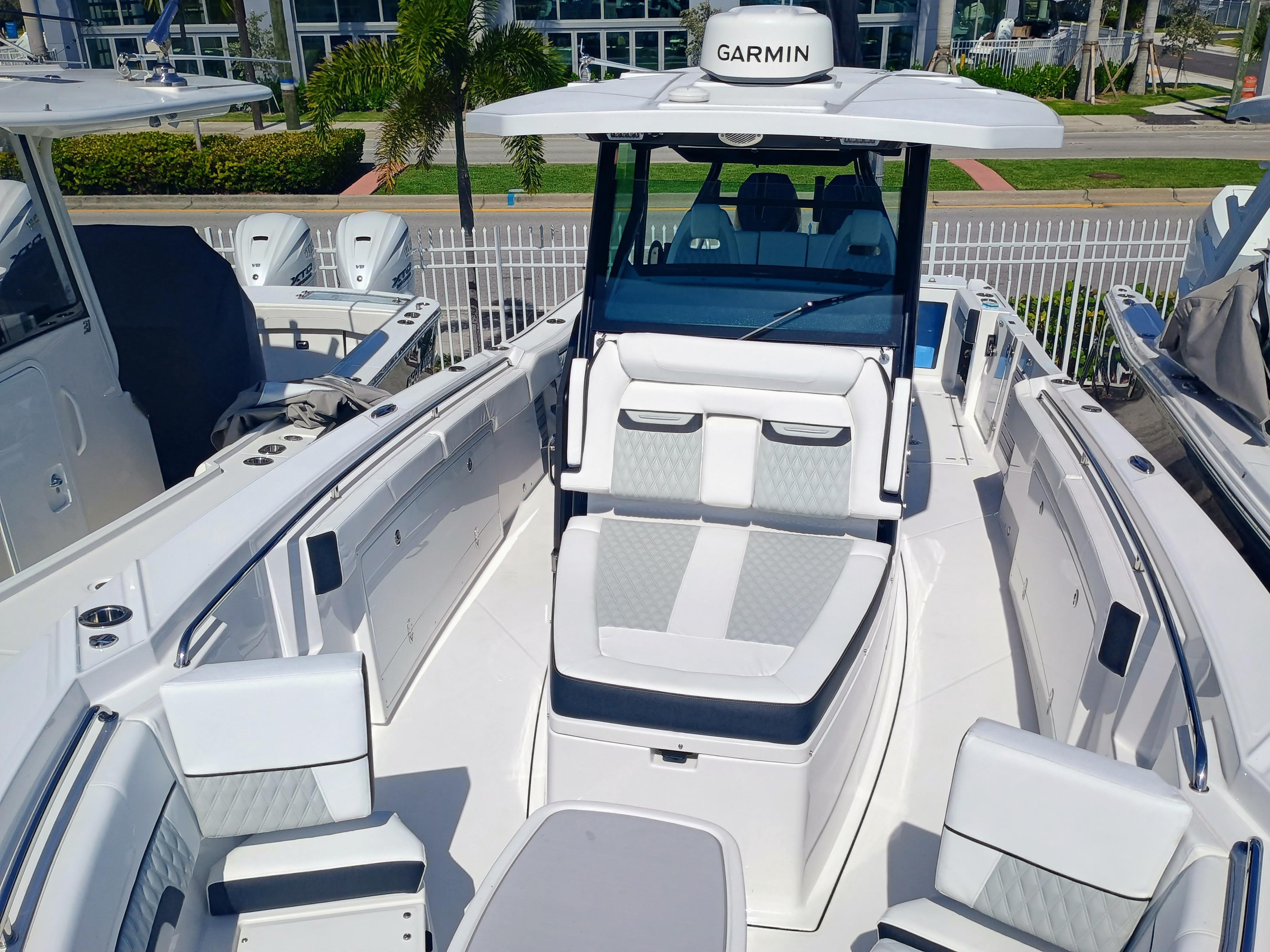 Winner of a Miami Innovation Award, the 332CC is proven innovational design at its best. Enjoy an abundance of perfectly designed fishing amenities like a tackle rigging station, insulated baitwells, and in-floor fish boxes as well as modern conveniences such as integrated storage, custom seating, dive/boarding door, telescoping, and recessed swim ladder, and full-size head compartment with Pantographic door. Meanwhile, captains will appreciate the leaning post with a custom helm seat, flip-up bolster, and command center.Engine: BLACK Mercury Twin 400XXL V10 Verado DTS JPO 800HP BLACK NoneHard Top Underside Color Scheme: Onyx Black #1Colors: Onyx Black Sheer Stripe · Onyx Black Hull · Onyx Black Boot Stripe · Onyx Black Hard Top Underside · Arctic White BottomUpholstery Options· Feather UpholsteryHull & Deck· Black Powder-Coated Aluminum Framework For Fiberglass Hardtop System· Swim Platform Inlay - Sea Dek· Underwater Lights, RGB LEDCockpit· Dive Ladder for Side Door· Leaning Post, Aft Facing Seat - (In Lieu of Bait Prep Station)Canvas· Aft Shade-Gray· Bow Shade for Hardtop-Gray· Console Cover-Gray· Forward Console Lounge Cover-Gray· Helm Seat Cover-Gray· Aft Facing Seat Cover (Aft Facing Seat Option Req)-Gray Garmin Electronics Package· Dual GPS/Chartplotter - 8616, 315VHF B175 Transducer· Radar-GMR 18xHD Radome (Requires Electronics Package)Waste Systems· Macerator w/Overboard Discharge