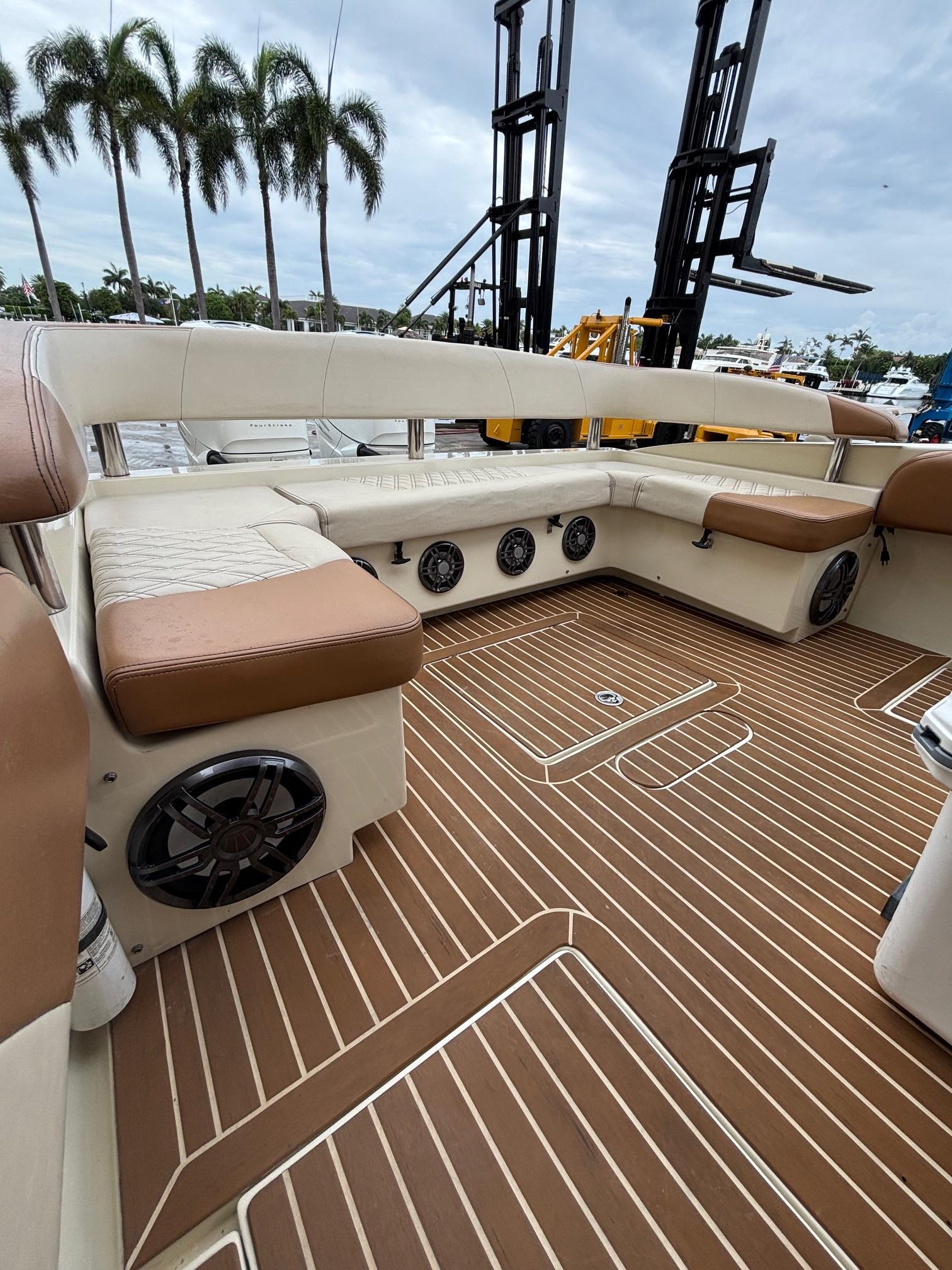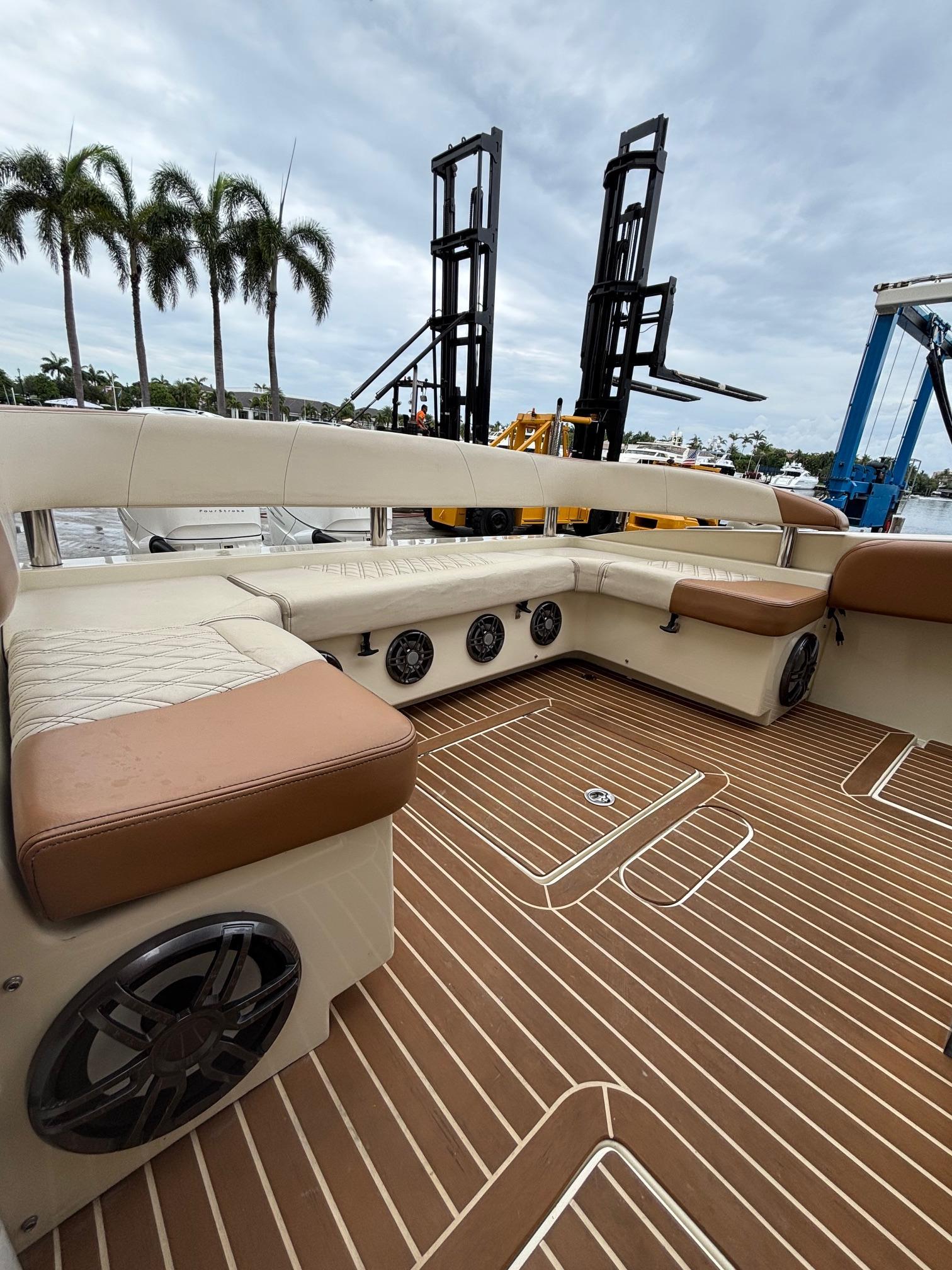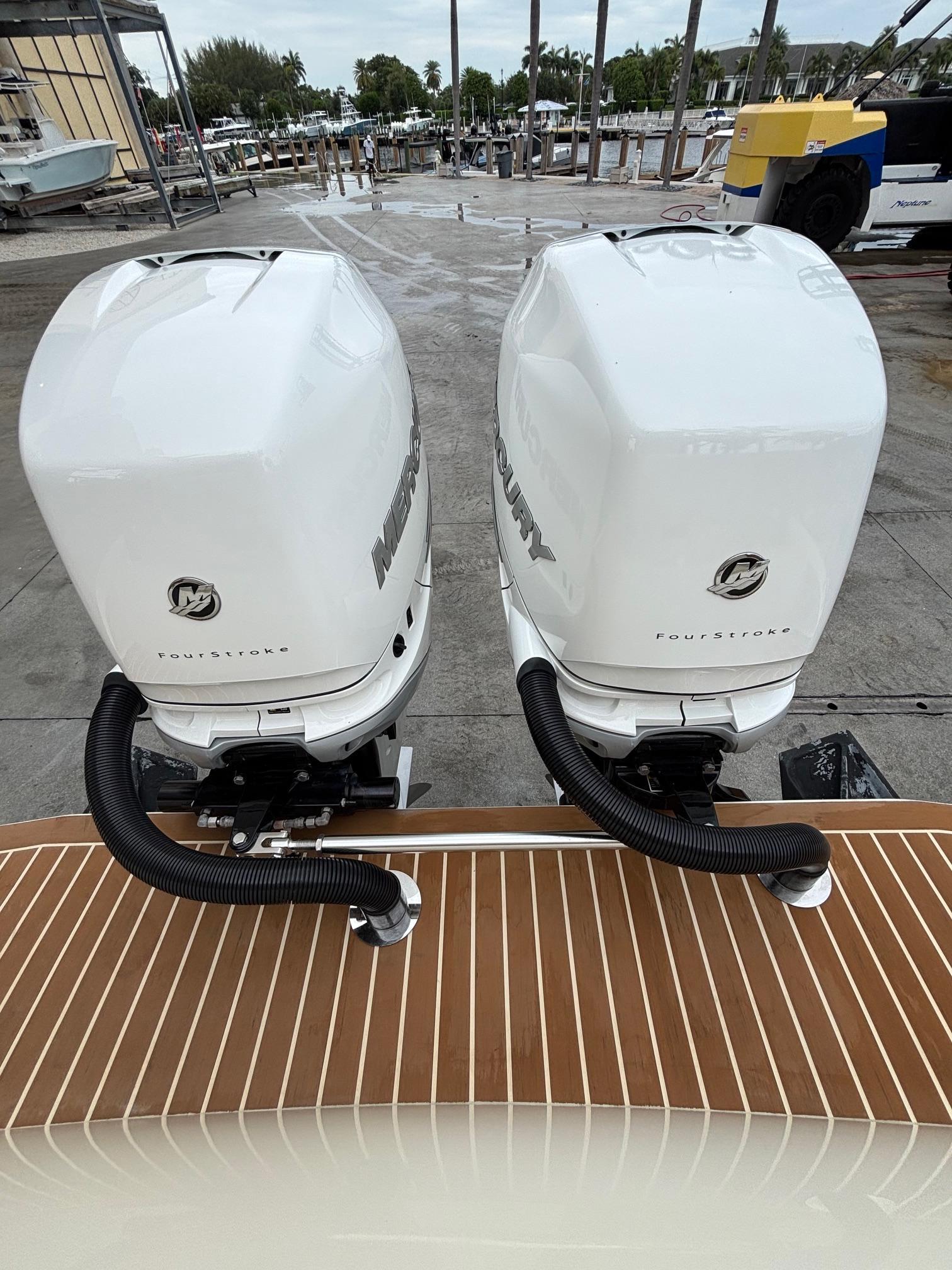 2013 Statement 35 Center ConsoleThe 2013 Statement 35 Center Console (also known as the Statement 350) is a high-performance, custom-built powerboat designed for both luxury cruising and offshore performance. It features a twin-stepped, 24-degree deep-V hull, providing a smooth and stable ride even in challenging conditions Repowered with twin Mercury 400’s with approximately 100 hoursSpecificationsLength Overall (LOA): 35 ft (10.67 m)Beam: 10 ft (3.05 m)Draft: 2 ft (0.61 m)Dry Weight: 9,126 lbs (4,139 kg)Fuel Capacity: 257 gallons (973 liters)Fresh Water Capacity: 40 gallons (151 liters)Bridge Clearance: 9 ft (2.74 m)Deadrise at Transom: 24°Engine & PerformanceEngine Manufacturer: MercuryEngine Model: 400 MercuryEngine Type: OutboardPropeller: Stainless steel, 3-bladeEngine Hours: Approximately 100hours Standard FeaturesDeck & CockpitSelf-bailing cockpit with integrated scupper systemNonskid deck and gunwalesObstruction-free "walking transom" swim platformAll stainless-steel hardwareFive pull-up cleats (1 forward, 2 midships, 2 aft)Low-profile, recessed stainless bow railFull cockpit wraparound coaming bolstersConsoleLeather-wrapped stainless steel steering wheel1/2” acrylic wraparound windshieldStainless steel cup holdersGrab handleLarge forward entry to head compartmentHard top with heavy-duty welded aluminum and oversized tubingFully-finished fiberglass top with radio boxFull digital switching and instrumentationLarge electronics mounting areaIn-dash latching storage compartmentHead Compartment6’5” headroomMarine headFreshwater sink with pull-out faucetConsole access panelSeatingSport bench seat with integrated backrest aftWraparound bow seating with storage beneathForward console seating with backrestFiberglass helm seat module with integrated cooler storage beneath aft-facing seatStorageOverboard-draining, recessed bow anchor locker with ample storage for rope and chainPort and starboard recessed dock line lockers in forward gunnelsTwin insulated 202-quart fish boxes with macerator pumps aft642-quart insulated forward fish boxElectricalHeavy-duty marine batteries and traysBattery switches with circuit breakersDual, high-volume automatic bilge pumpsIntegrated LED navigation lightsLED lighting (forward and aft spreader lights, overhead courtesy lights, cockpit courtesy lights)Electric, recessed horns with stainless grillesMechanicalStainless steel high-performance propellersFull hydraulic steeringMercury Racing K-Plane trim tabs with actuators