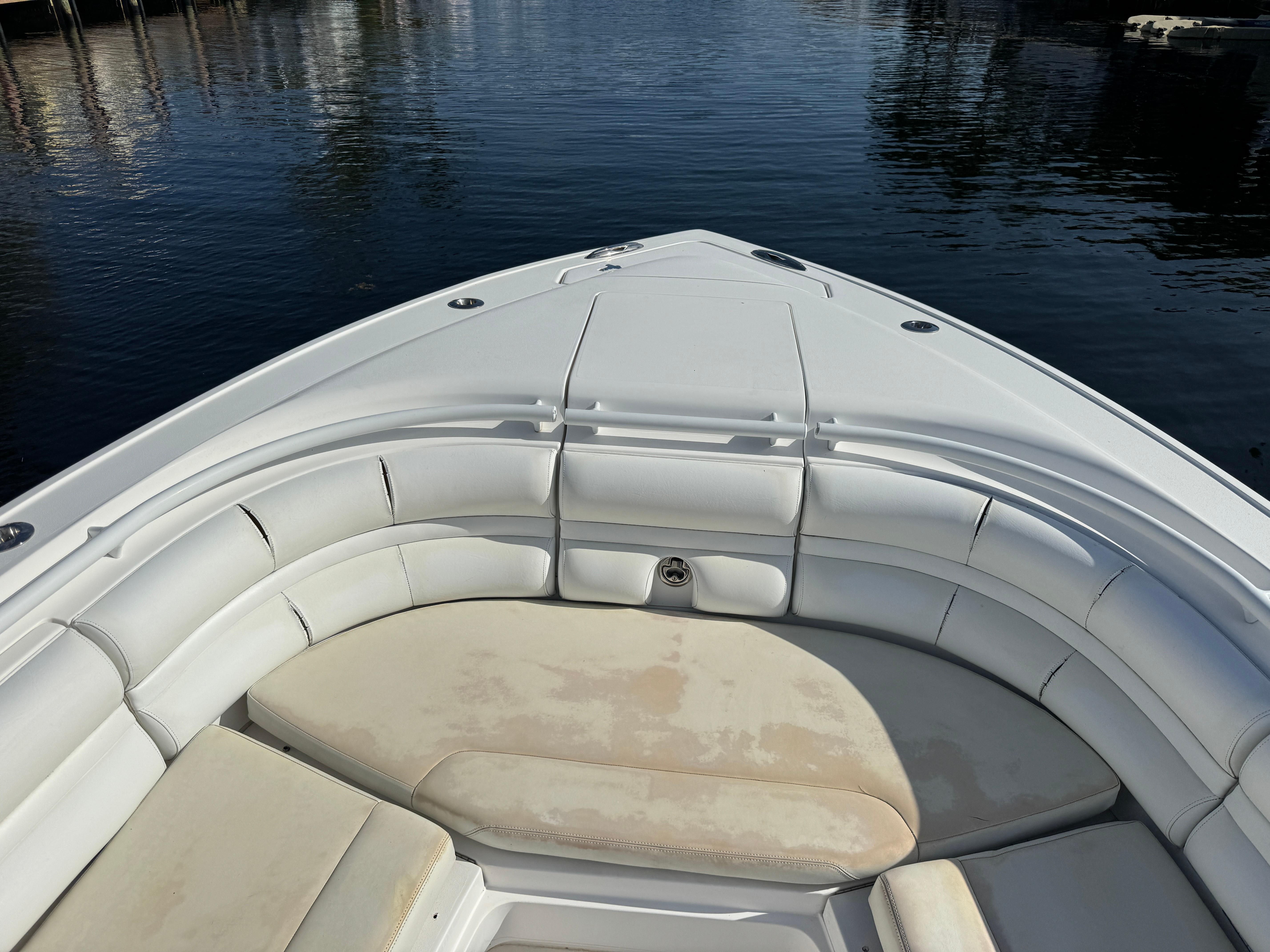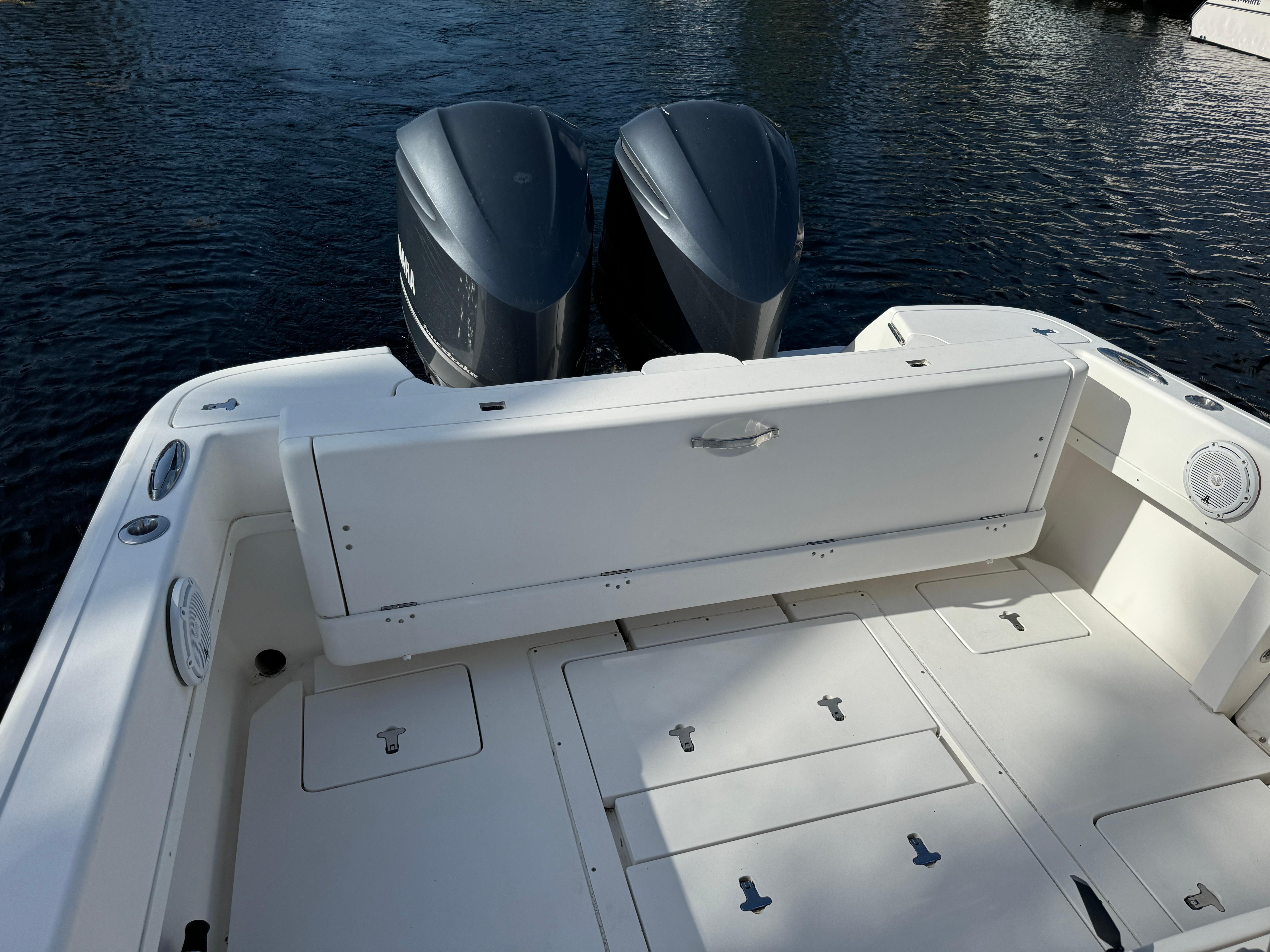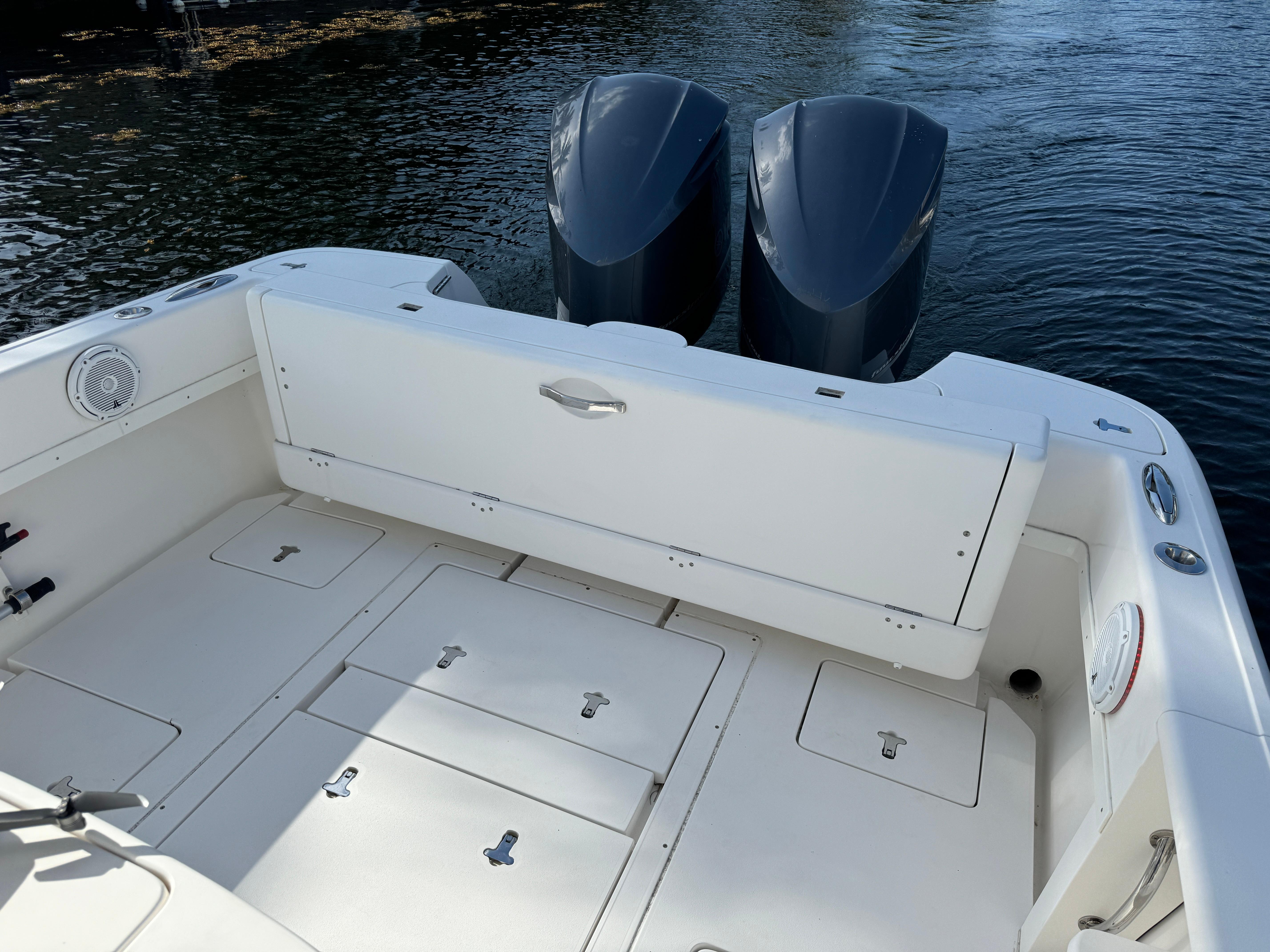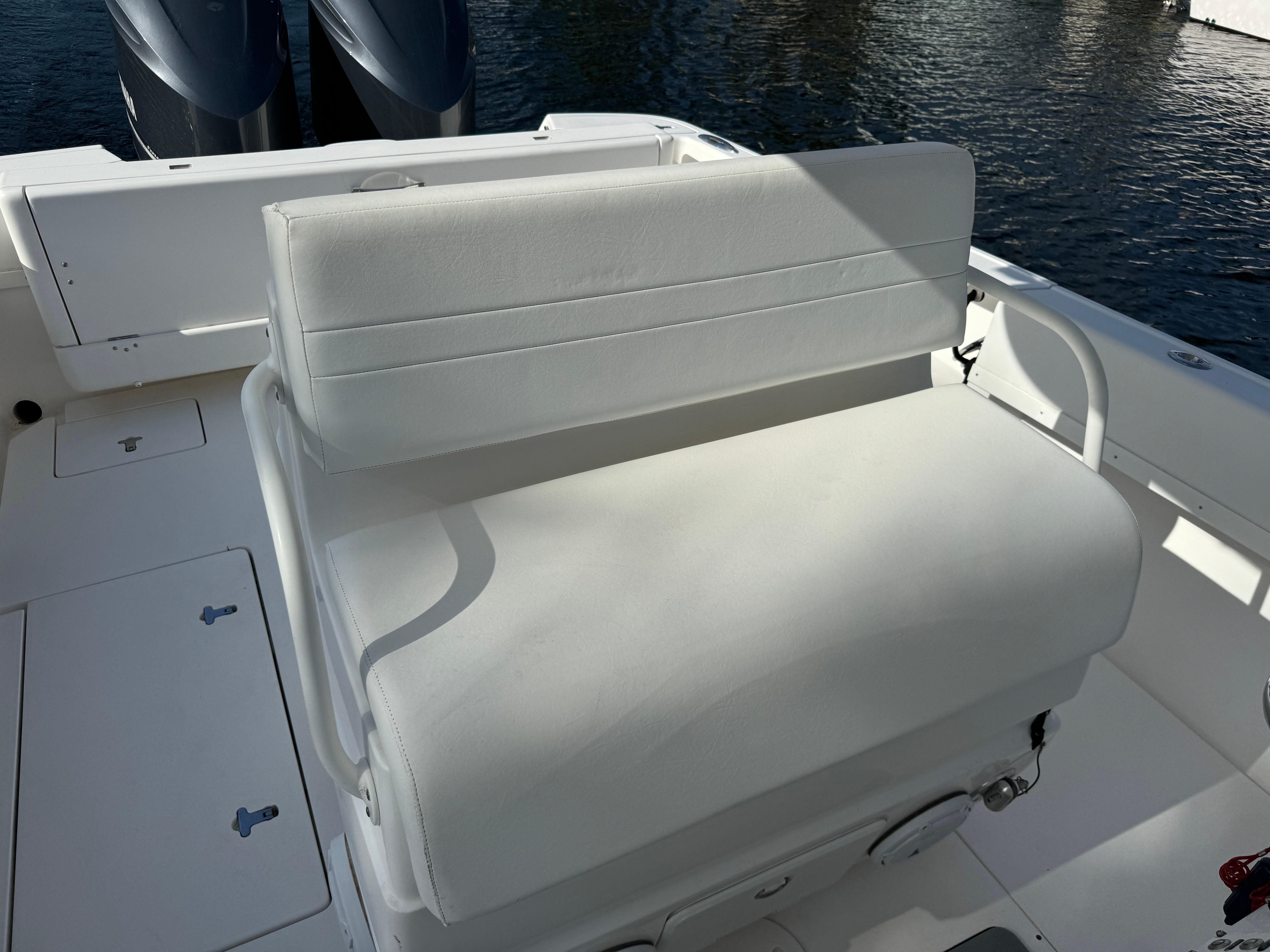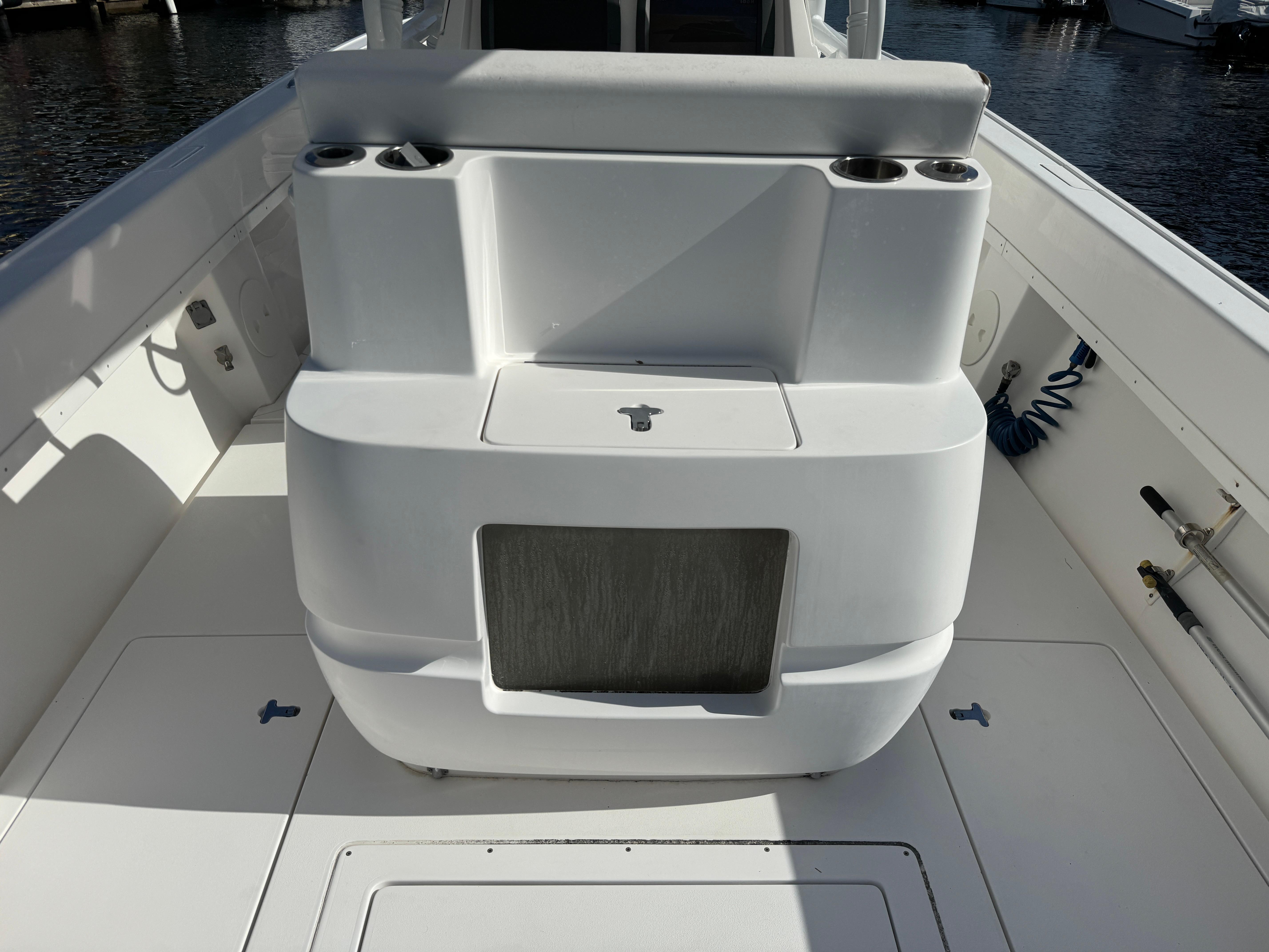 Expansive freeboard tops stylish new sheer and tumblehome transom lines. Signature Intrepid comforts include a spacious head and changing room hidden in the console, plush wraparound forward seating with electric backrests, and integrated or removable rear bench seating.