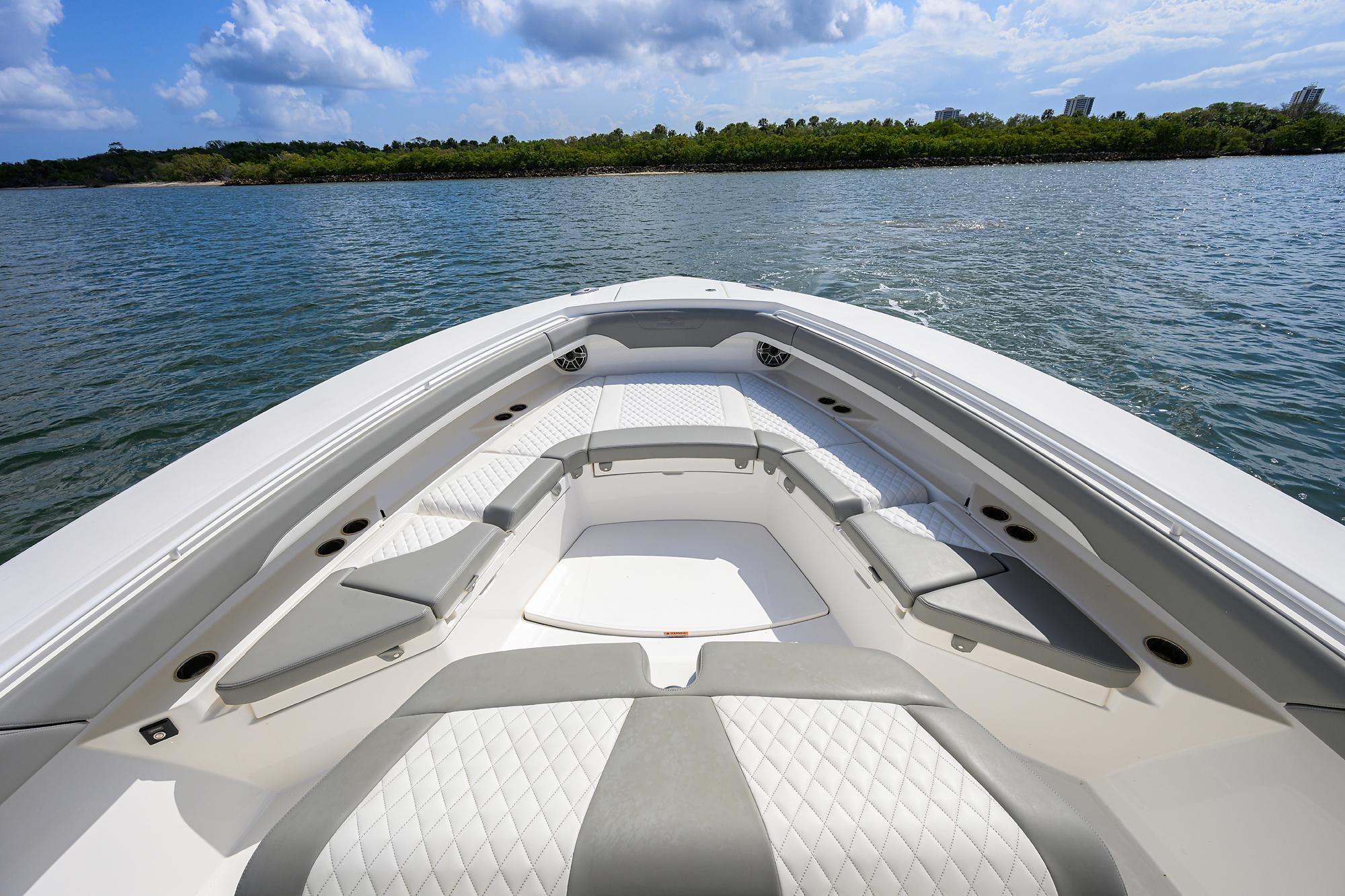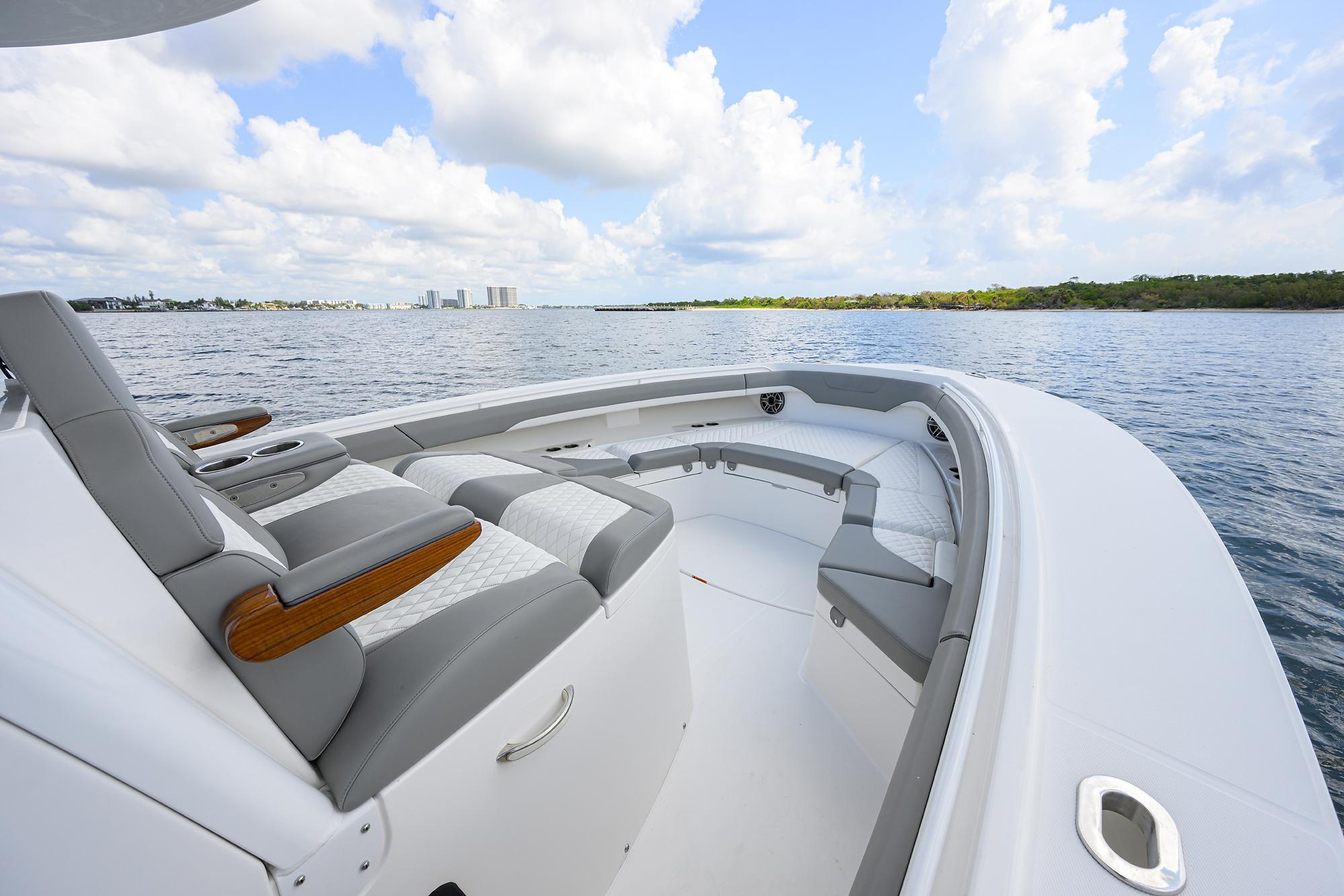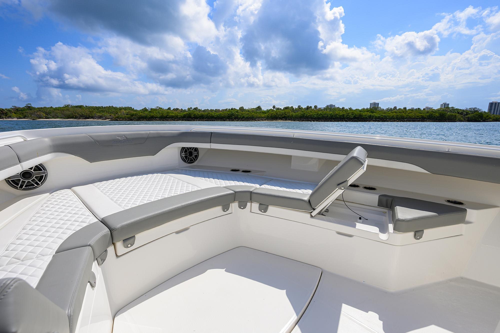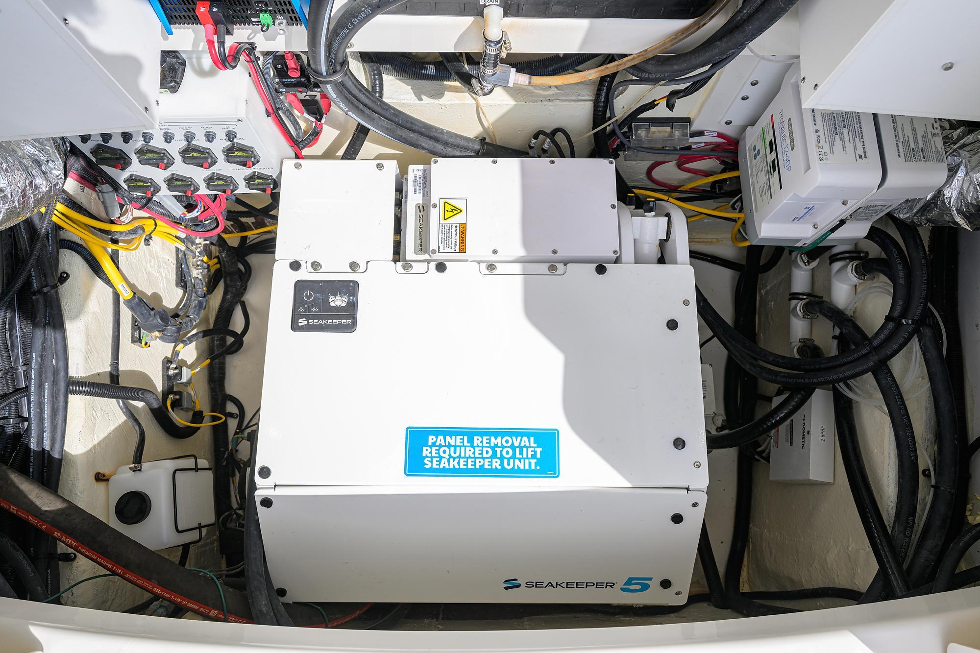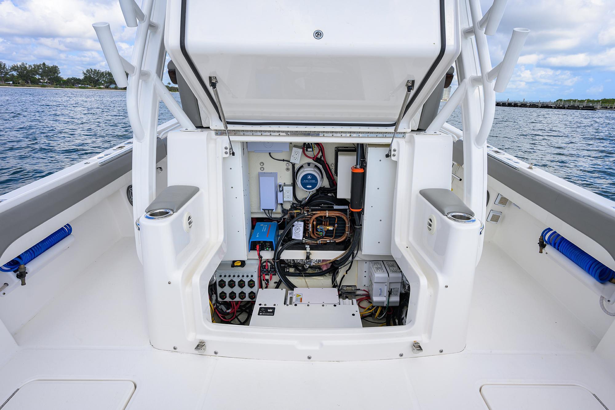 - Illuminated Pump Room Beneath Aft Bench Seat with Easy Access to Fuel Tanks, Optional Seakeeper® 5, & Other Systems, Plus Extra Storage