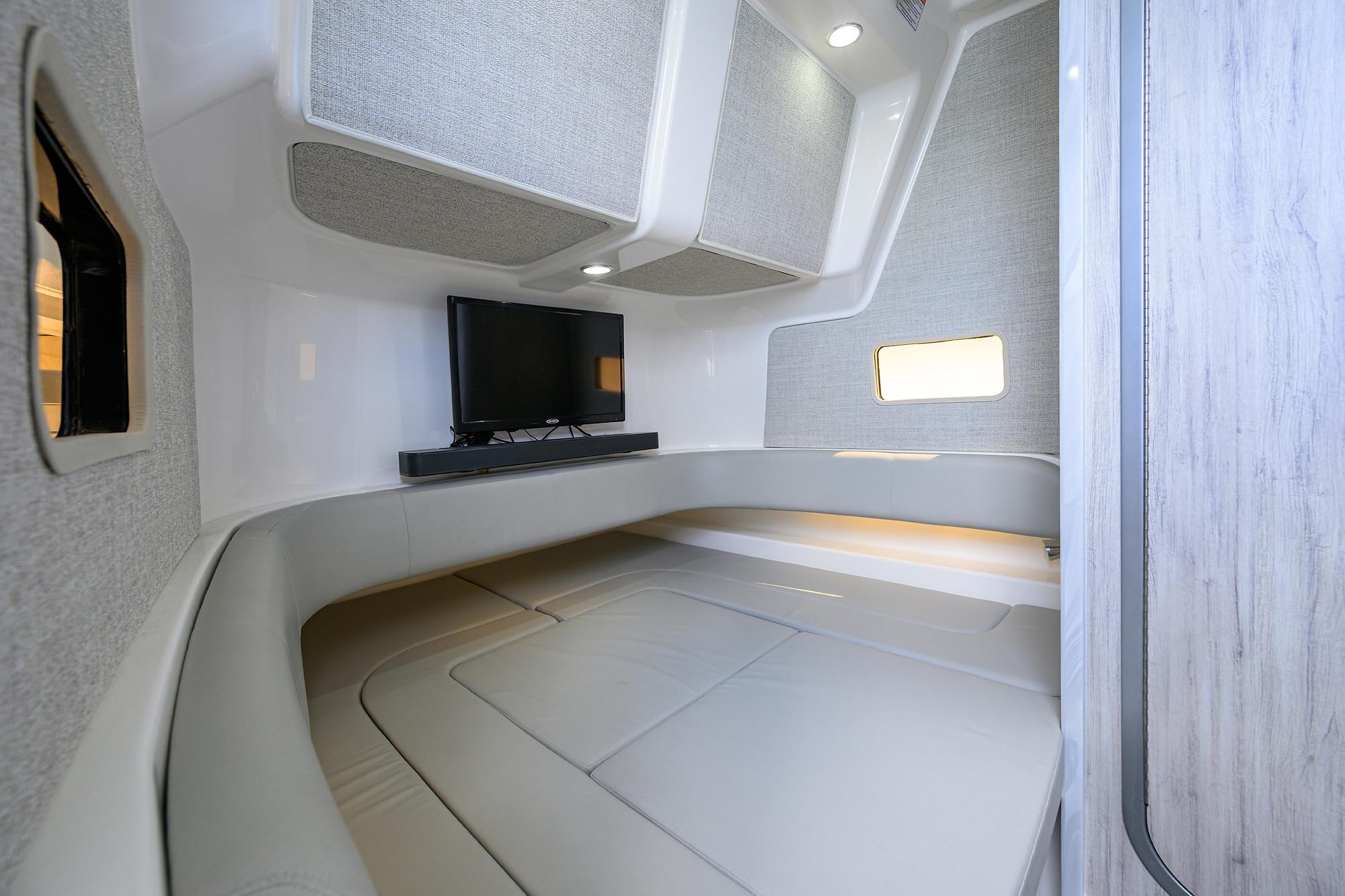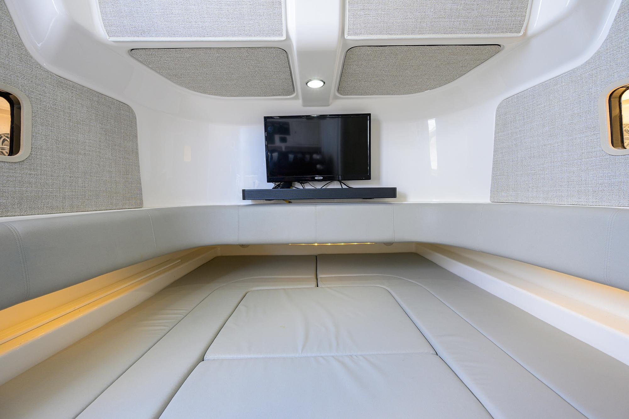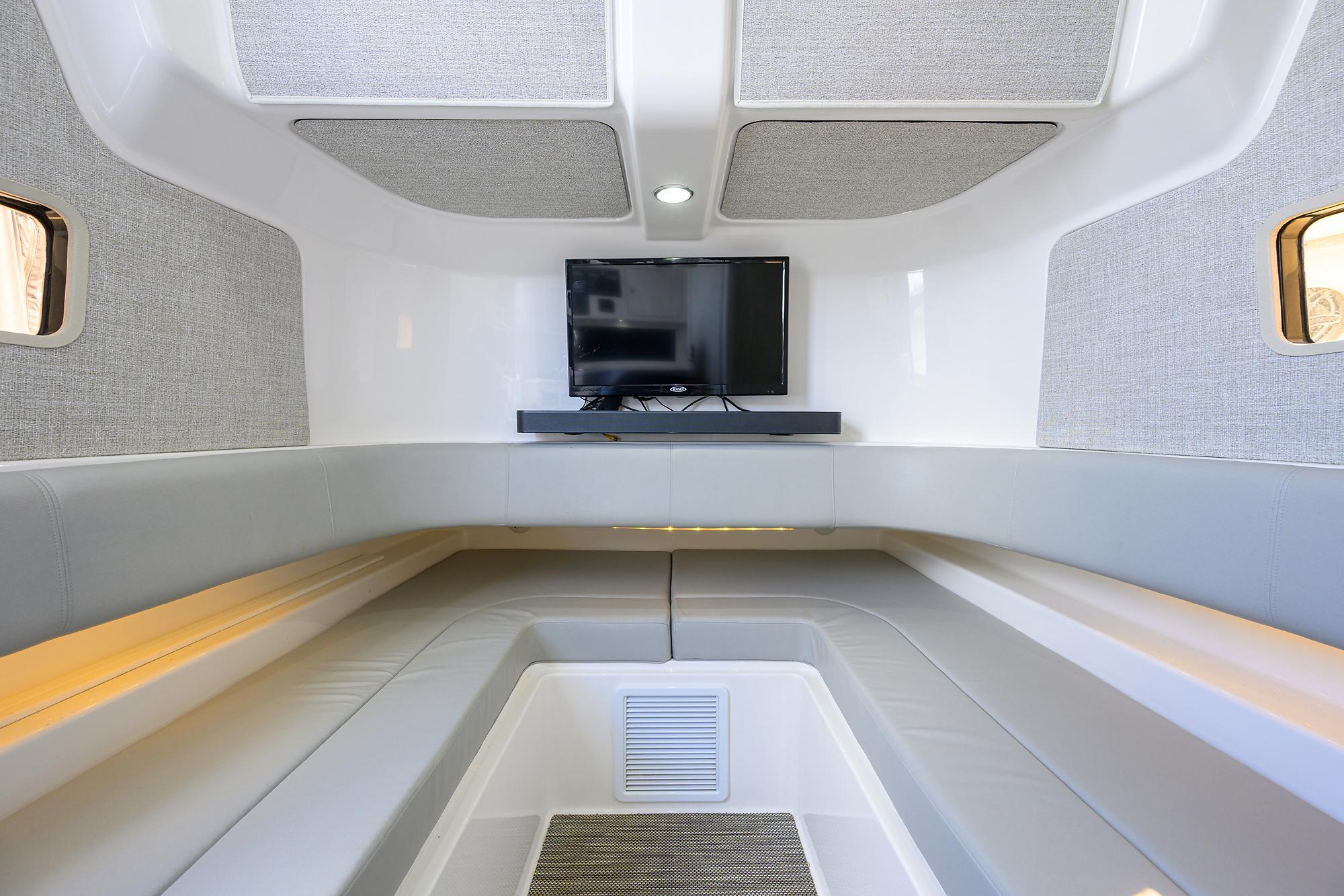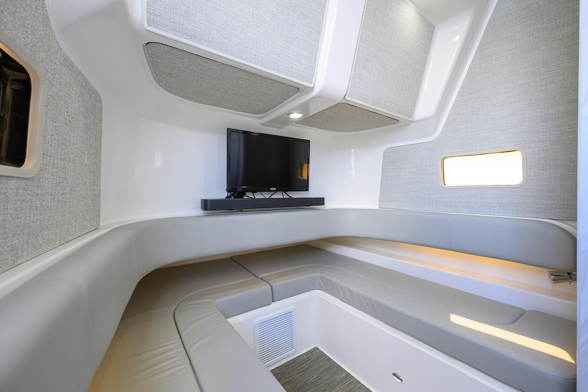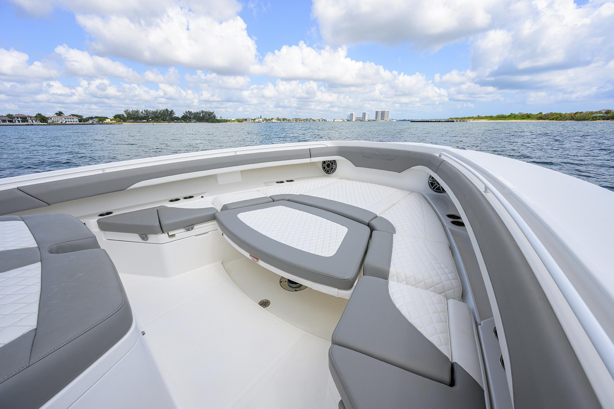 - Illuminated Pump Room Beneath Aft Bench Seat with Easy Access to Fuel Tanks, Optional Seakeeper® 5, & Other Systems, Plus Extra Storage