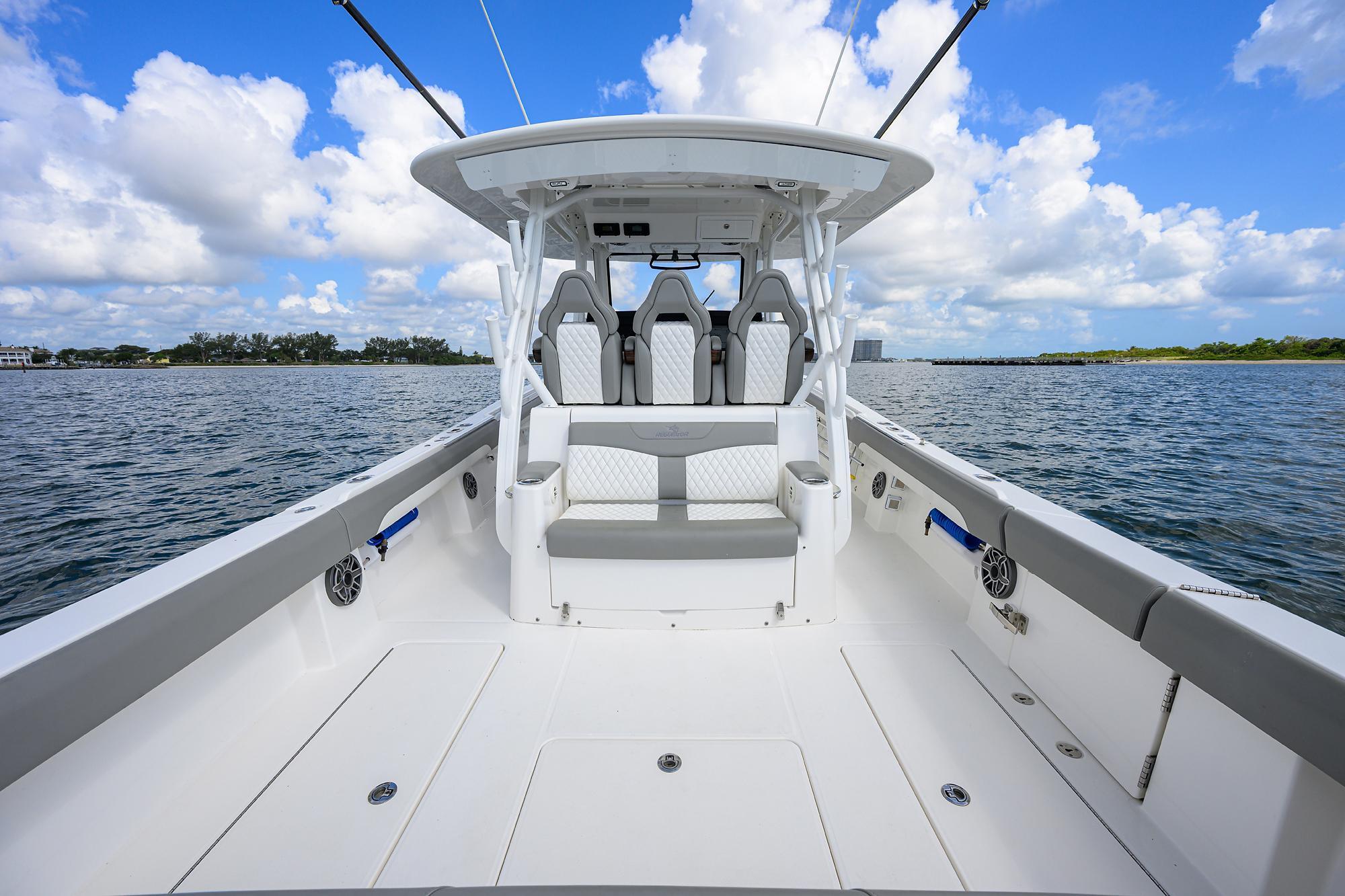 - Regulator E-Series Seating & Tackle Center: Features Raised-Deck, Triple Helm Seating with Armrests, Flip-Up Bolsters, and Individual Folding Footrests with SoftGrip Foot Rail – in addition to Aft-Facing Bench Seat for Two Flanked by Built-In Armrests with Cup Holder Rod Holders, Tackle Storage, 6 Rocket Launchers Built into Aft Support Frame, and Pump Room with Fuel Tank Access