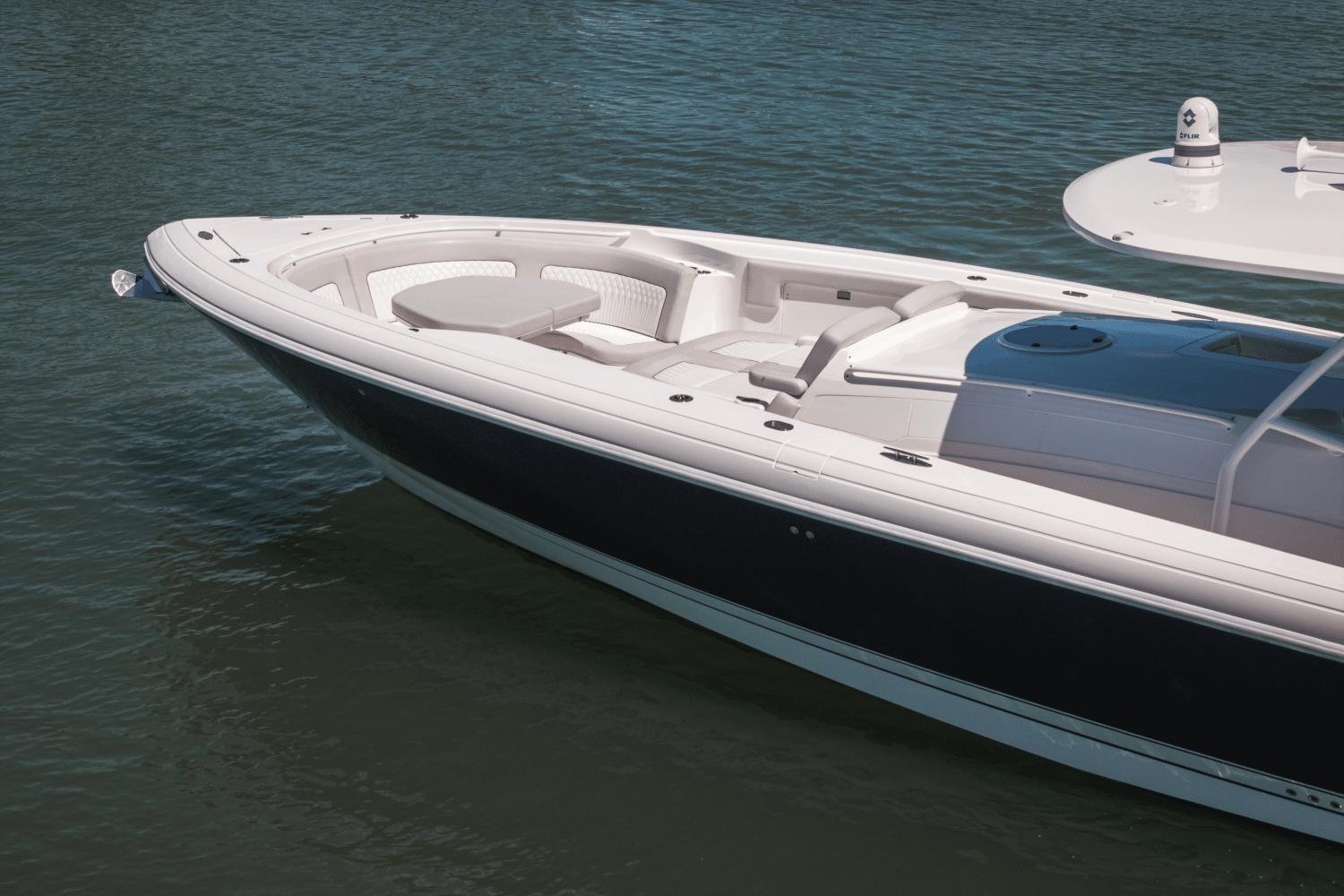 Ergonomically arranged, the helm features a custom Intrepid-branded stainless-steel wheel, Mercury DTS throttle and joystick controls, and Bow Thruster for confident docking and low-speed handling. An overhead Garmin open-array radar, FLIR thermal imaging, and high-performance stereo system controls add even more functionality and comfort to the helm experience.