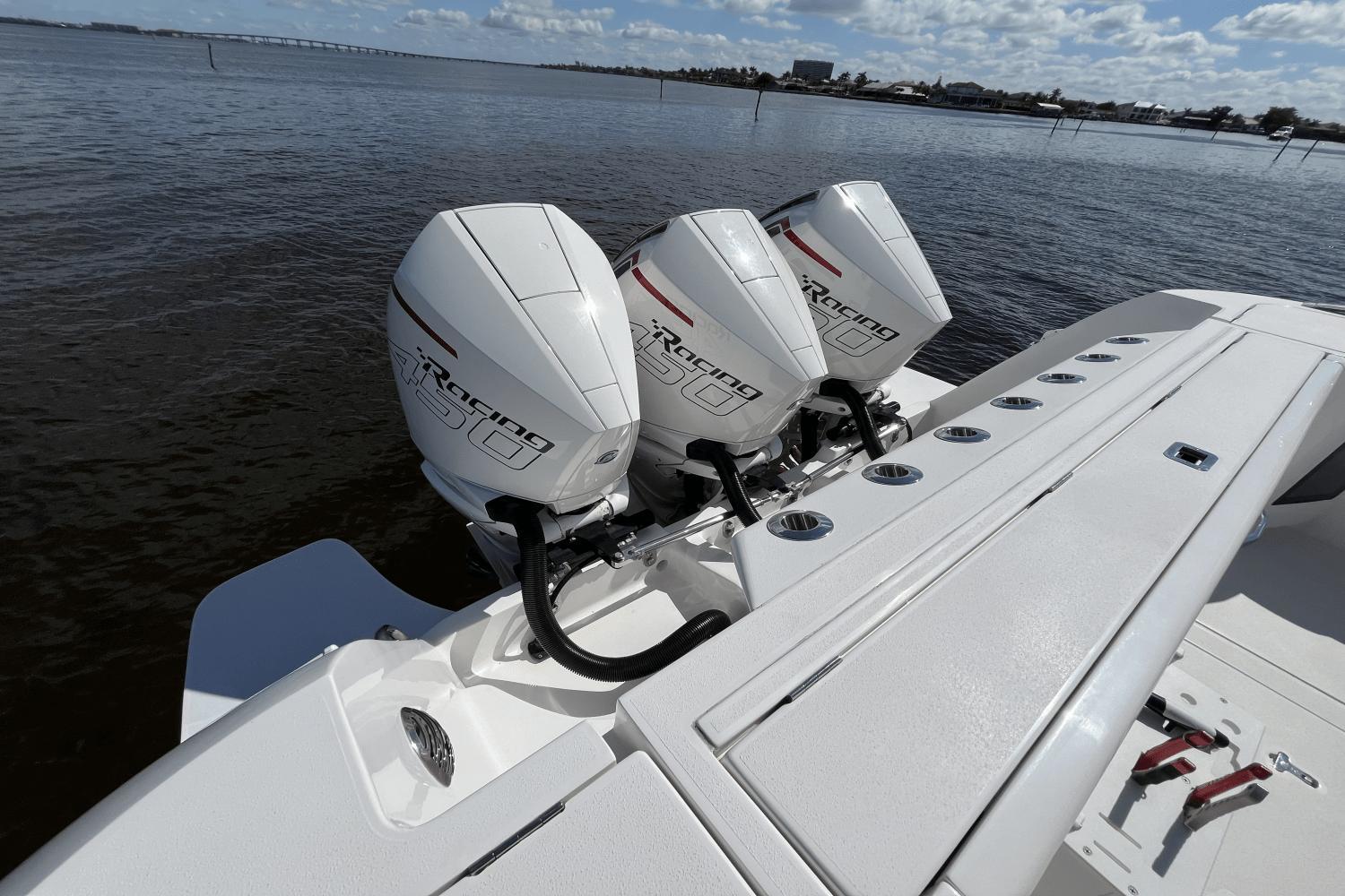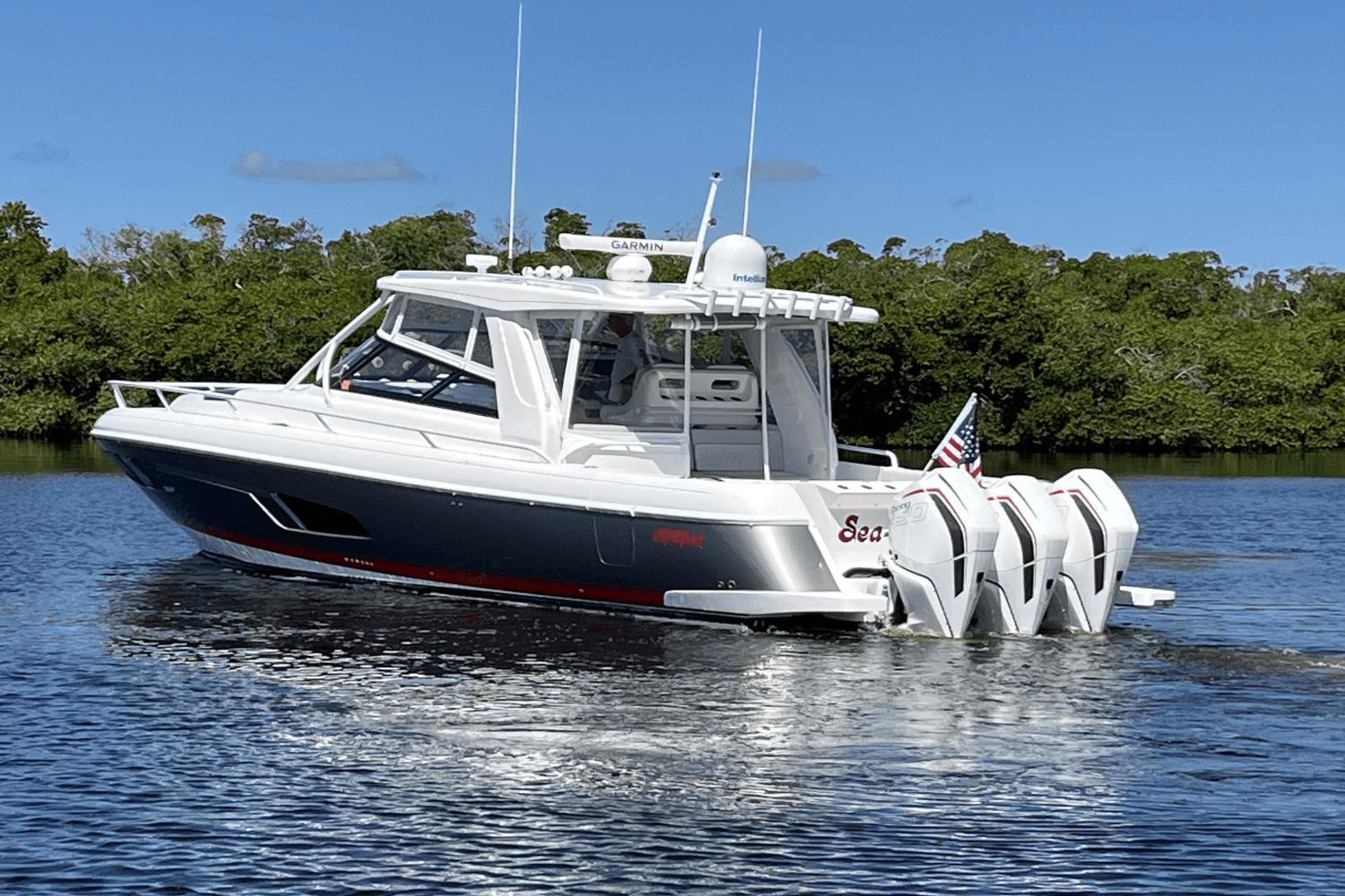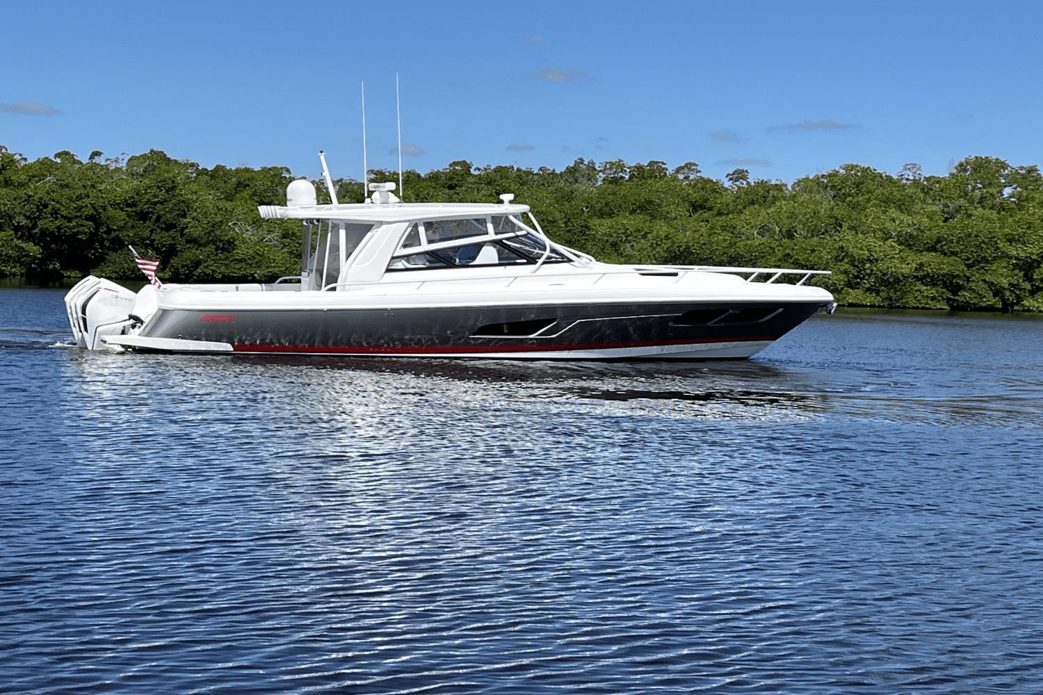 This Gorgeous 438 Evolution is very well optioned is exceptionally clean and was cutom ordered/built for the original owner. Intrepid chose this 438 to use in their 438 video for You Tube, please see the video link. There are 329 hours on her 450 Racing Engines and were serviced last in October 2024. This vessel has been summer stored at River Forest in Labelle Florida in the middle of the state so she has never had any Storm Damage.Please contact the Listing Broker for your personal viewing appointment.Optional Equipment:Triple Mercury 450 Racing Engines - 329 Hours - Serviced October 2024Extended Range Fuel Tanks - 548 GallonsEngines Custom DecalsTriple Engine Automatic Flush SytstemHull side Paint Mercedes-Benz 047 Aluebeam Silver AMG ImronBoot Stripe N0759 Flaming RedUnderside of Hard Top Painted High GlossHull side dive door with swim ladderStainless steel windshield frameCustom Fiberglass arch 438Trim Tabs - Hydraulic Hi-PerformanceBigle Pumps (4) - High Water Alarm aft bilge pumpShore Power with Battery Charger2nd Shore Power Cord 30 amp with 50 foot cordBow ThrusterWindless - Stainless Steel Anchor with 300 feet of Stainless Steel ChainUpgraded Generator - Kohler 11 KWElectric Hot Water HeaterCustom Helm Seat, Dual Pedestal Electric Up/Down/Fore/AftFold Under Swim LadderCockpit Coaming BolsterElectric HeadMacerator for Holding TankAir Conditioning CabinAir Conditioning CockpitSolid Surface Counter TopWood Flooring Cabin and Bath SoleIcemakerSingle Burner StoveTransom Shower Hot and ColdFolding Rear Bench SeatFreshwater Wash Down for Anchor525 Gallon Fuel - 50 Gallon DieselCockpit Lights LED (4)Belloca Steering Wheel with Deluxe KnobRaw Water WashdownStarboard and Port Livewell with Window and LightDiamond Pattern Upholstery Upgrade for Cockpit Seating7 Rod Holders Built into Splash Well6 Rod Holders on Aft Hard Top4 Mate Series Rod Holders on Gunwale2 Led Spreader Lights Aft of Top6 Lights on Underside of Hard TopRecepticles for Electric Reels in CockpitExtra 110 Volt Electric Outlet in Cockpit AftExtra 110 Volt Electrical Outlet underneath DinetteUnder Water Lights - 2 facing aft, 2 facing down67.7 JL Audio Speakers on Underside of Hardtop Flush MountedAdded USB Outlets to Cabin and Master StateroomCustom Single Drawer Refrigerator in GalleyWatermaker - Is pickled and needs new membrane filtersTwin Garmin Screens with Chartplotter, Radar and Fish FinderGarmin Auto PilotIcom VHF RadioAigen Antenna for WiFi and Sat TvWhite Stamoid Covers for cockpit seatsWhite Stamoid Covers for front and side windshieldsWhite Stamoid Cover for aft cockpitAft Cockpit SunshadeListing Broker - Brian Kemmis 239-222-5907
