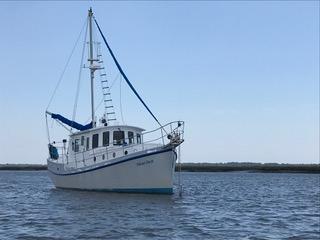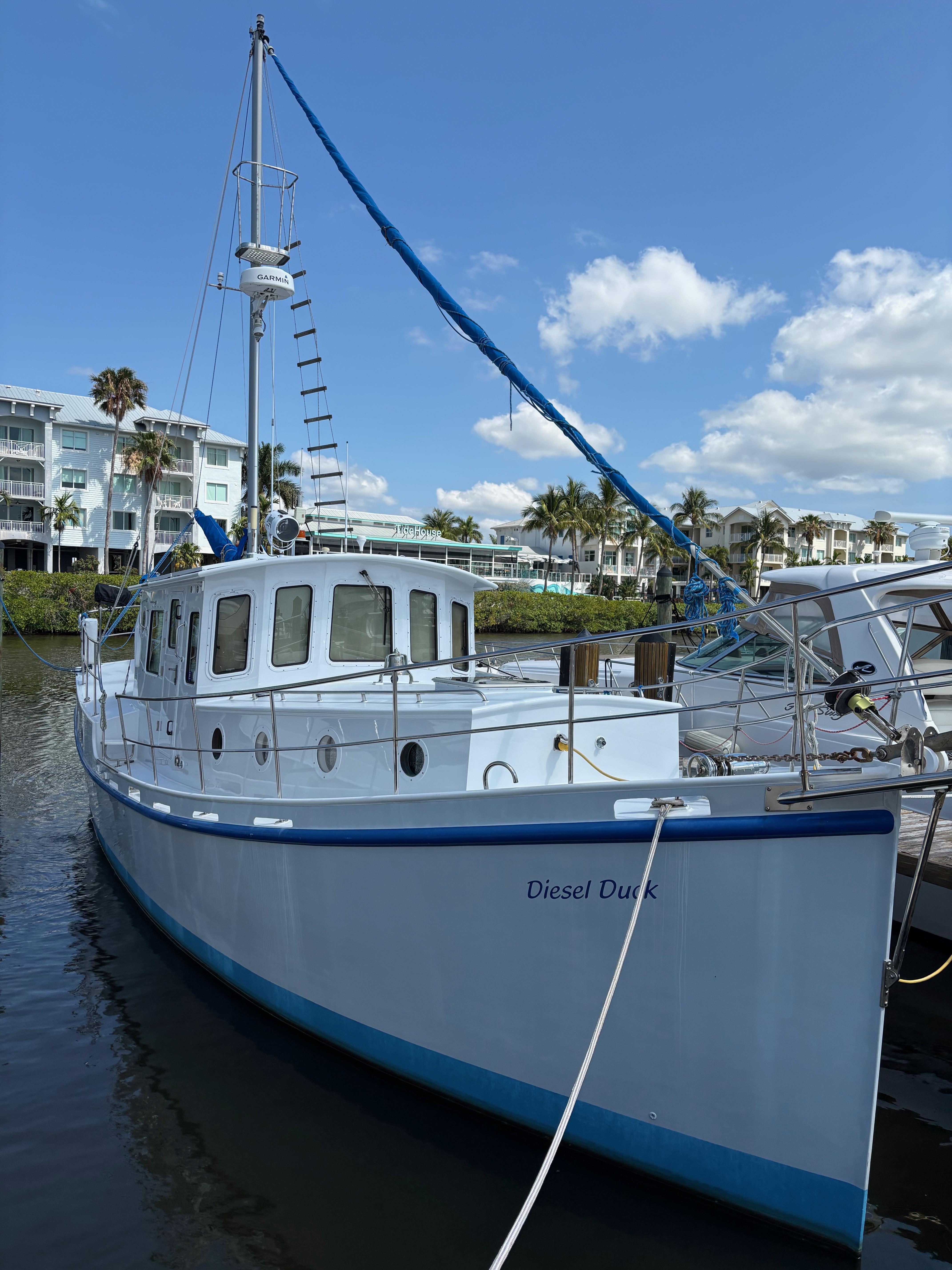 M/V Diesel Duck is the original model 41' aluminum long-range trawler with a 4'6" draft and 13' beam. Overall length is 45 feet. This special passage making fuel efficient yacht was designed by George Buehler and is a safe, stable, and easily driven sea boat for a couple or short-handed crew. She was built in aluminum by McNally Marine in Belleville, Ontario and commissioned in 2005. McNally is a highly respected commercial yard which has constructed tug boats, ferries, tour boats (including the "Maid of the Mist" in Niagara Falls), and yachts. McNally built the first three hulls of the Cape Horn Trawler series.The name Diesel Duck was registered for this vessel in 1999 when the hull was started, however, construction was not complete until 2005 when she was launched.With a cruising speed of 6.5 knots at 2200 rpm, M/V Diesel Duck consumes approximately 1.3 gal/hr with a cruising range of well over 3500 nautical miles. Max speed is approximately is 8.2 knots.The original owners lived aboard and cruised for 8 years including a circumnavigation of South America (starting in Toronto, cruising the Caribbean, transiting the Panama Canal, and returning to the US East Coast). The current owner, only the 2nd, has cruised her on the Eastern Seaboard and Bahamas for the last 12 years and has continued her meticulous maintenance and upgrades.M/V Diesel Duck is one of the featured vessels in the latest edition of "Voyaging Under Power" by Capt. Beebe and revised by Dennis Umstot.A quote from George Buehler to the current owner in an email dated 2014: " You have one of the nicest of the DUCKS. I think it is a good size too. It's all a couple needs."