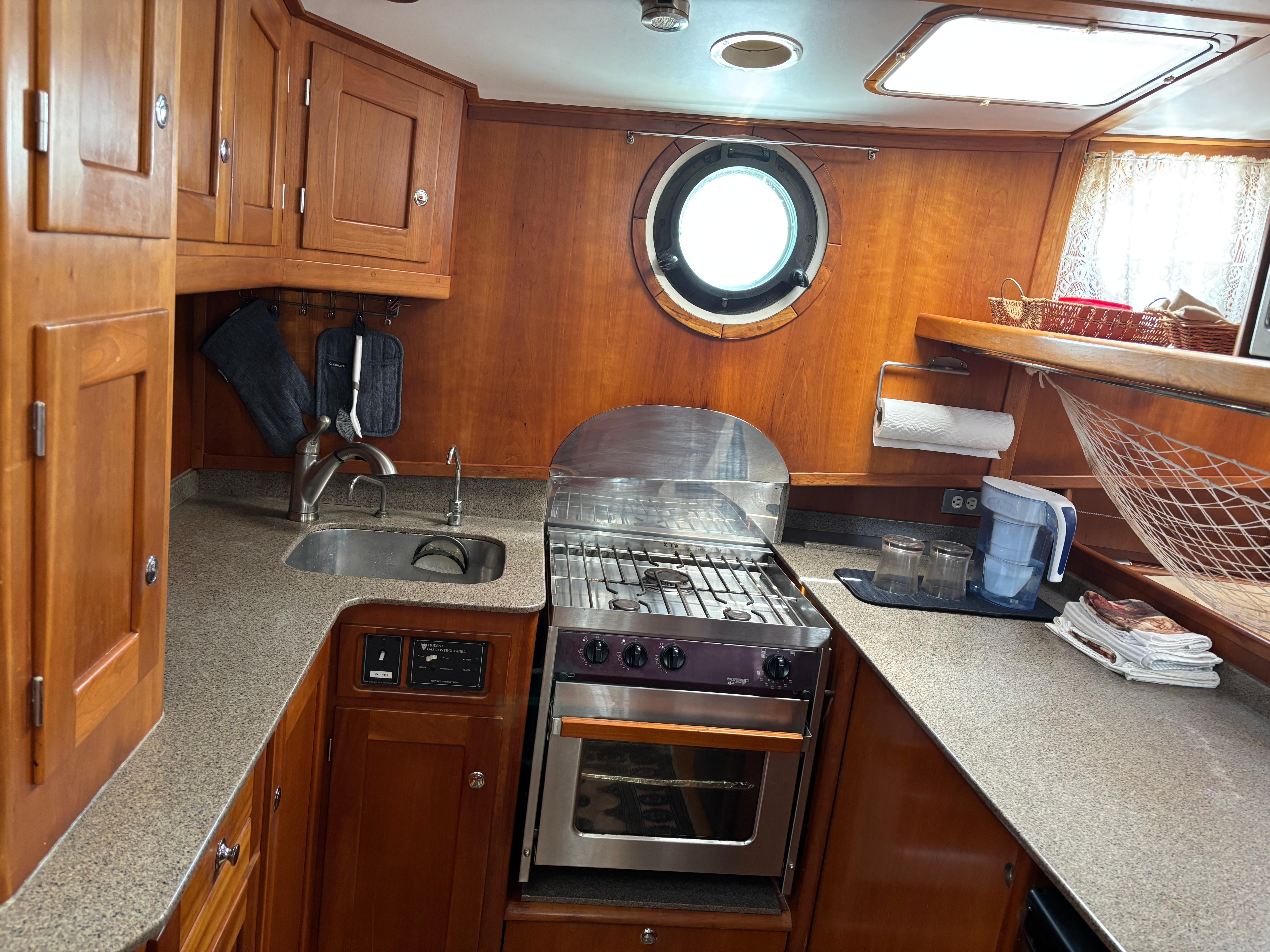 From the wheelhouse, down a few wide and gently sloping steps, is the U-shaped galley to port. The galley provides for a safe and comfortable work station while at rest or underway. All the conveniences of home are nicely laid out in a bright and open area convenient for serving fine dining in either the wheelhouse or salon. Generous stowage in the galley in addition to abundant stowage in the salon. A smart galley equipped for ocean crossings.