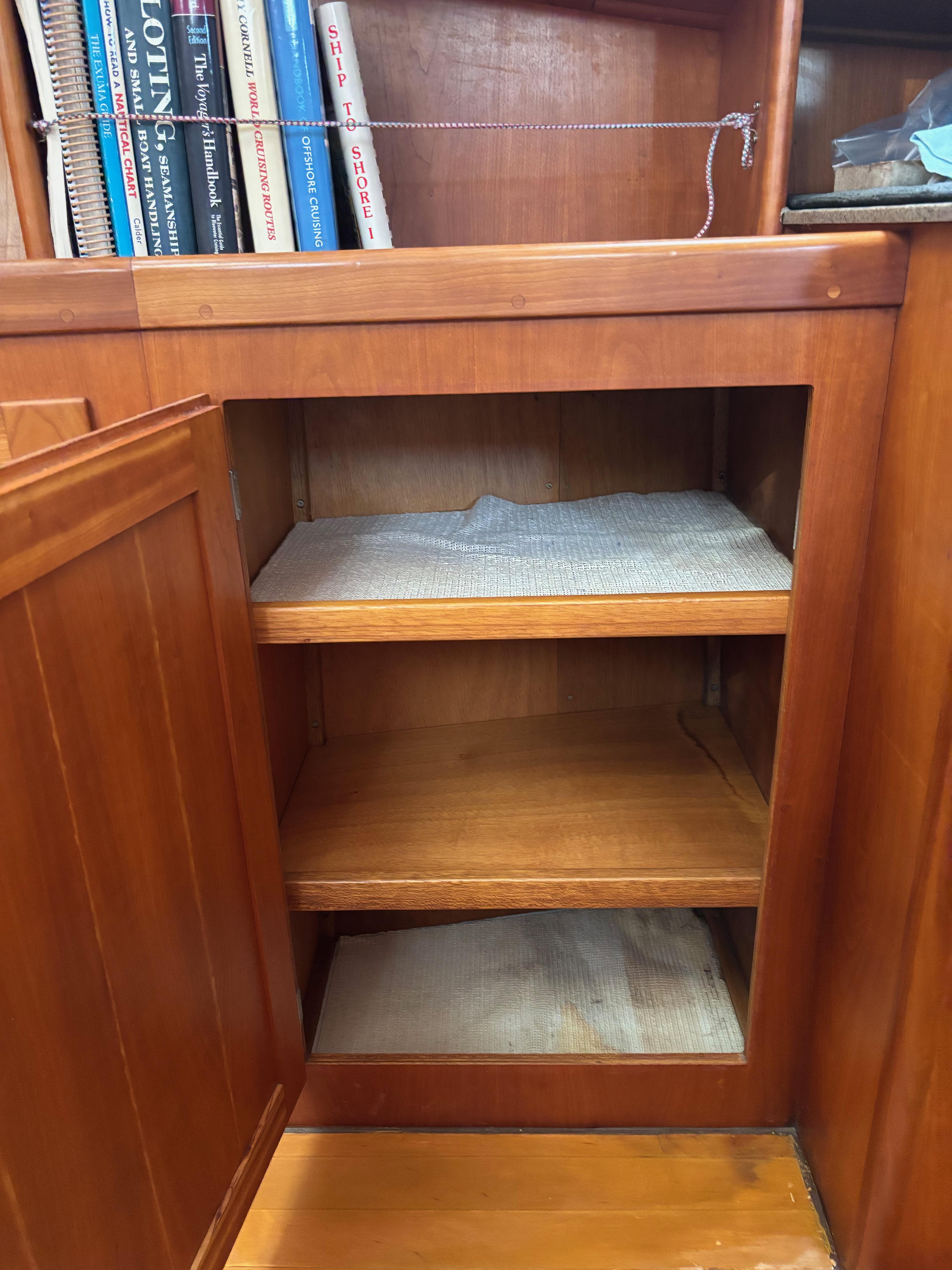 Forward of the galley, the salon is unbelievably large especially for a 41 foot trawler. To port, the upholstered L-shaped dinette settee has beneath-seat storage as well as cabinets easily accessed behind the seat backs. The pedestal table converts the settee into a queen berth. Starboardside houses cabinetry and stowage. Additional stowage is in compartments accessed from the sole via hatches. Forward is a storage room with a watertight door for the chain locker.