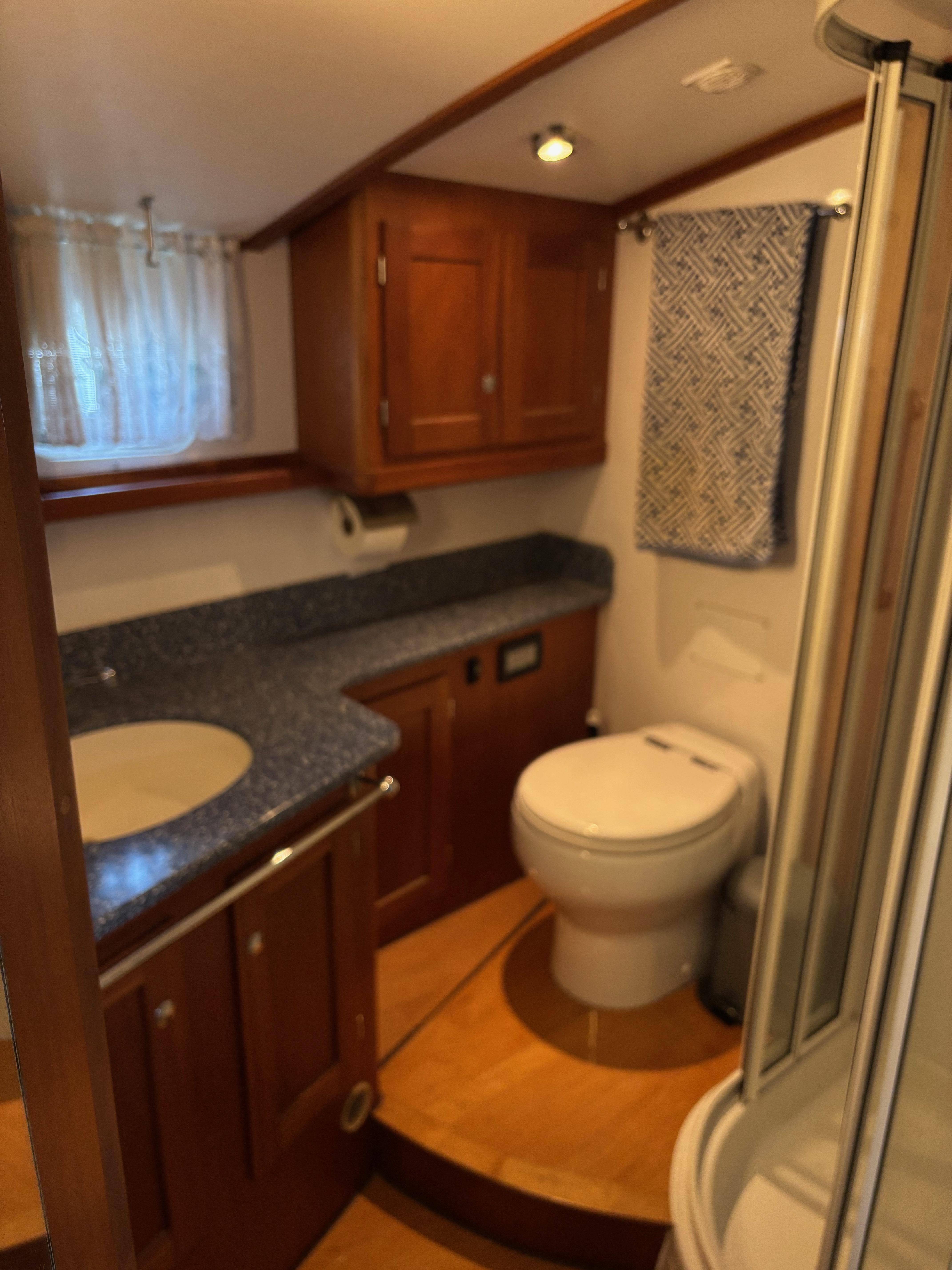 Forward in the owner's stateroom is the spacious and well equipped ensuite head.
