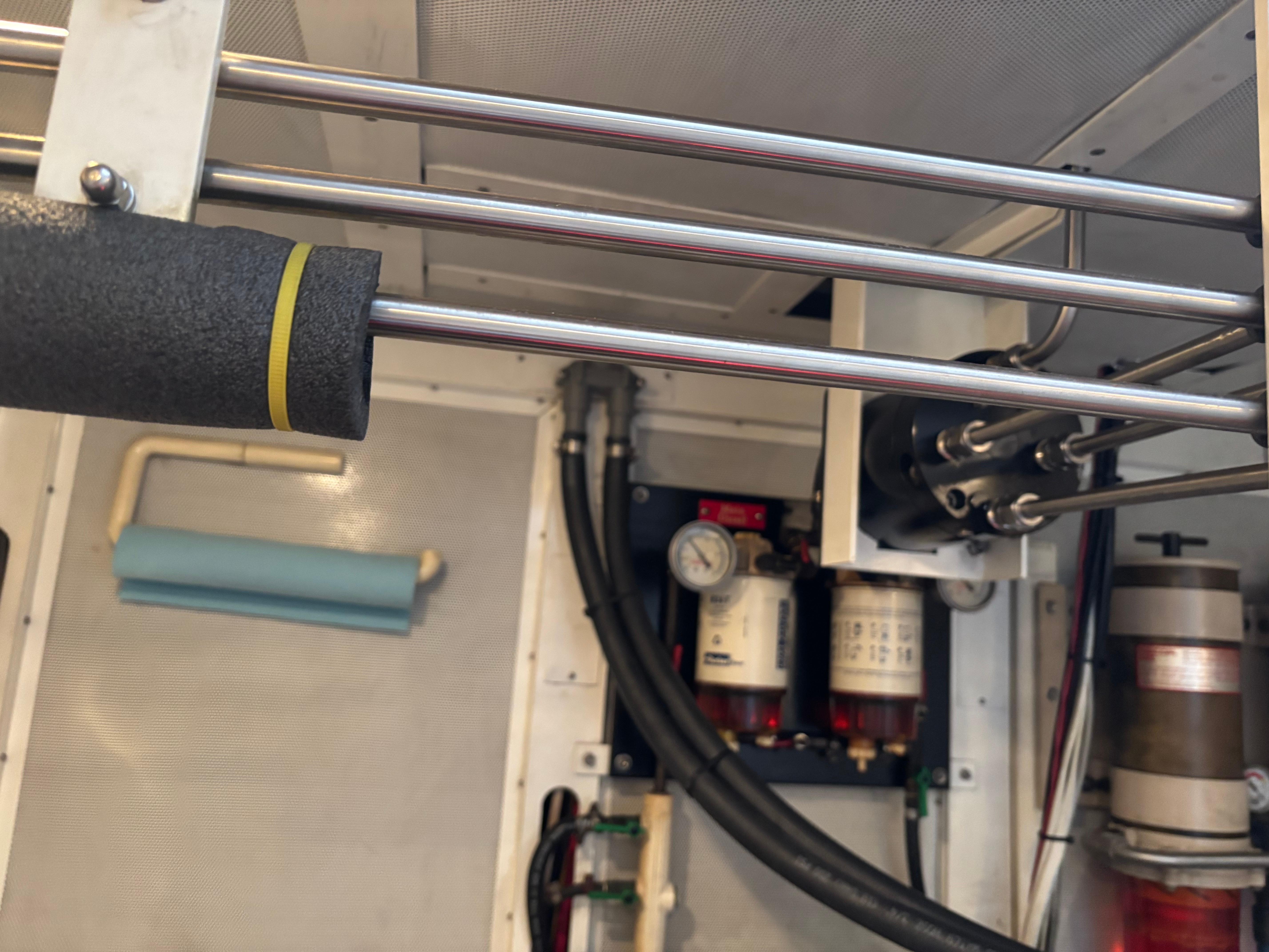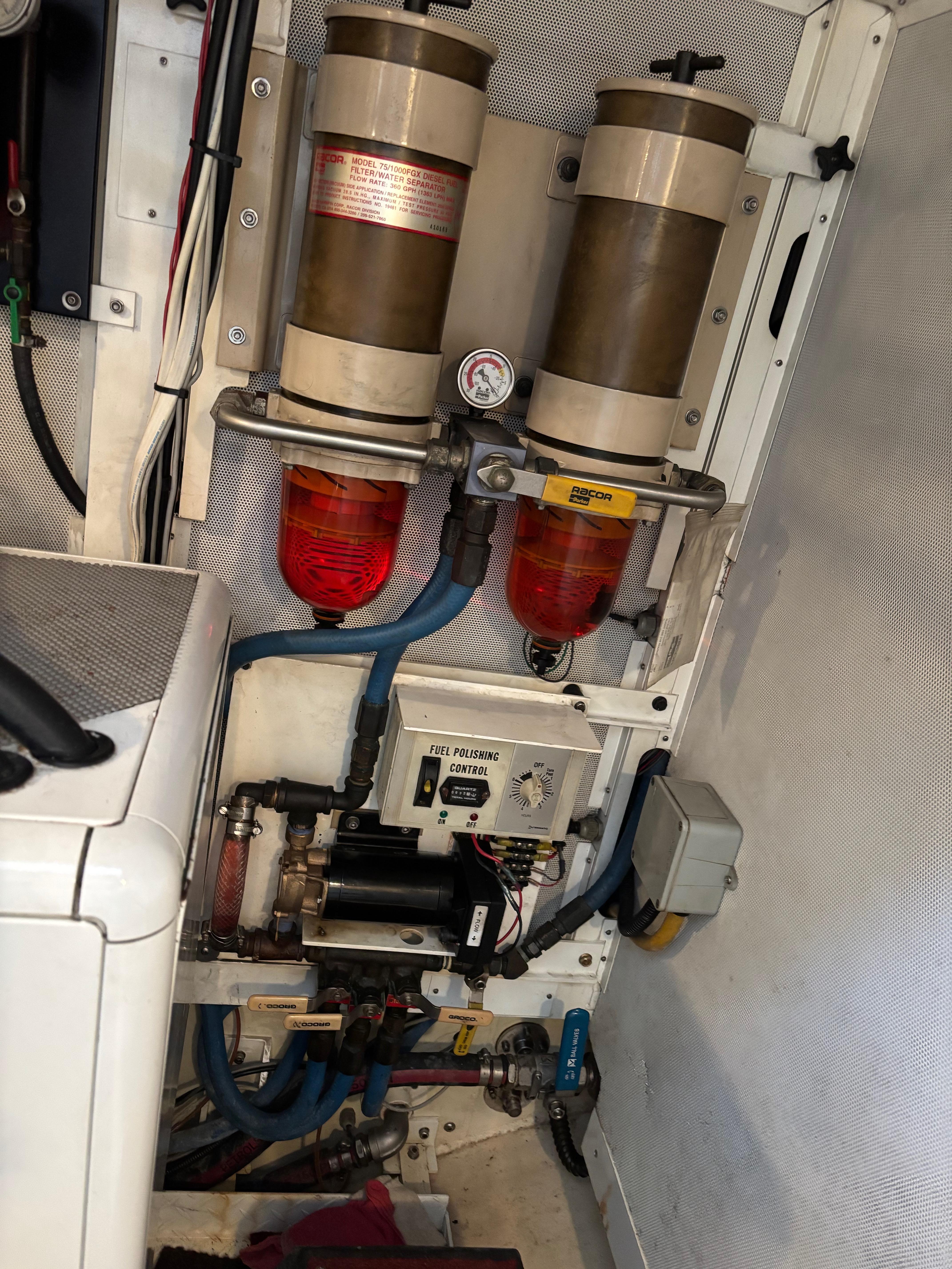 - Fuel polishing system: (2) Racor filters w/12VDC Groco Vane pump w/ pressure release pump & electronic control box