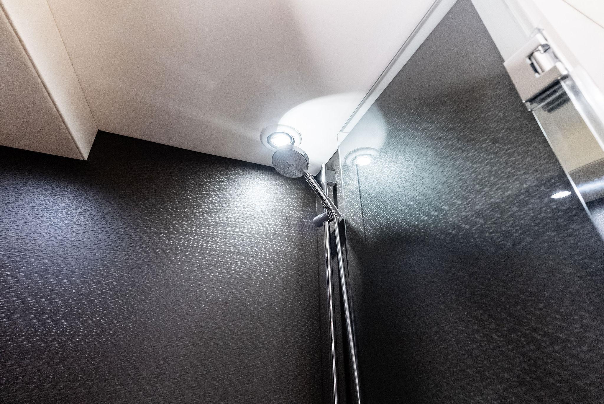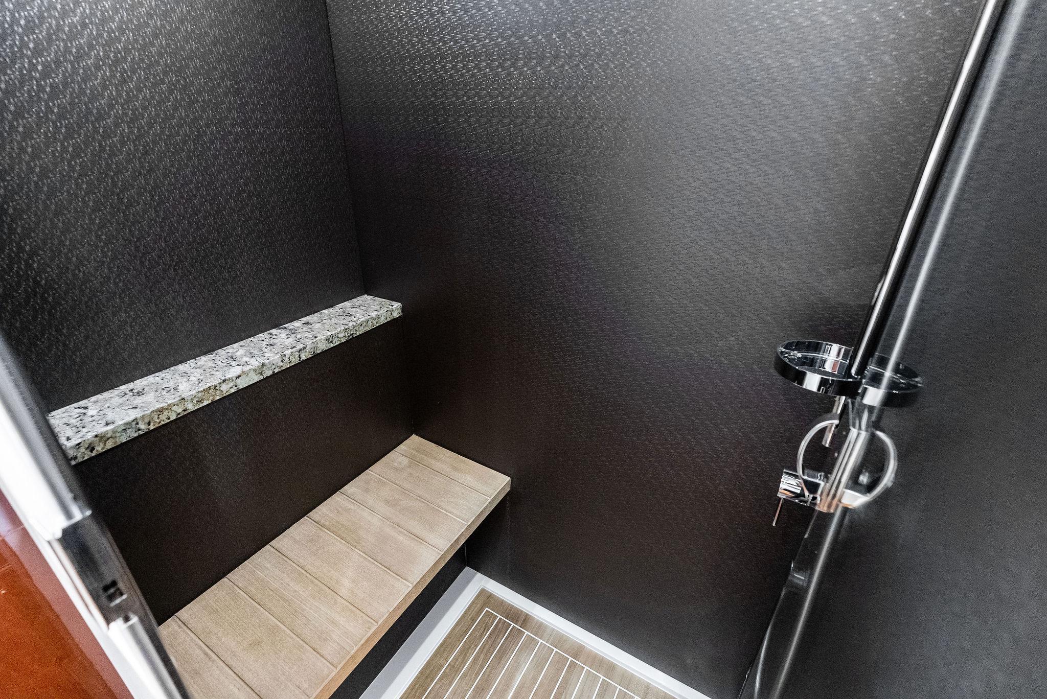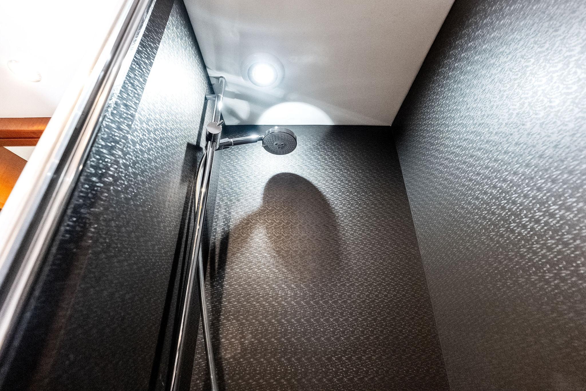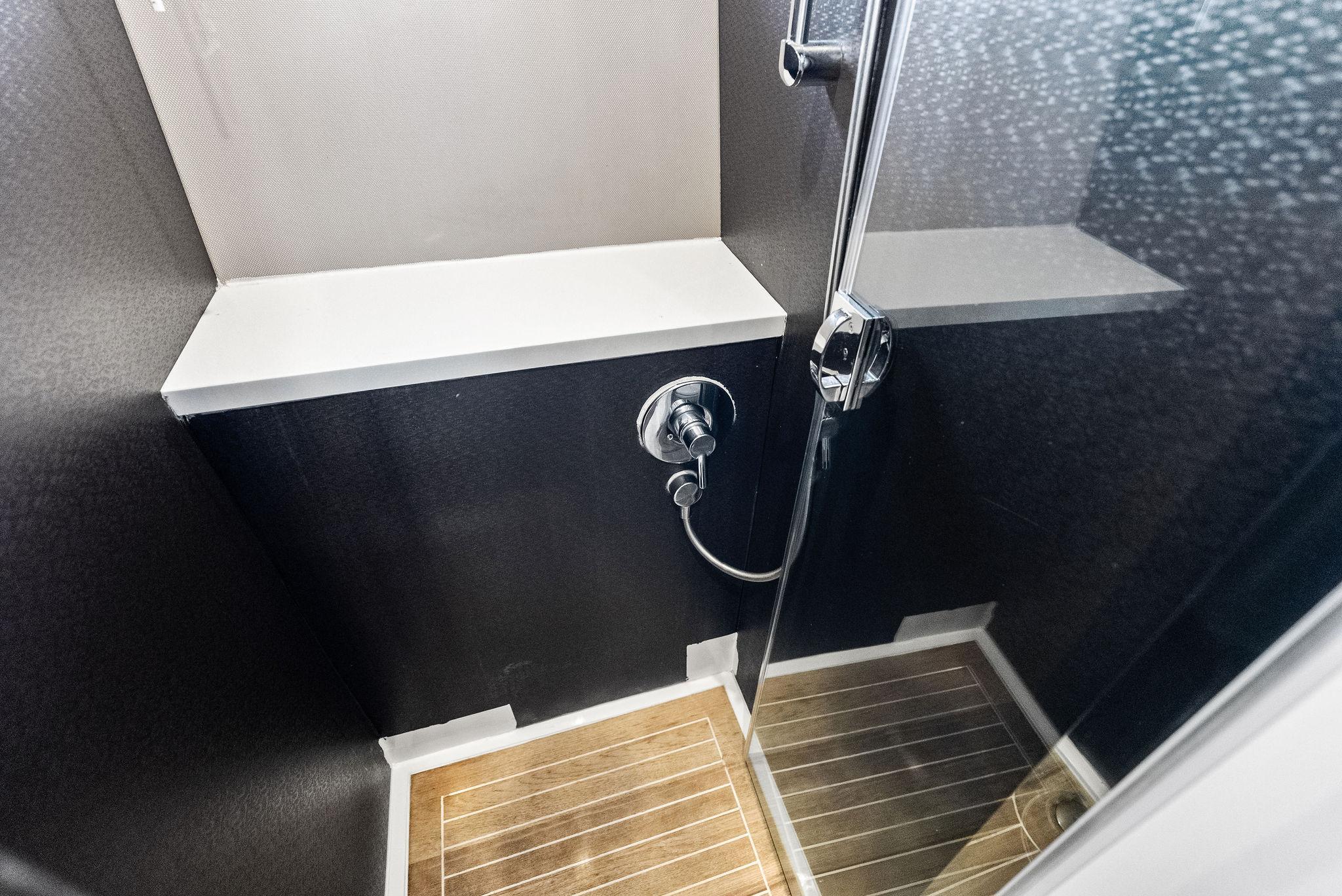 - Separate shower compartment with automatic pump out and custom teak shower sole
