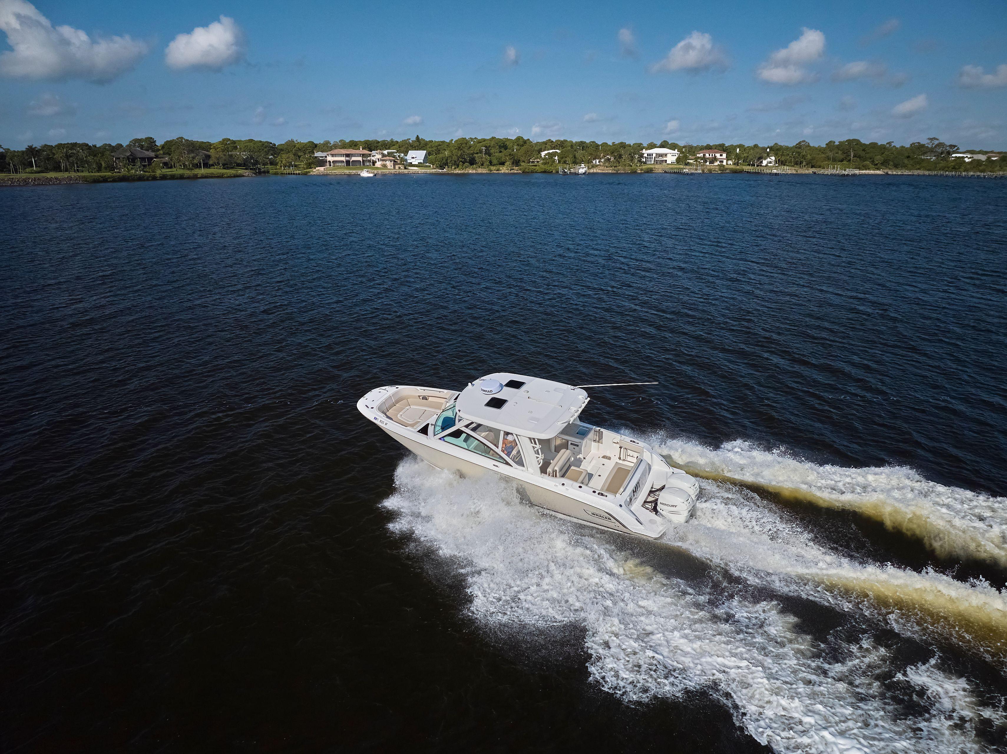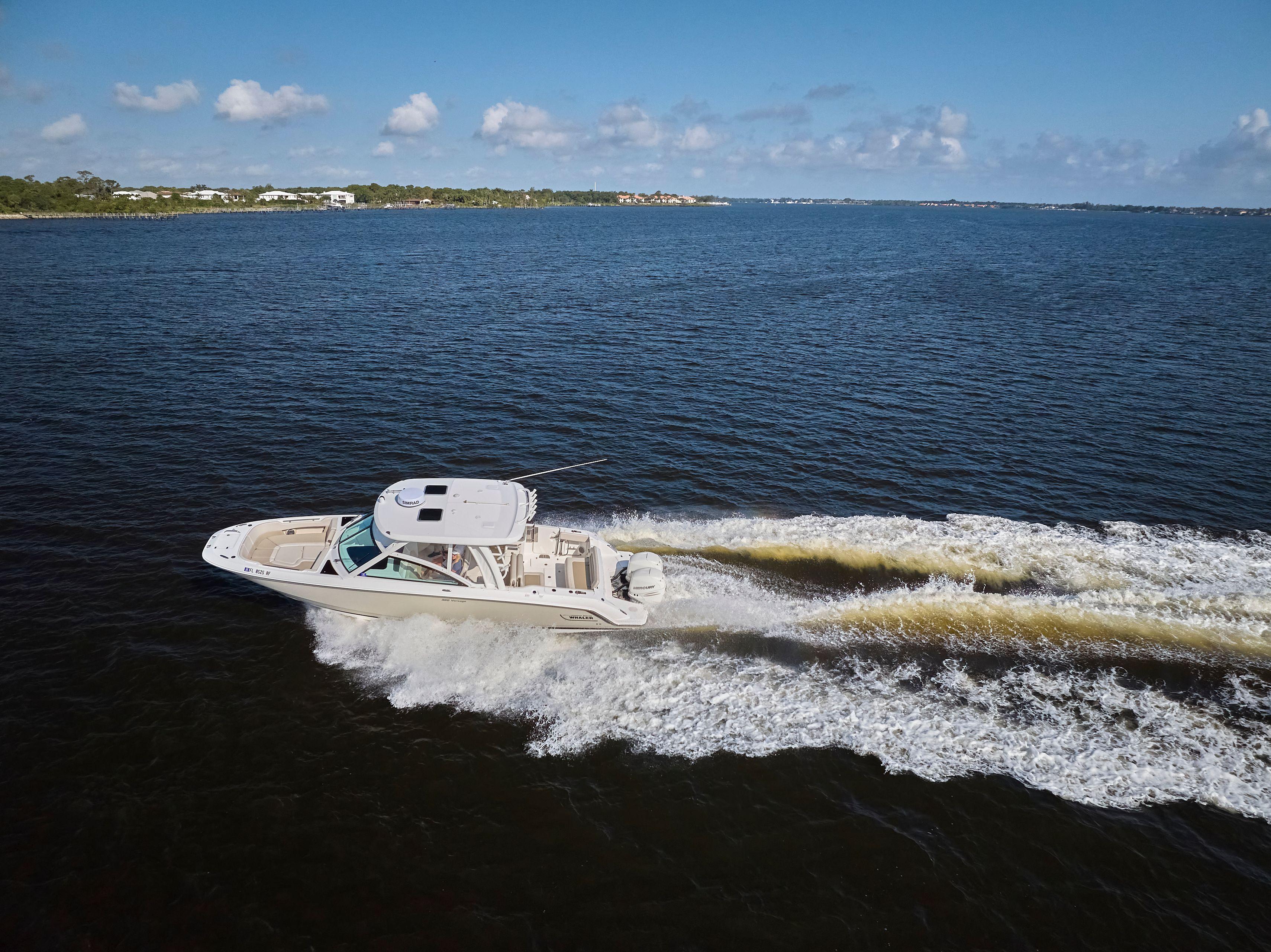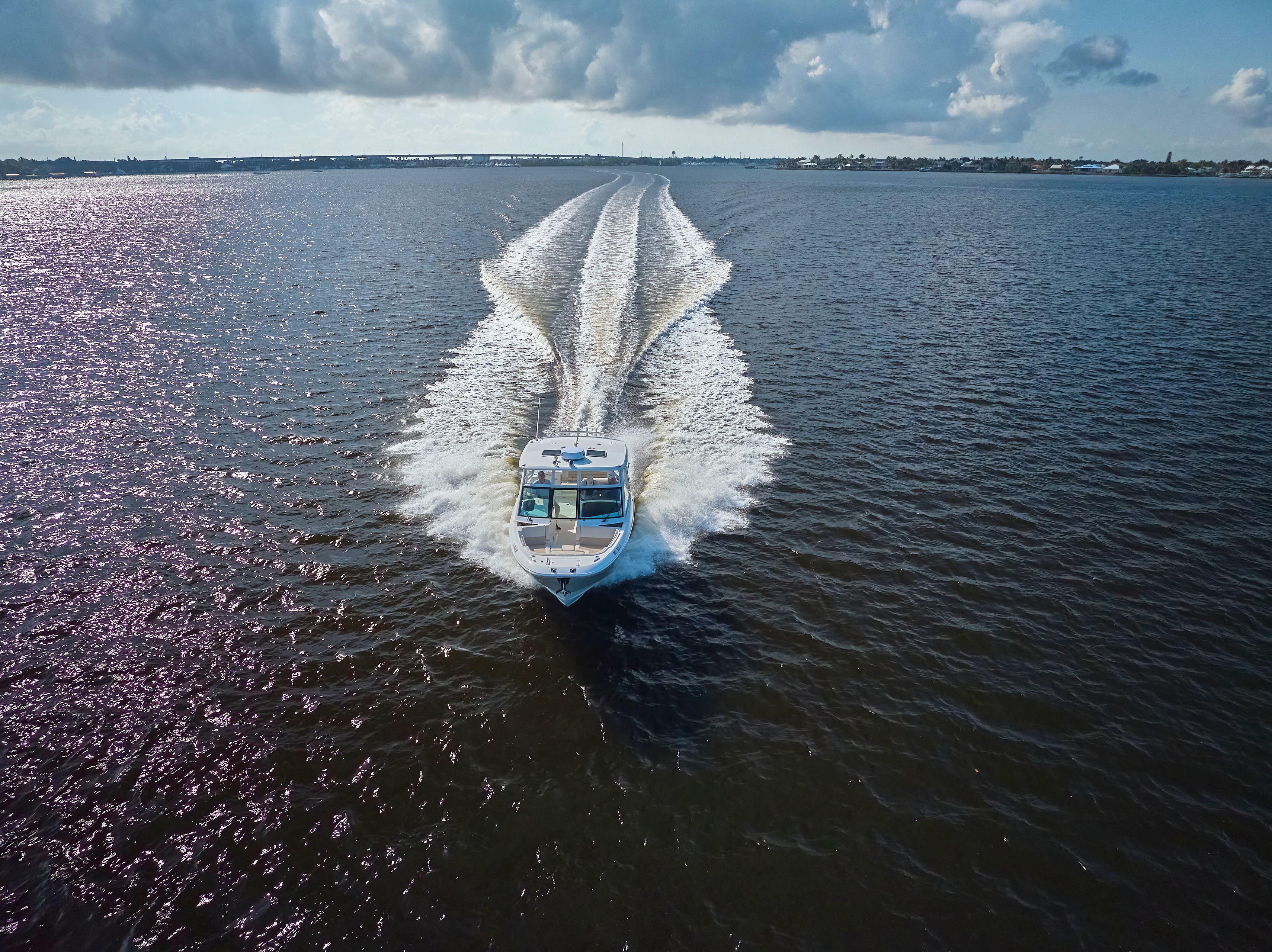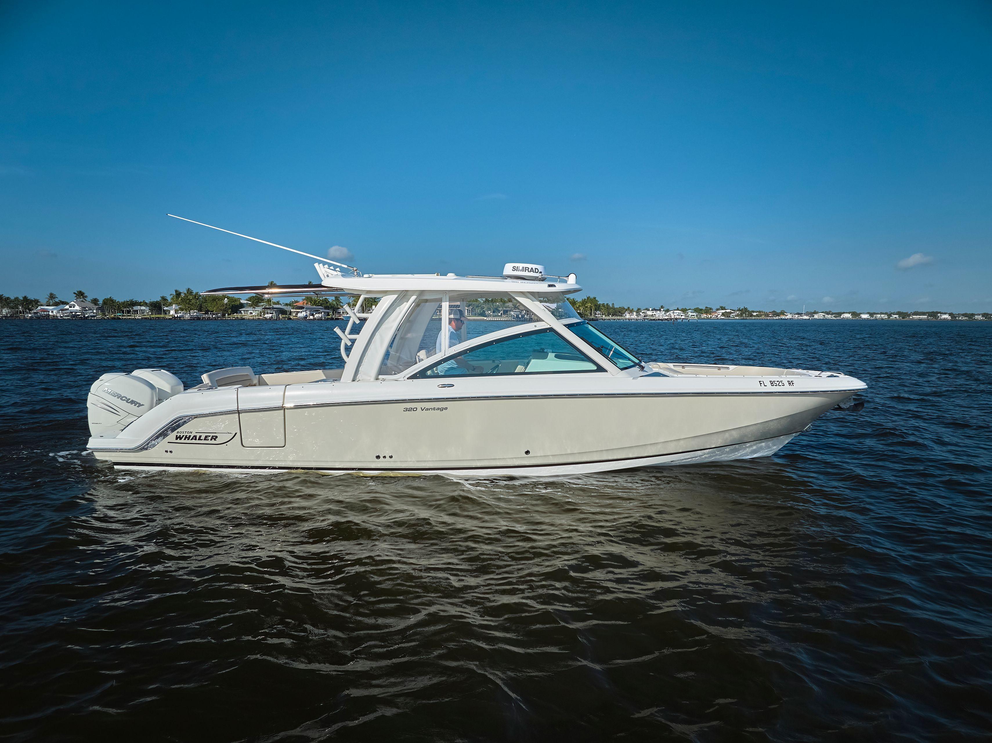 Cutting-edge features, great capacity and easy adaptability are hallmarks of the dual-console 320 Vantage®, winner of the National Marine Manufacturers Association’s 2015 Innovation Award. Rock-solid control meets the ultimate in versatility and comfort with the many accessories and options the 320 provides. Serious fishing, joyful entertaining, day-long watersports or cruising and even a place to sneak in a nap or an overnight stay–the 320 is ready for your day. When the softest, safest ride meets the best equipped dual-console around, new possibilities become eminently possible.Uniquely convertible portside seating offers an array of configurations.Spacious open bow features backrests, a large under-seat cooler, an optional bow table and more.A cockpit utility center includes a sink, 18-gallon cooler and prep surface, plus grill and fridge.Below deck, a cozy interior seating area offers a break from the weather.Two touchscreens at the helm feature SIMRAD® electronics and Mercury VesselView display.