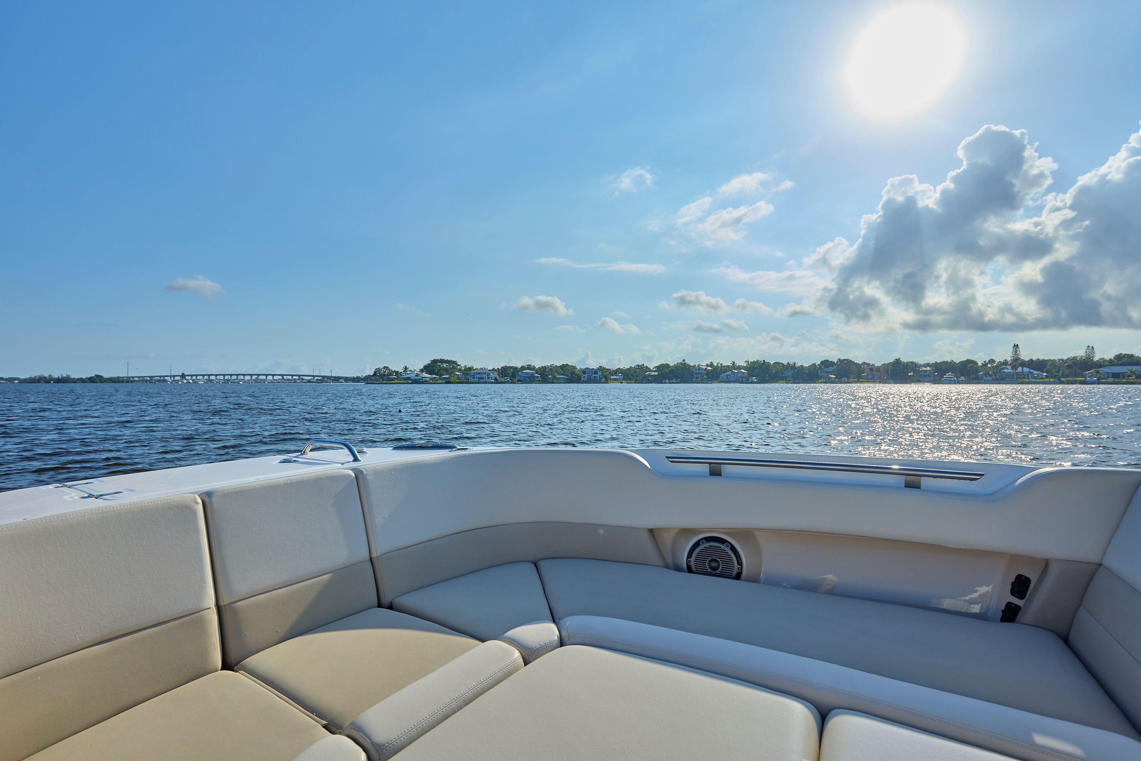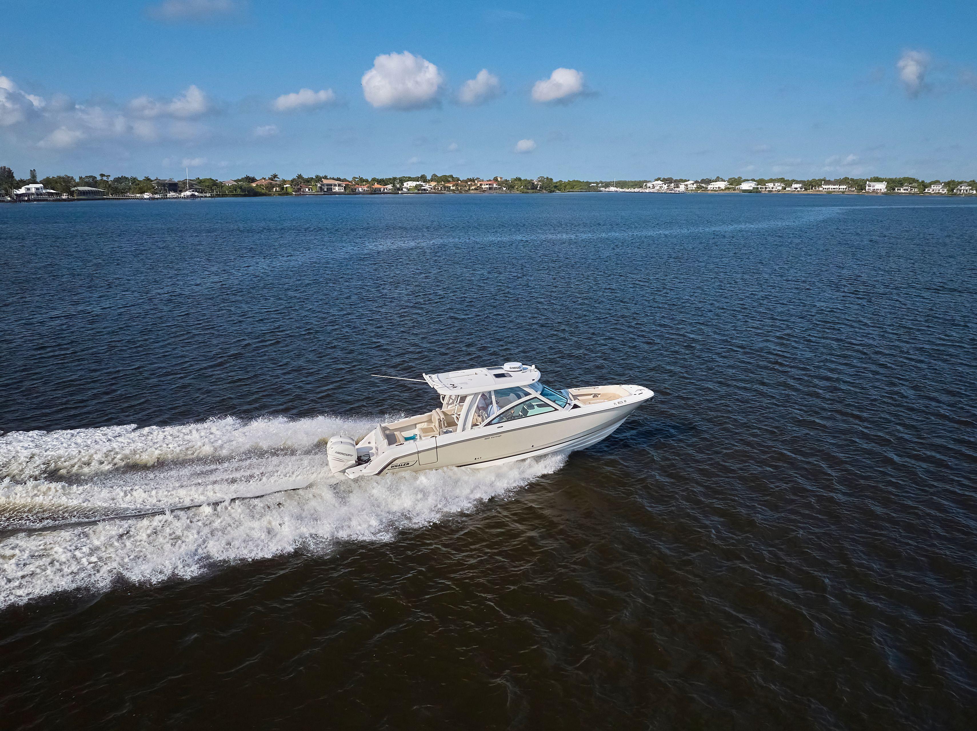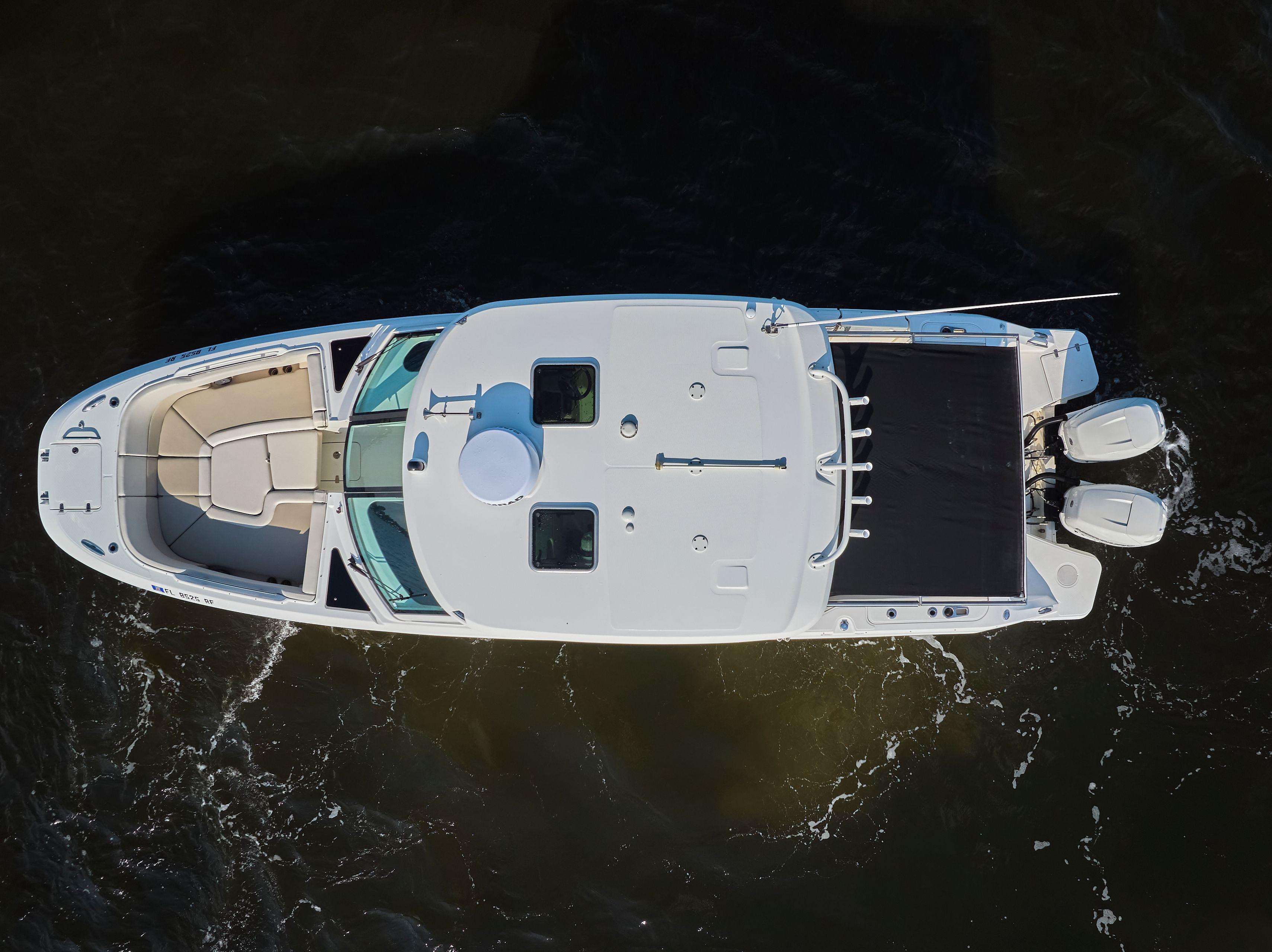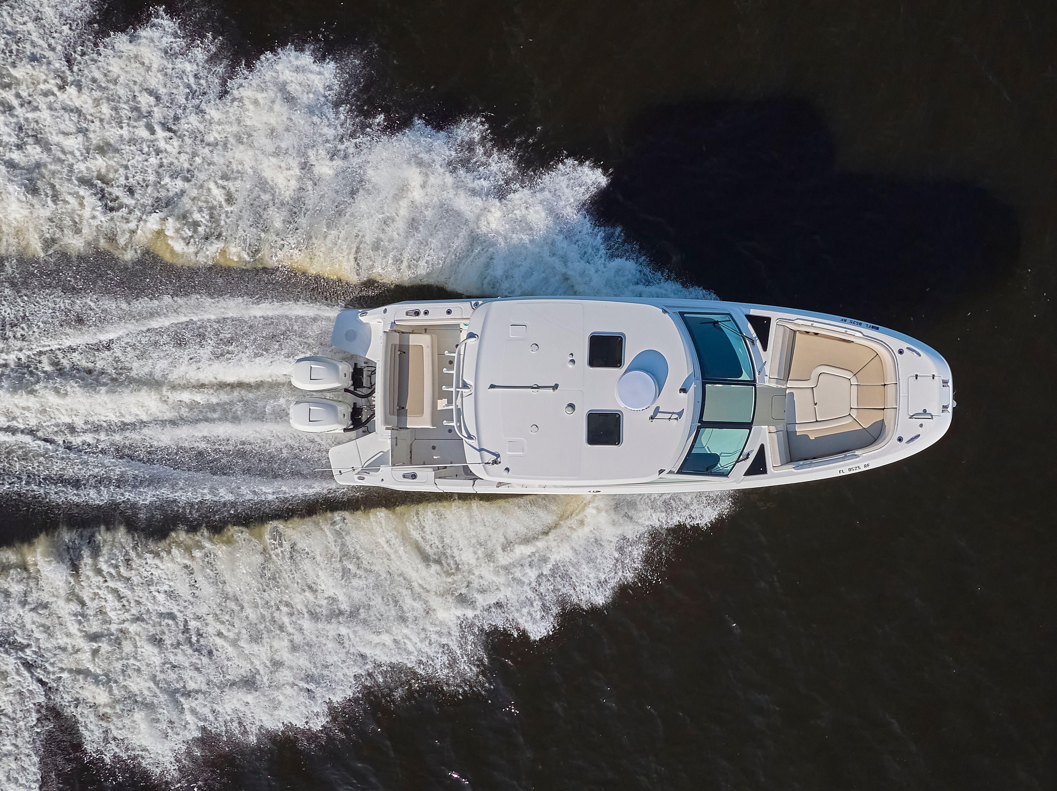 Cutting-edge features, great capacity and easy adaptability are hallmarks of the dual-console 320 Vantage®, winner of the National Marine Manufacturers Association’s 2015 Innovation Award. Rock-solid control meets the ultimate in versatility and comfort with the many accessories and options the 320 provides. Serious fishing, joyful entertaining, day-long watersports or cruising and even a place to sneak in a nap or an overnight stay–the 320 is ready for your day. When the softest, safest ride meets the best equipped dual-console around, new possibilities become eminently possible.Uniquely convertible portside seating offers an array of configurations.Spacious open bow features backrests, a large under-seat cooler, an optional bow table and more.A cockpit utility center includes a sink, 18-gallon cooler and prep surface, plus grill and fridge.Below deck, a cozy interior seating area offers a break from the weather.Two touchscreens at the helm feature SIMRAD® electronics and Mercury VesselView display.