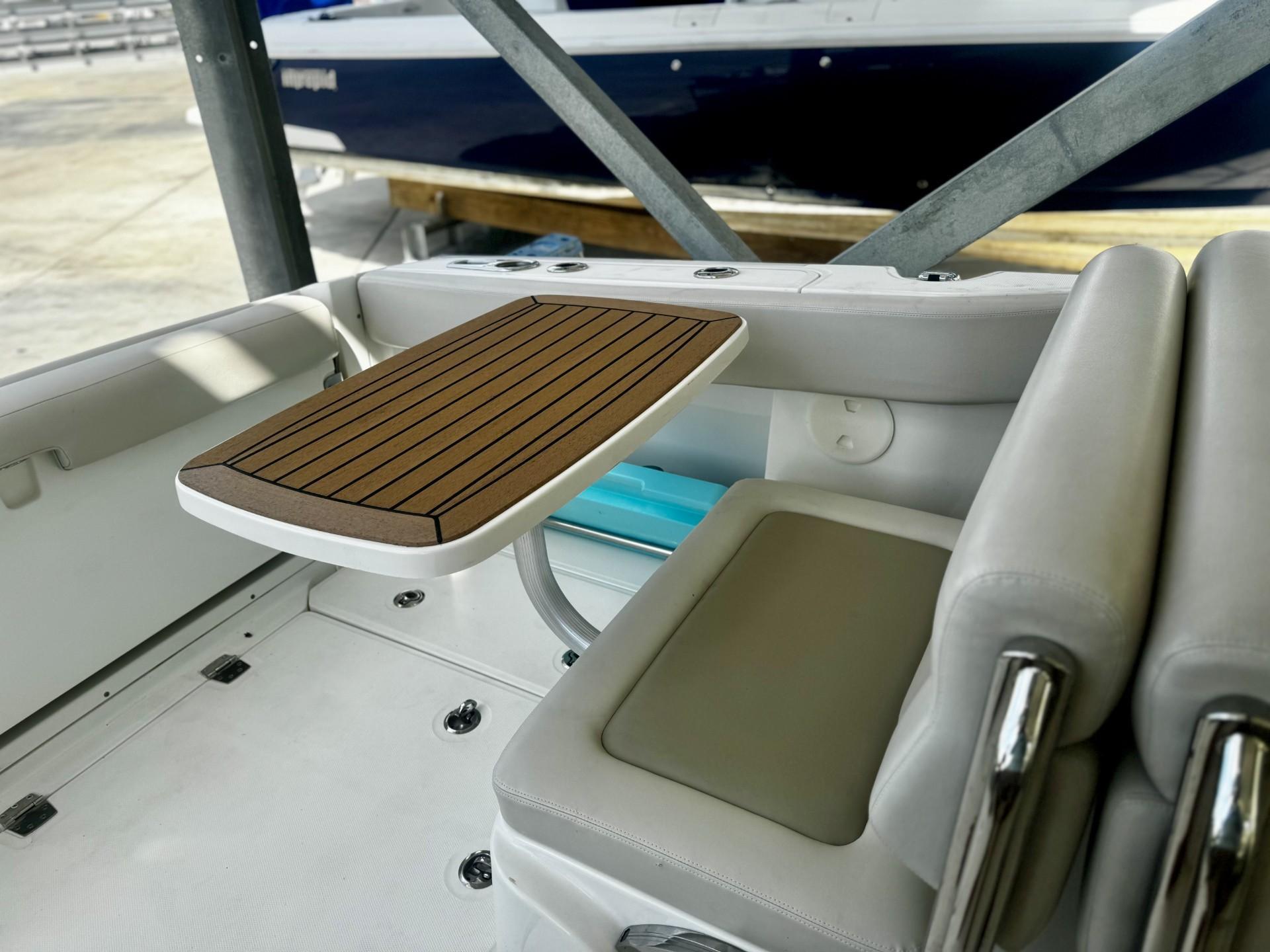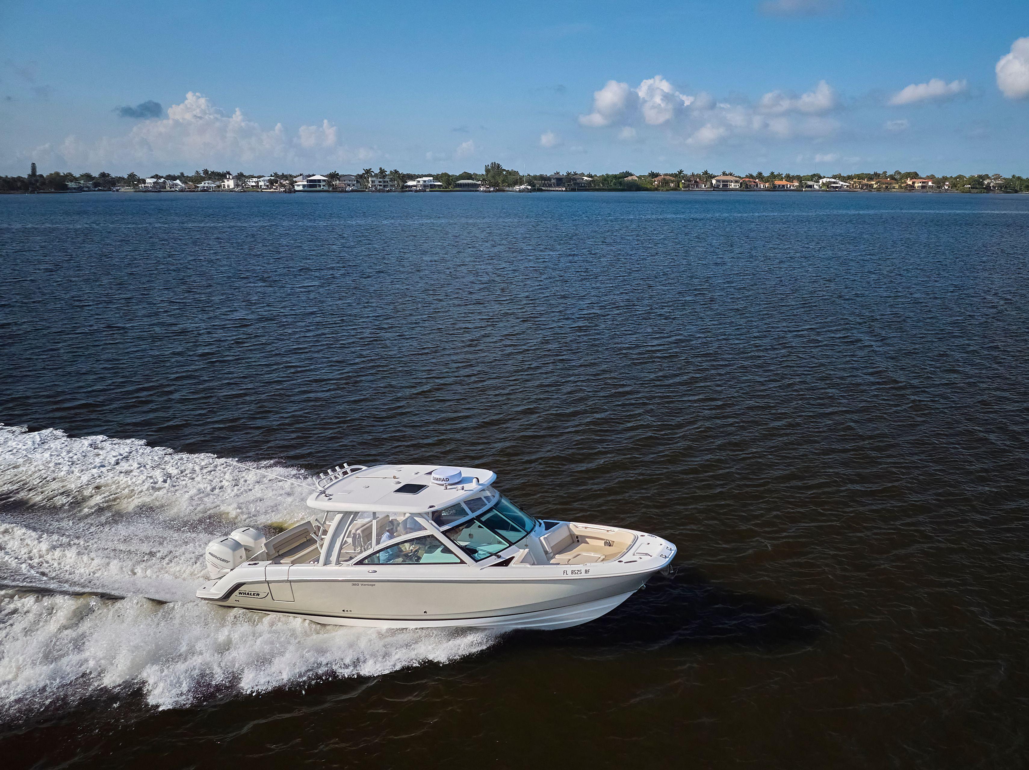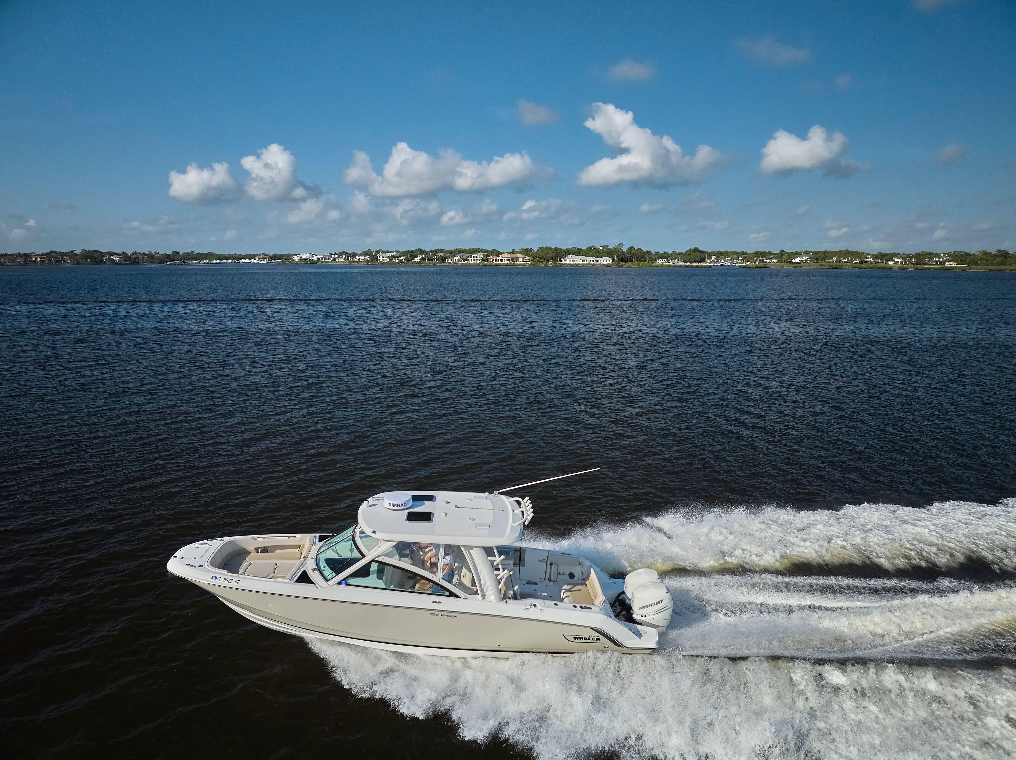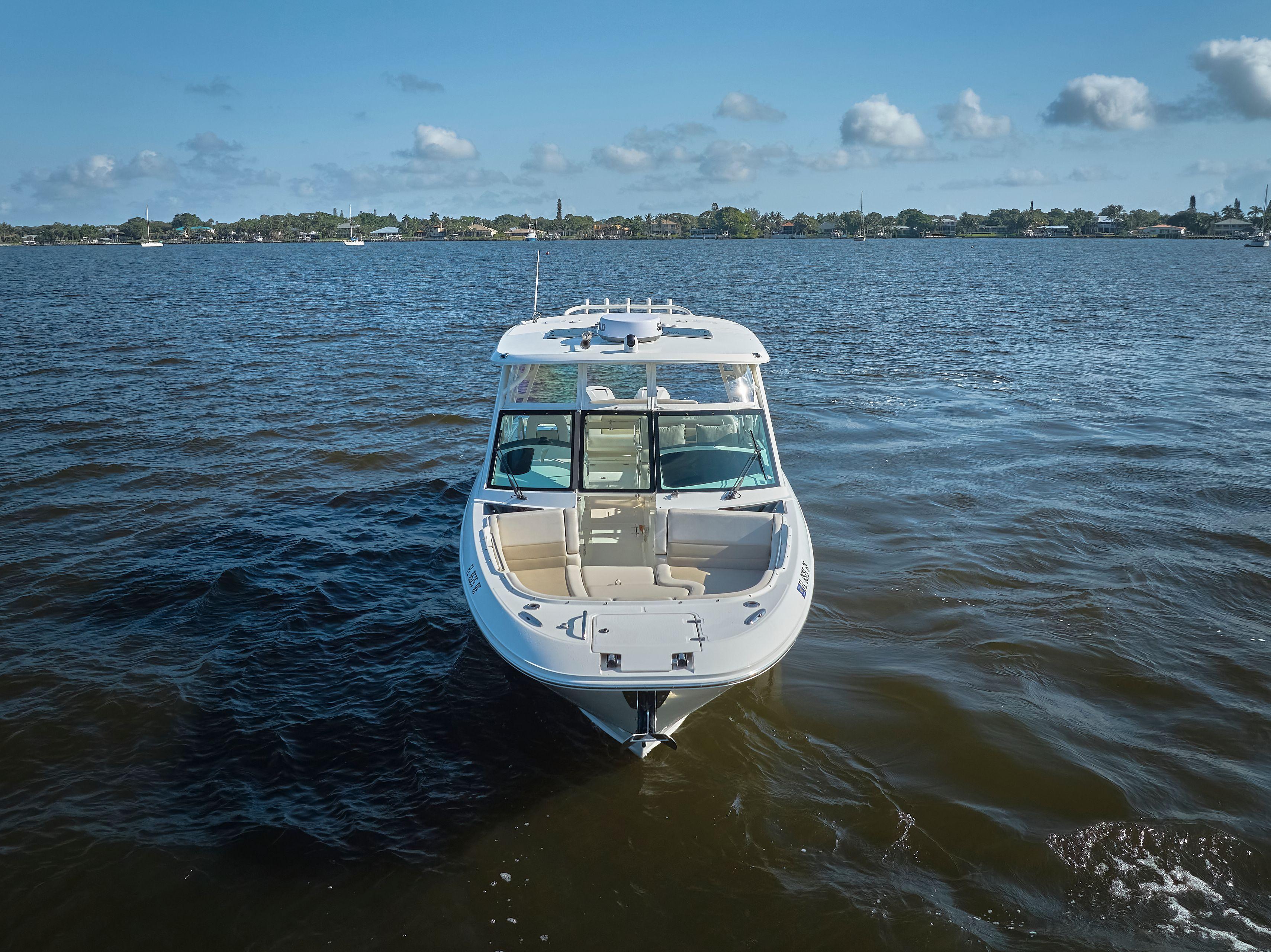Cutting-edge features, great capacity and easy adaptability are hallmarks of the dual-console 320 Vantage®, winner of the National Marine Manufacturers Association’s 2015 Innovation Award. Rock-solid control meets the ultimate in versatility and comfort with the many accessories and options the 320 provides. Serious fishing, joyful entertaining, day-long watersports or cruising and even a place to sneak in a nap or an overnight stay–the 320 is ready for your day. When the softest, safest ride meets the best equipped dual-console around, new possibilities become eminently possible.Uniquely convertible portside seating offers an array of configurations.Spacious open bow features backrests, a large under-seat cooler, an optional bow table and more.A cockpit utility center includes a sink, 18-gallon cooler and prep surface, plus grill and fridge.Below deck, a cozy interior seating area offers a break from the weather.Two touchscreens at the helm feature SIMRAD® electronics and Mercury VesselView display.