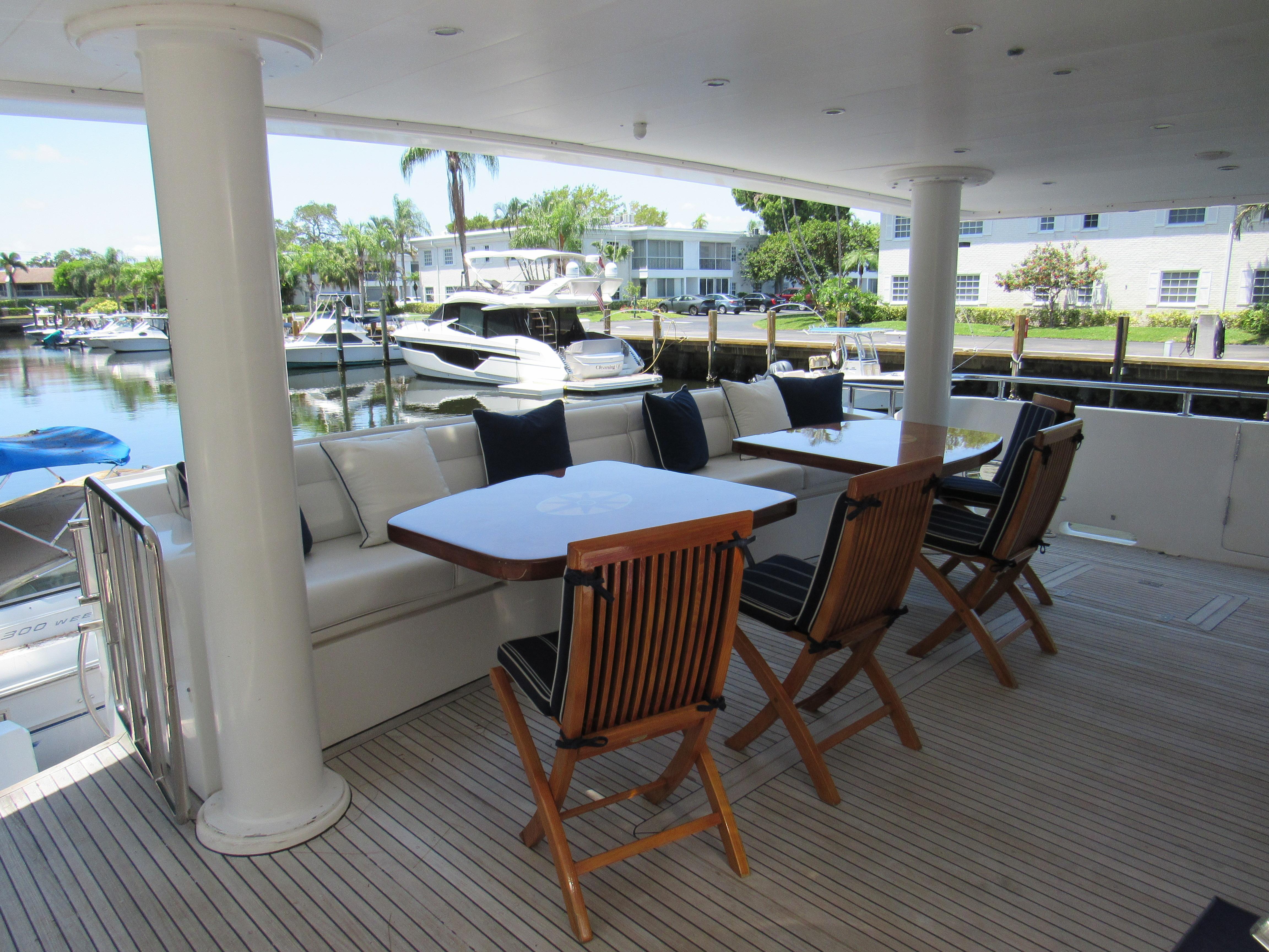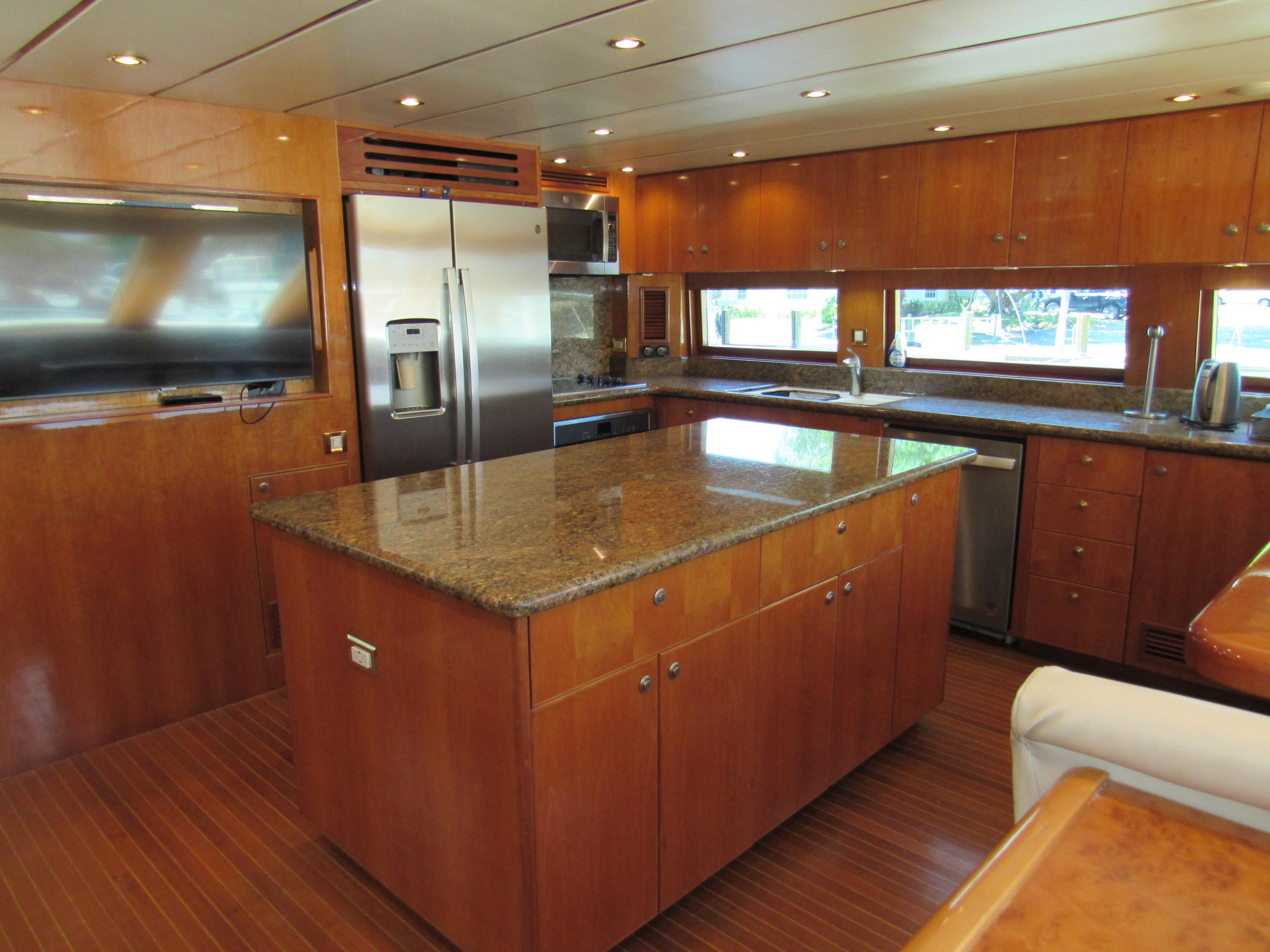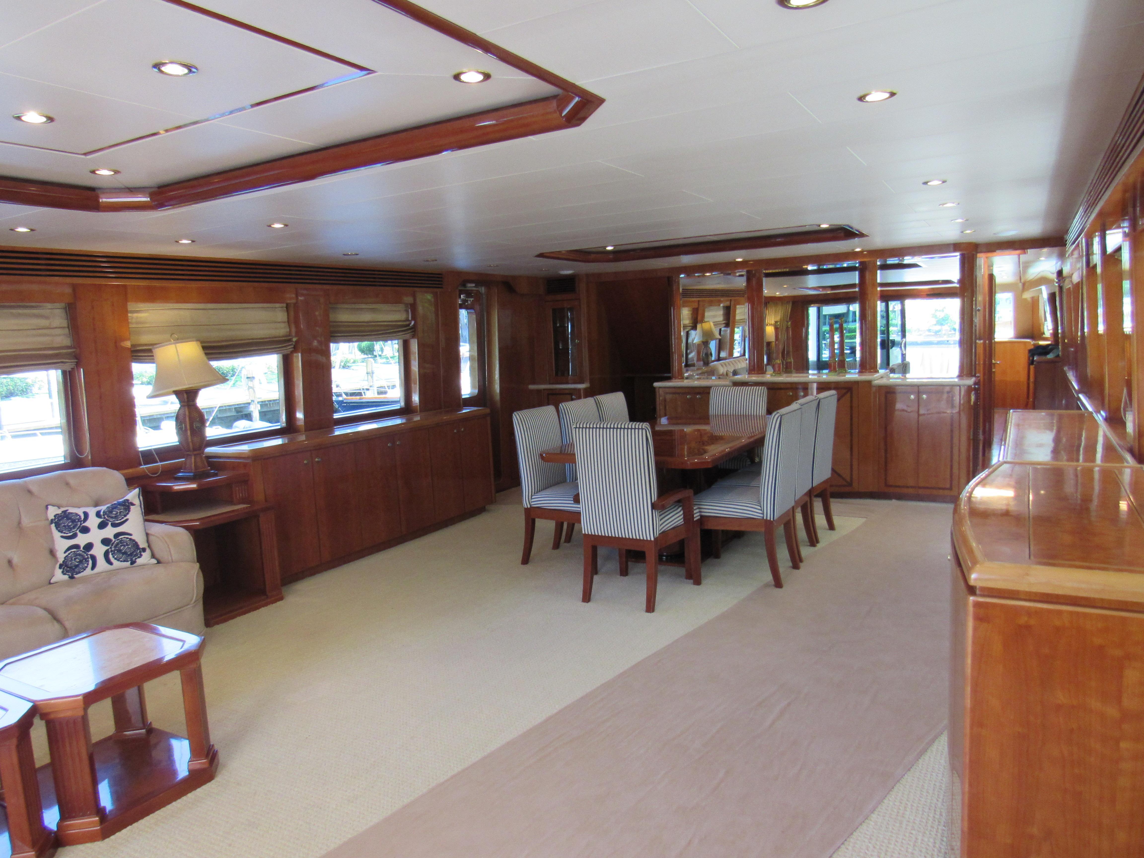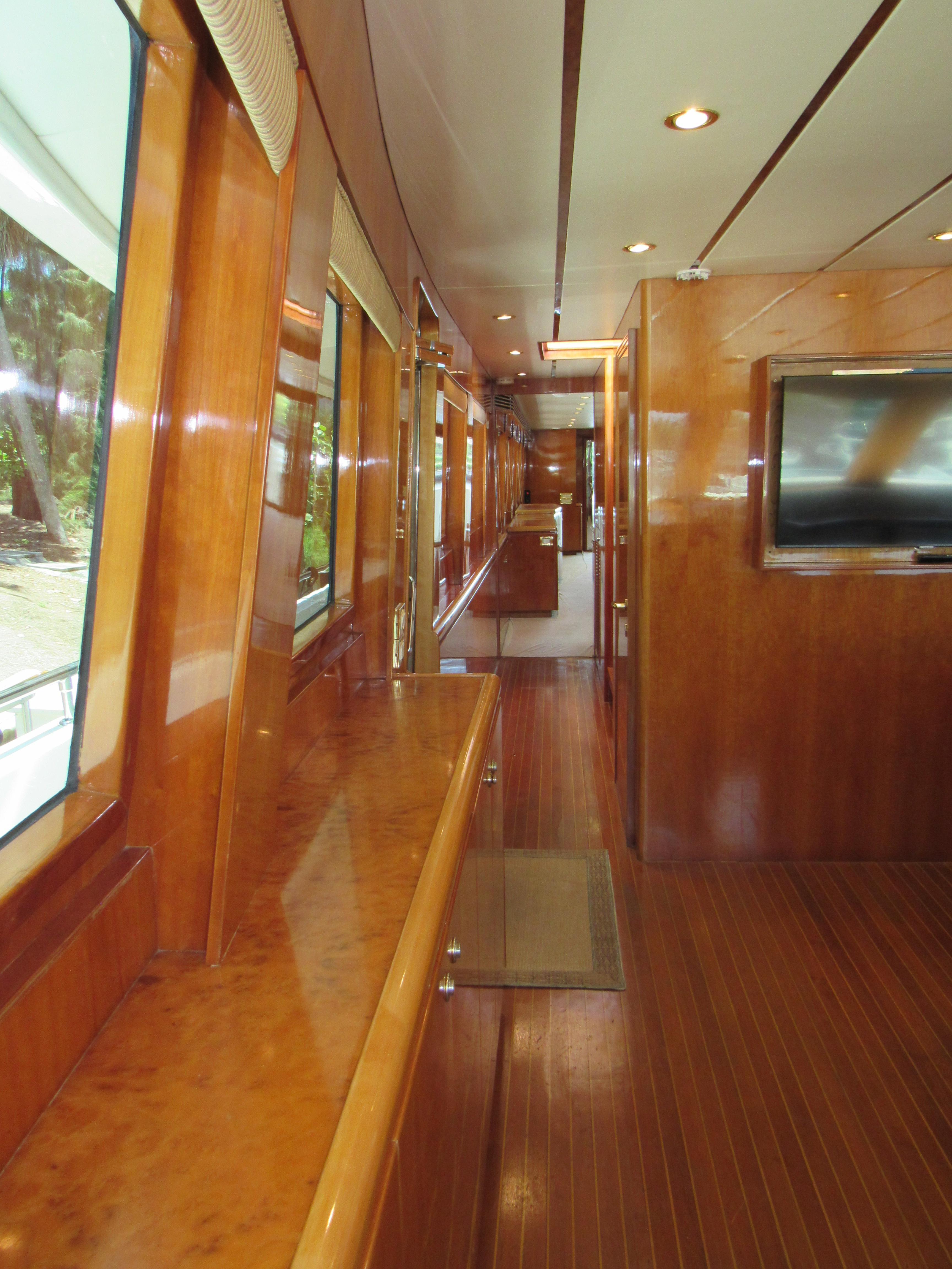 Sanctuary is a raised pilothouse design with walk-around decks, four staterooms and three cabins for crew. Galley / Country Kitchen is forward on the main deck. Aft on the main deck is a generous salon with a dining area forward and lounge / social area aft. Staterooms are on the lower deck including a full beam master, VIP, twin berth stateroom and library with single berth and pullman.Crew accommodations are both forward and aft. Two cabins are forward of the galley, each with ensuite head and shower. An engineer’s cabin with separate head and shower is aft with access from the swim step.
