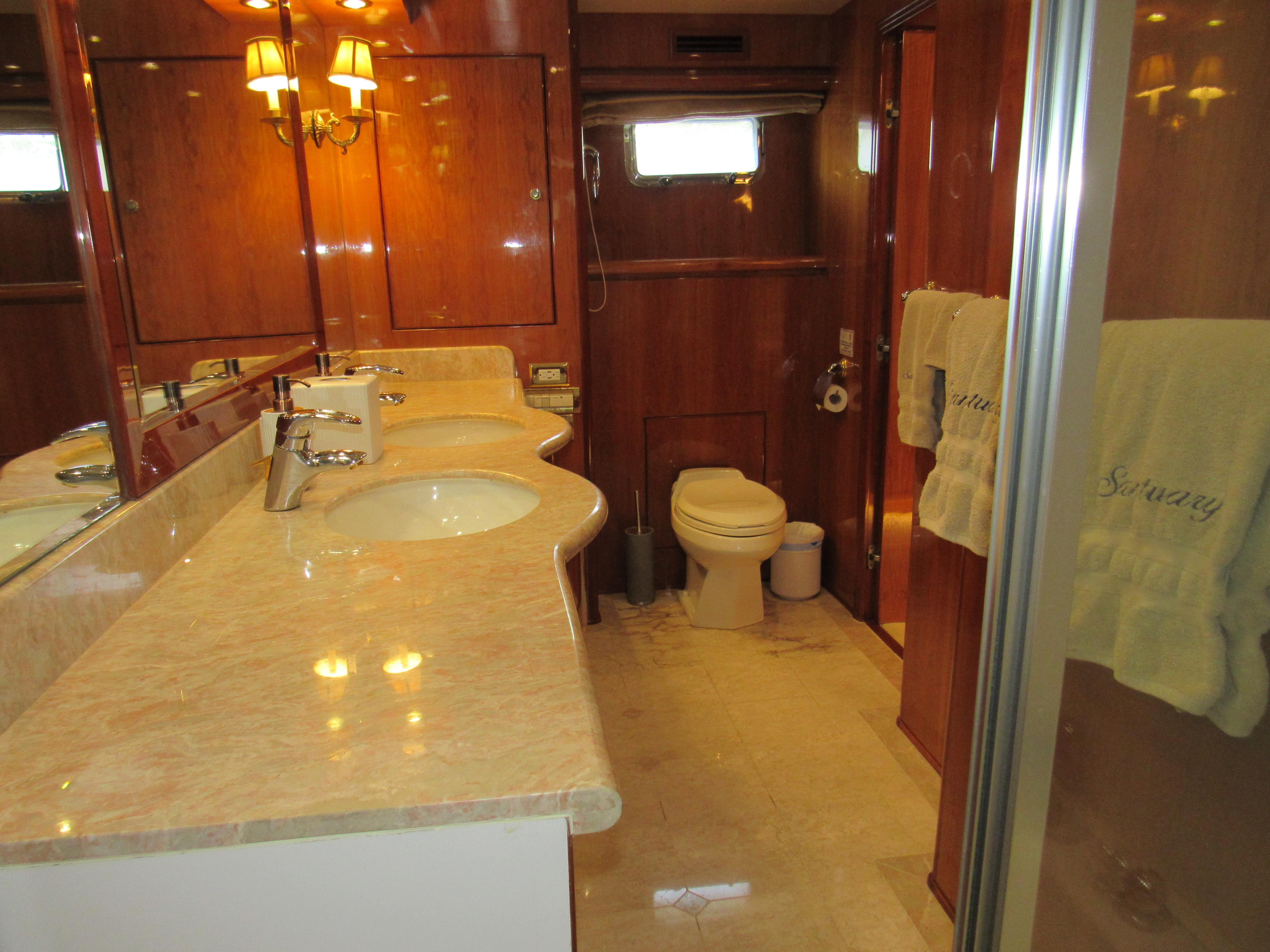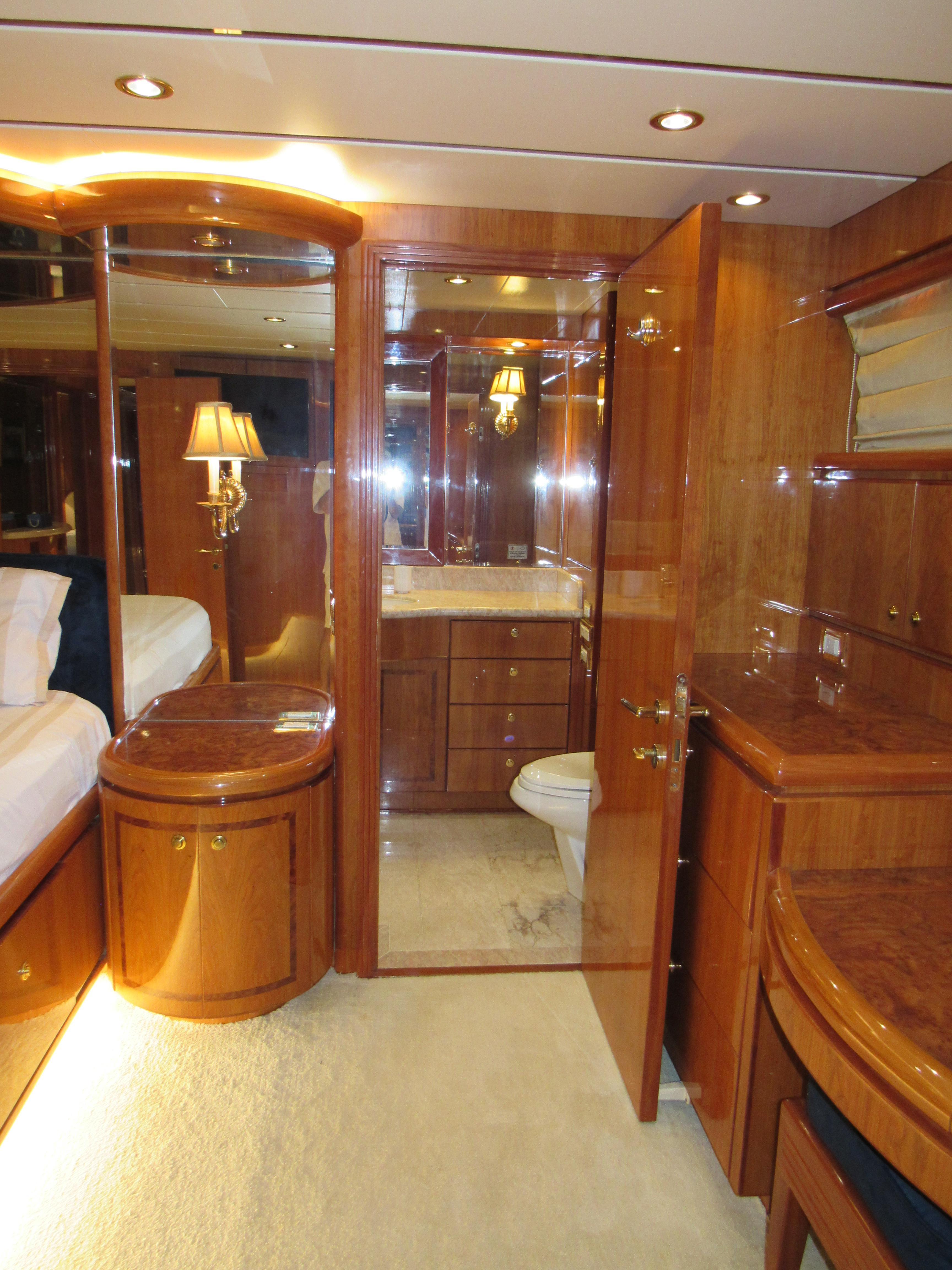 VIP STATEROOM AND HEADIsland queen berth with bureau, nightstands, TV and head with shower.