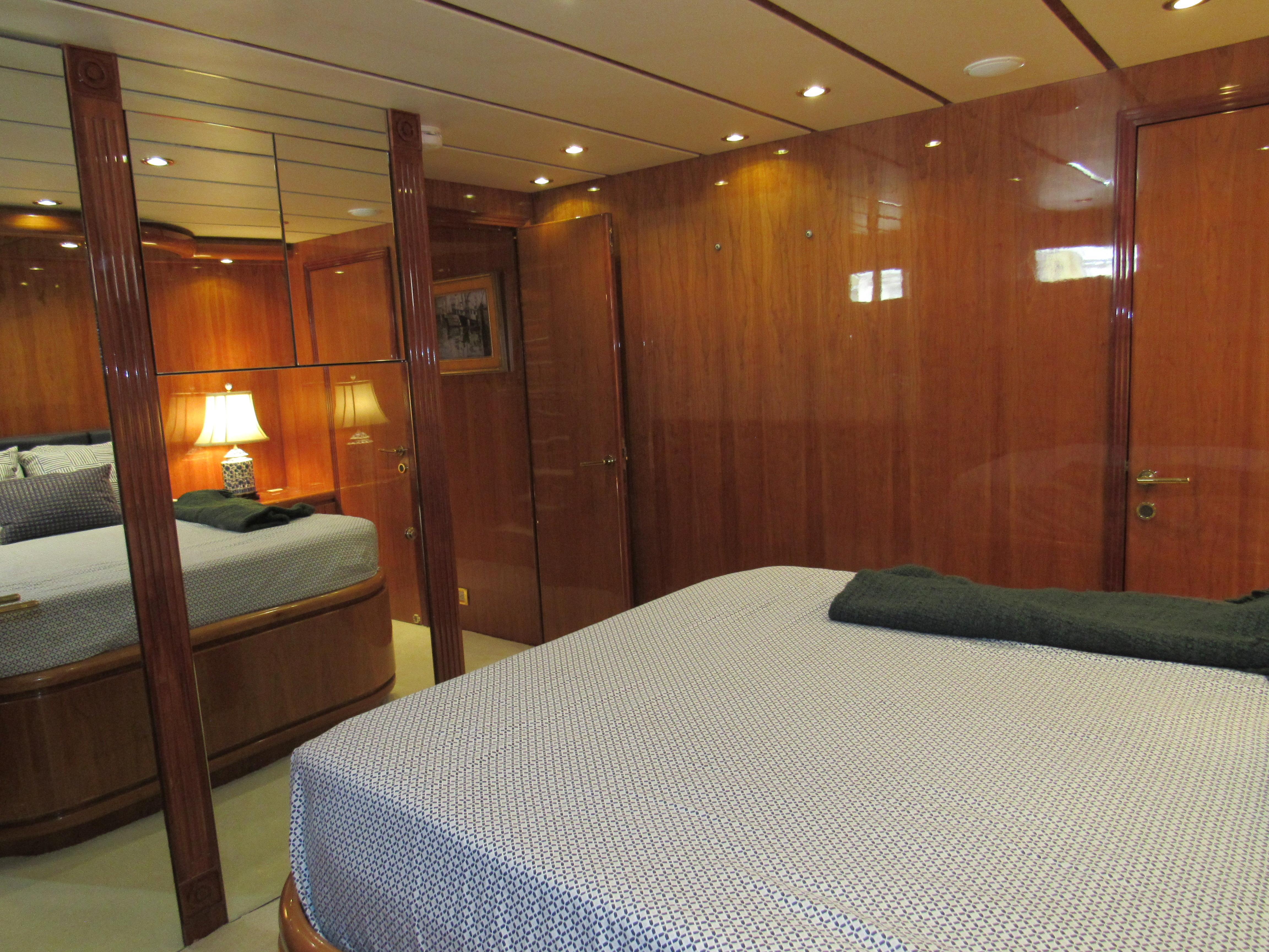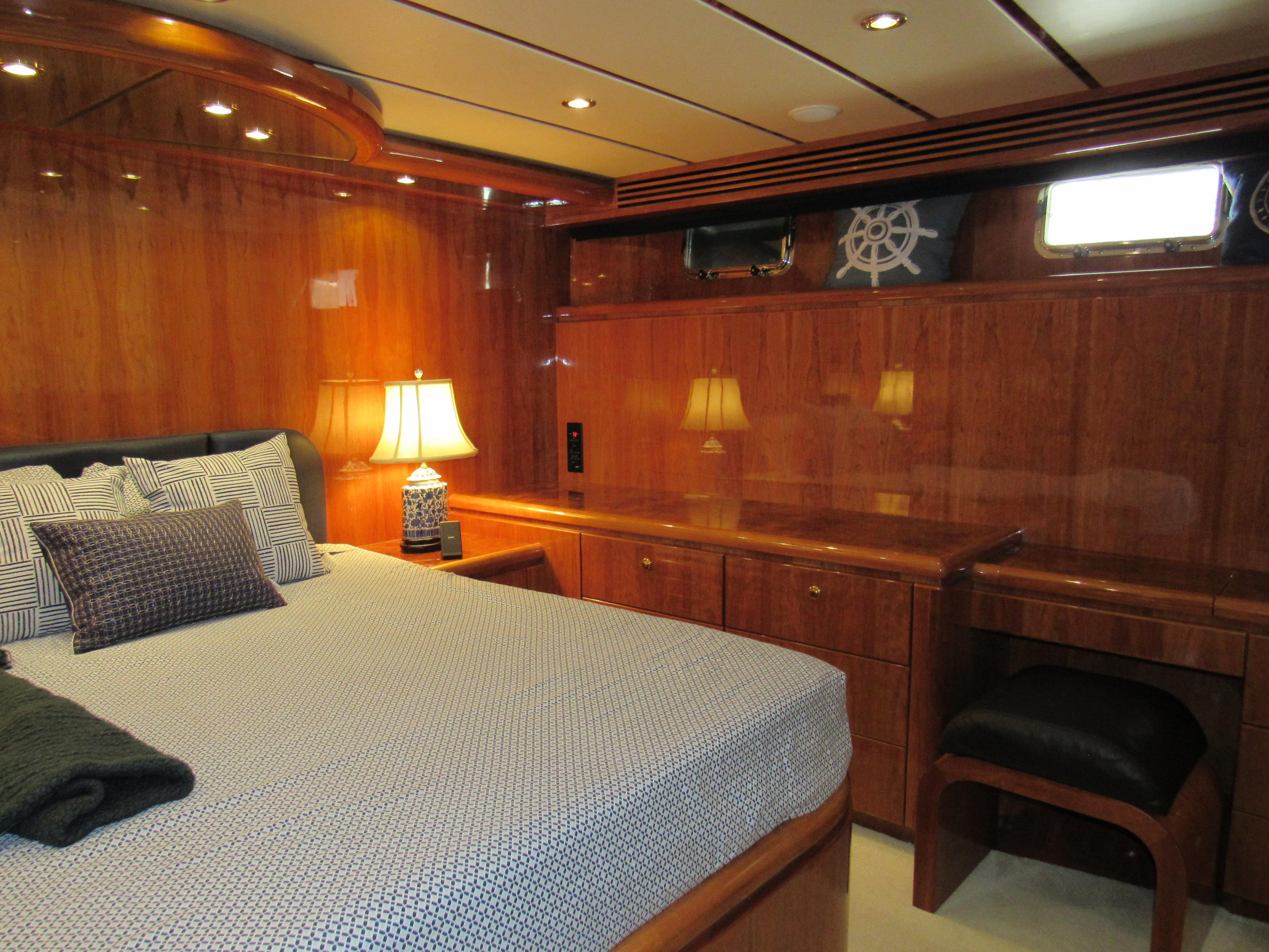 Full beam master with king berth and appropriate locker/drawer storage, large cedar closet, head with Jacuzzi tub, dual sinks, L shaped conversation settee, private access to the office/library.