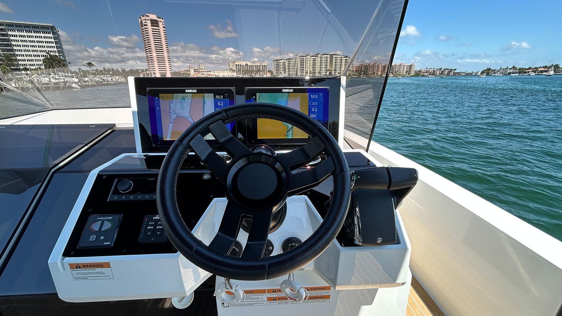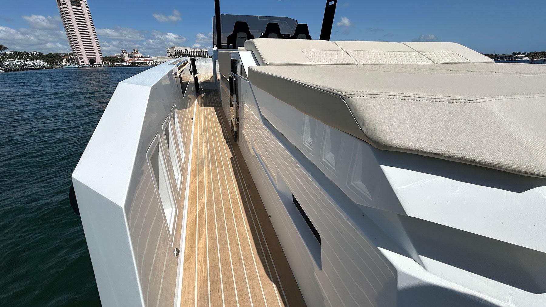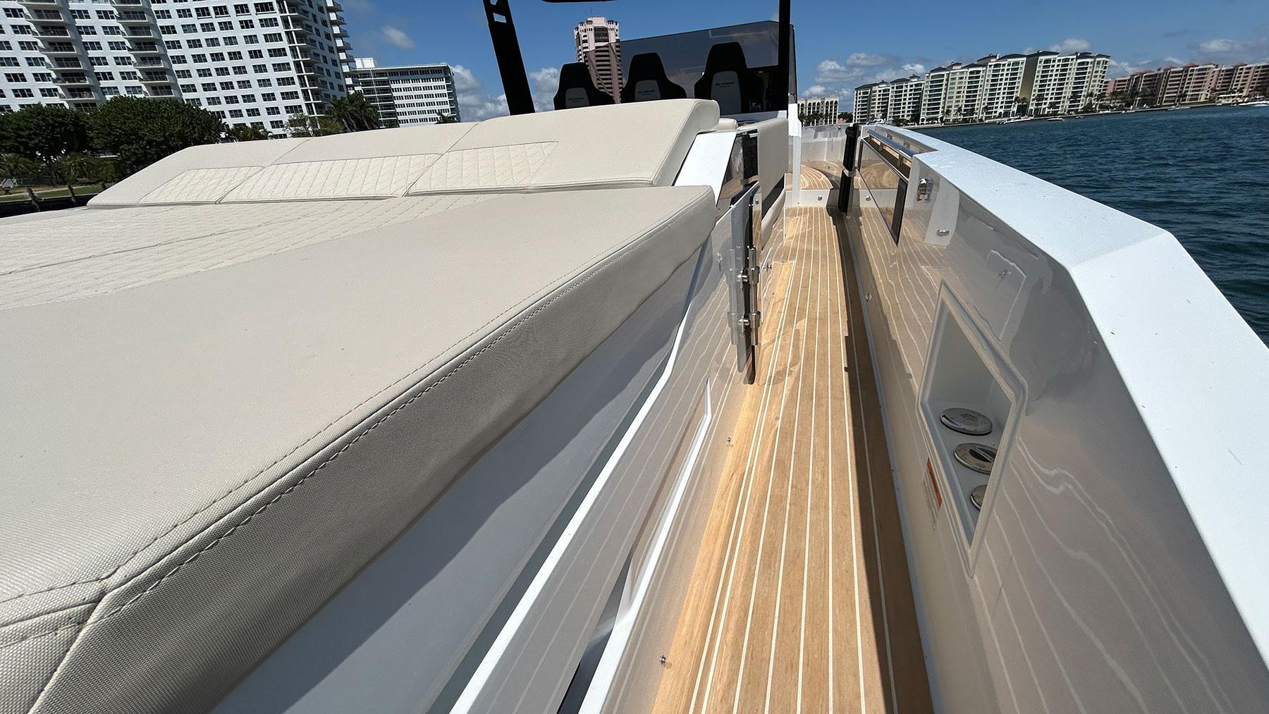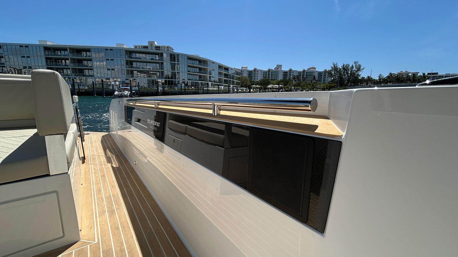 For Sale Pre-Owned 2025 De Antonio 36This yacht has under low hours with Full WarrantyFeatures Included:2 x 400 HP V-10 VeradoAdded Accessories:- Canvas awning extension for bow sundeck- Canvas awning extension for stern sundeck- Covers for seating areas and console- Platform XL- Powerplug 220V in tender garage- Rub Rail- Stern doors- Teak and line colors change - Upholstery color change - Upholstery Morbern Sundance ® seating pilot área (matching exterior upholstery)- Air conditioning (12.000 BTU)- Inverter (3kW with 2 x 220Ah battery)- Second electric refrigerator 49L (exterior)- Underwater LED lights- Water heater 25L- Soft-top- 6 Fenders 92mm Large Black with logo De Antonio Yachts lasered- Audio System Fusion RA670 with 6 speakers + sub-woofer + amplifier- Bow thruster- Electric Flaps Lenco®- Second navigation screen Simrad (12")- Towing eyebolt on the bow
