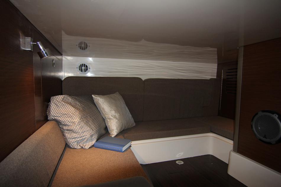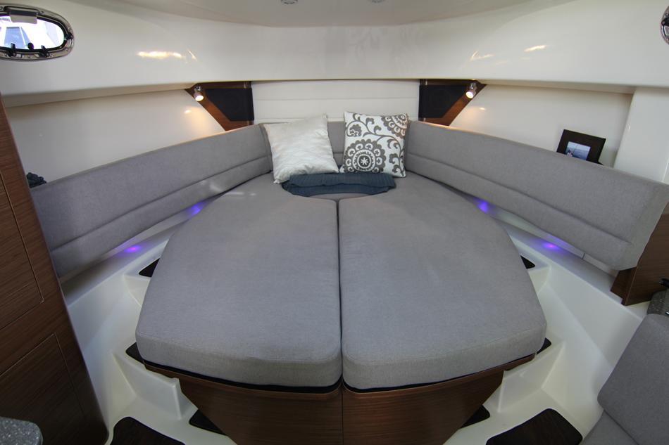 - V-berth dinette with high gloss wood table; table drops with electrically actuated pedestal and converts automatically into queen size island bed; island bed comes with fitted sheet, comforter, two regular size pillowcases and throw pillows