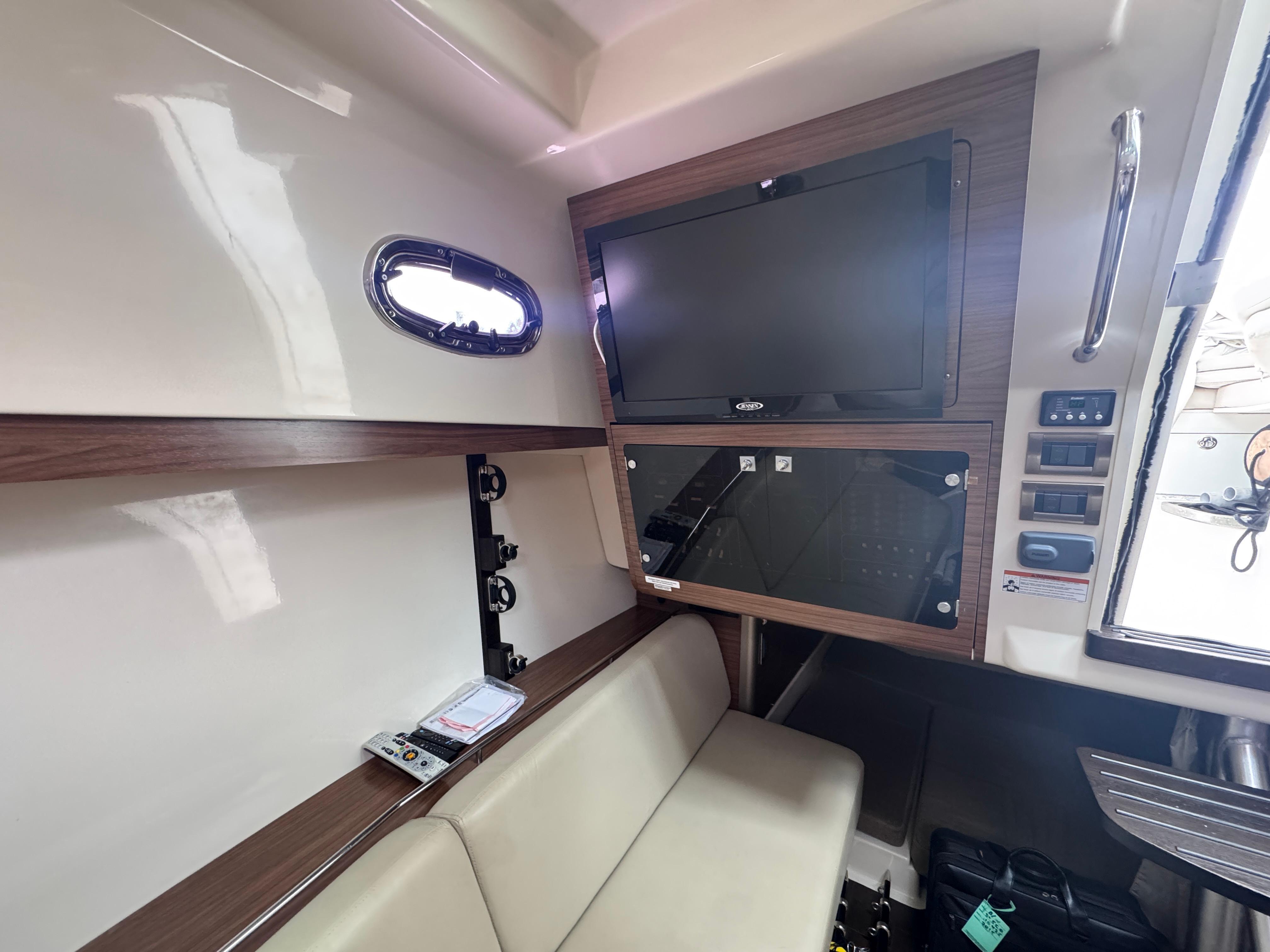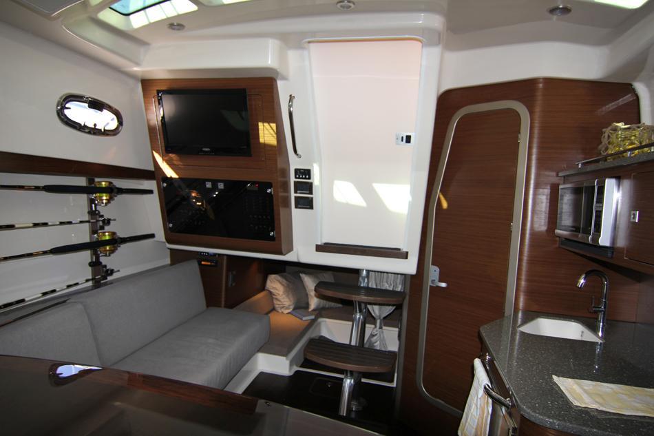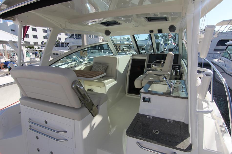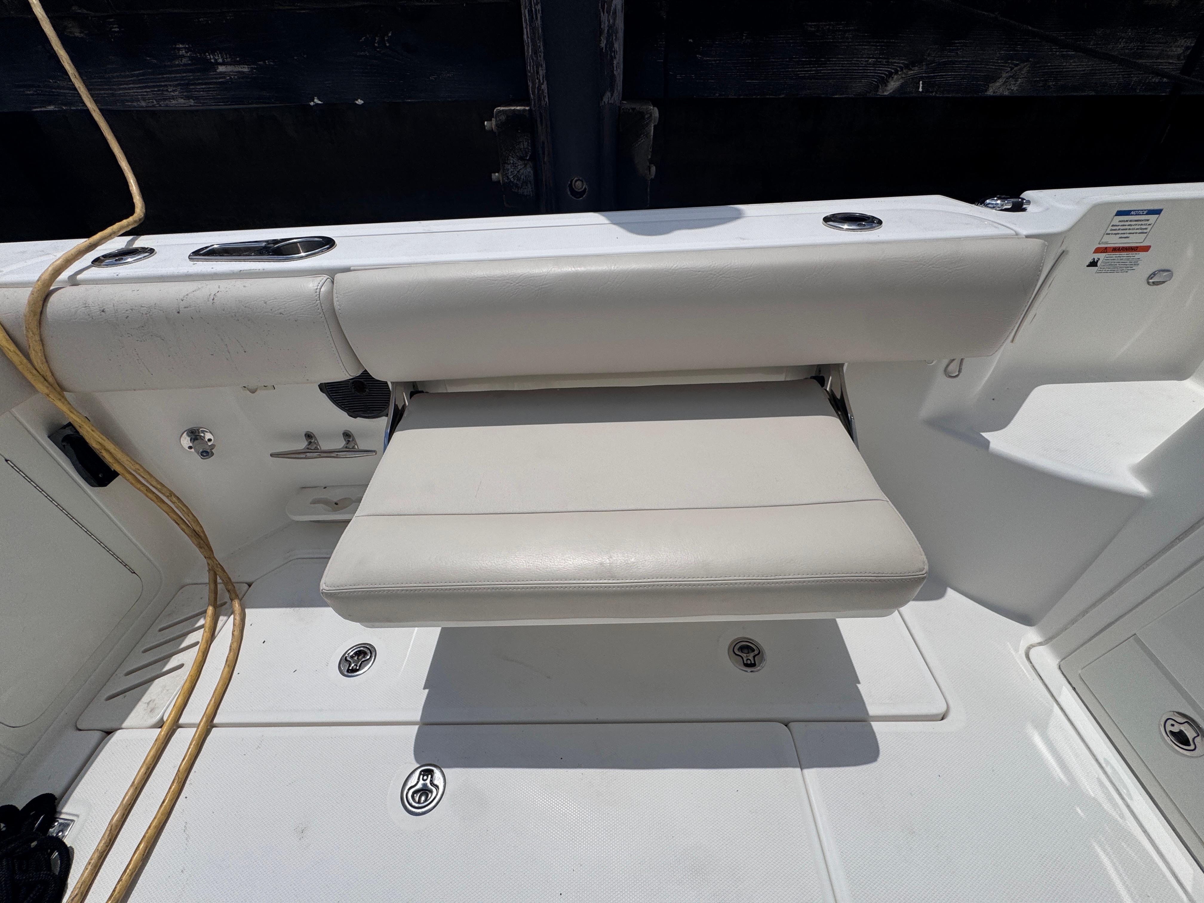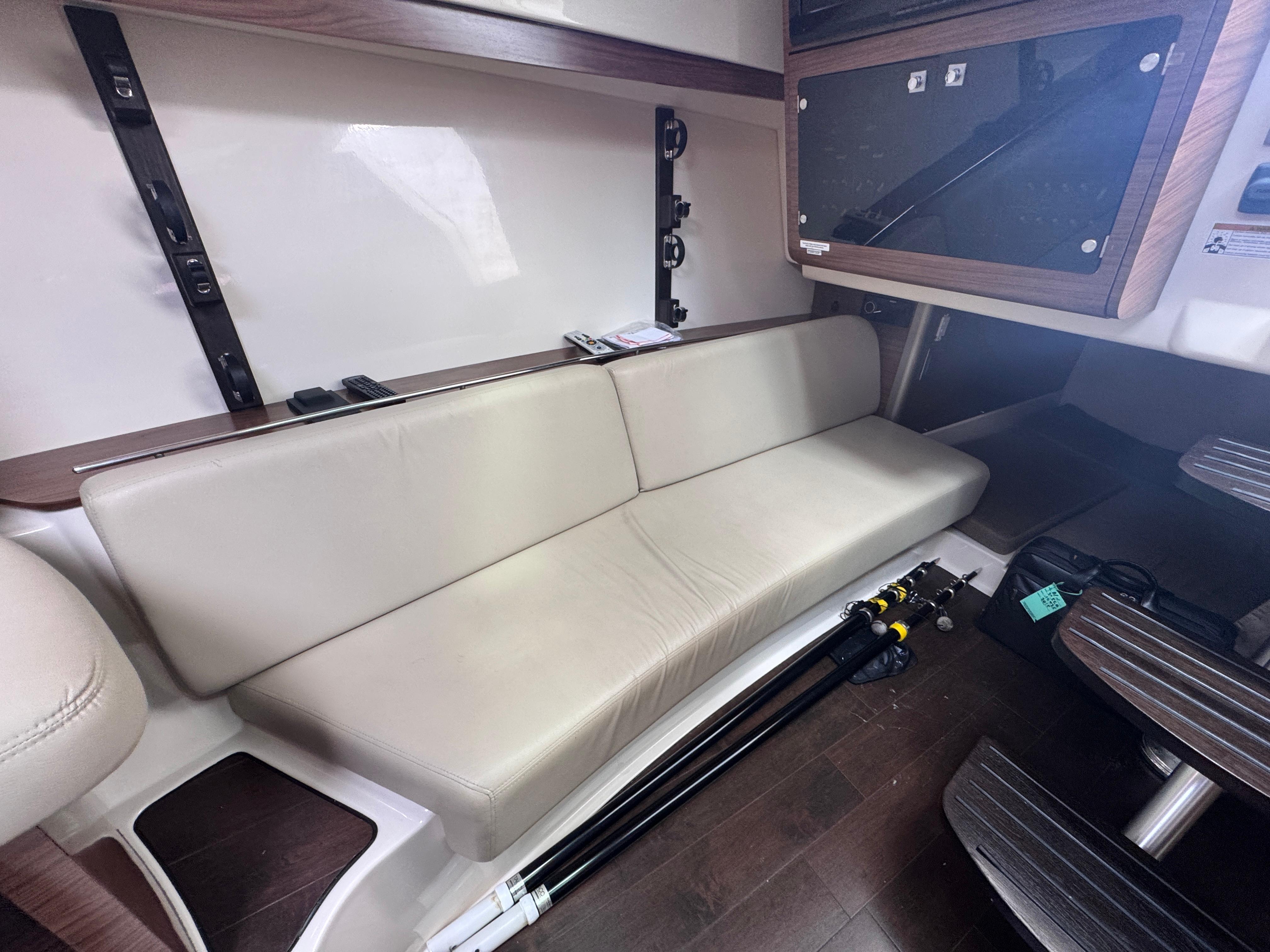 - Starboard helm seat / flip-up bolster with armrests with premium pedestal, with fore, aft and rotational adjustability