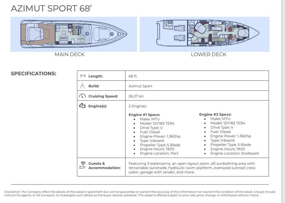The Company offers the details of this vessel in good faith but cannot guarantee or warrant the accuracy of this information nor warrant the condition of the vessel. A buyer should instruct his agents, or his surveyors, to investigate such details as the buyer desires validated. This vessel is offered subject to prior sale, price change, or withdrawal without notice.