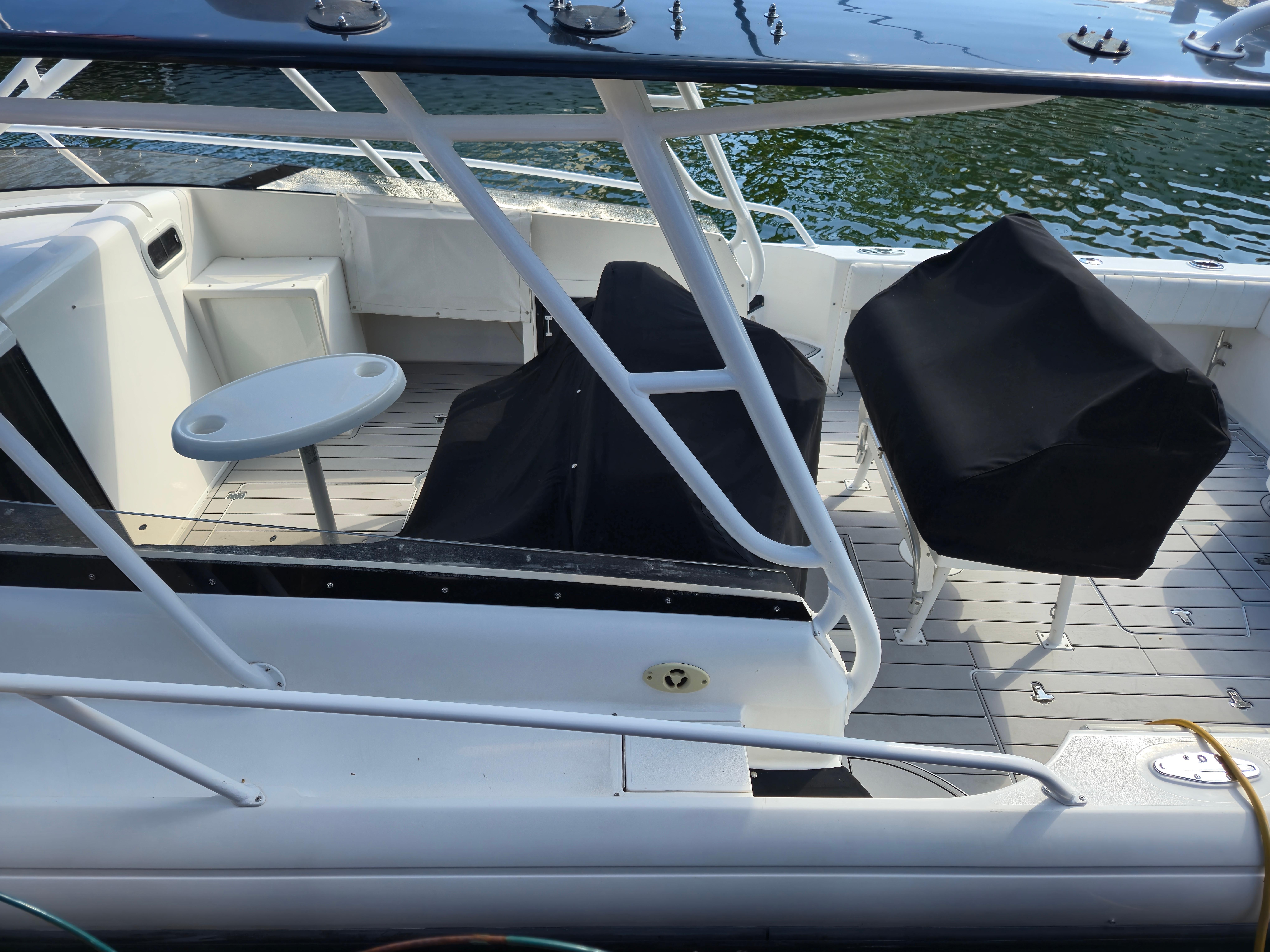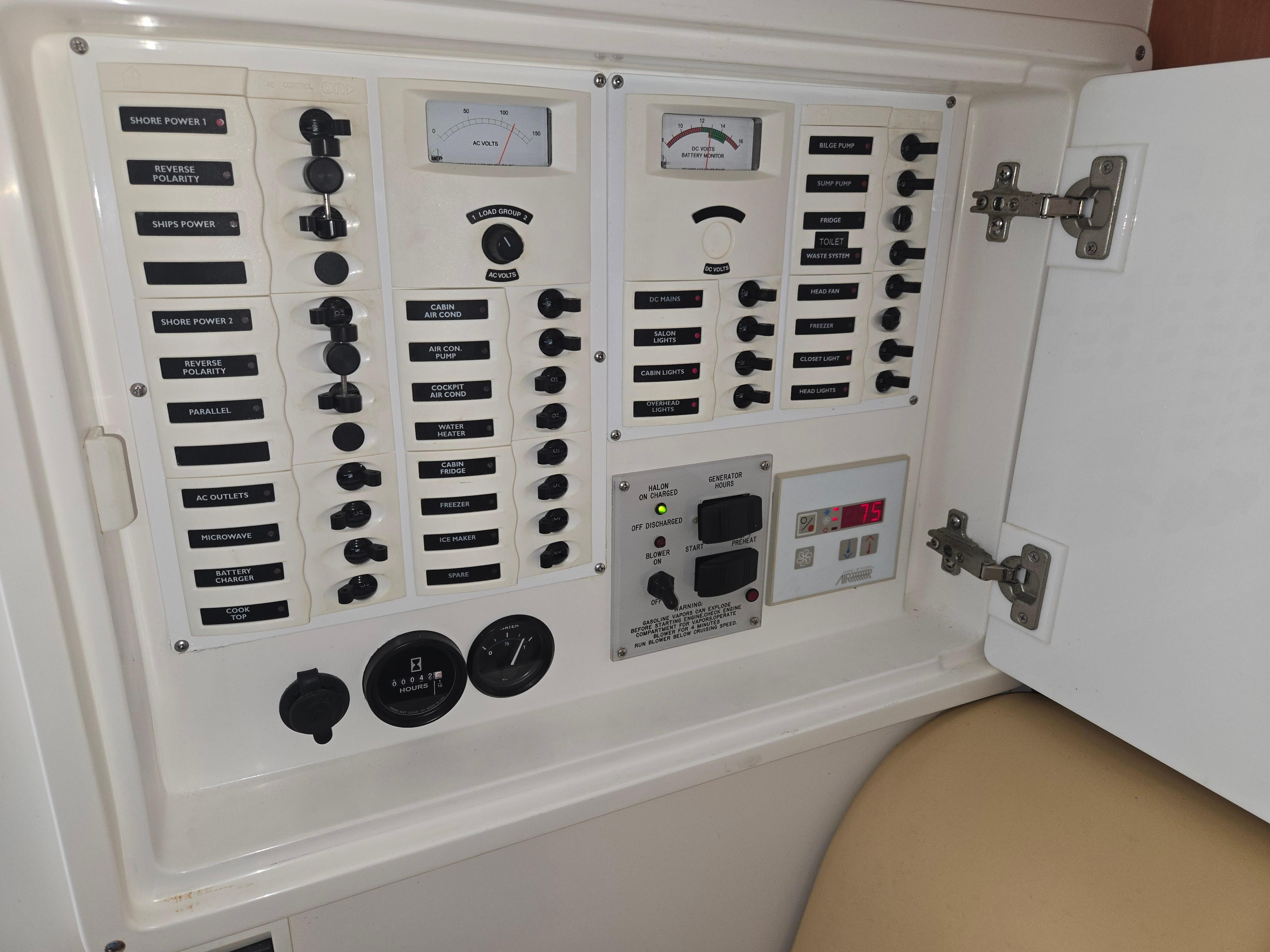 A Queen size berth is on the centerline forward with reading lights to port and starboard. An In-line settee is situated to port which converts to a single berth and storage lockers are installed outboard. Further aft to port is the electrical panel and stairway leading up to the main deck. The galley is located to starboard. The head is situated further aft to starboard and is furnished with an electric flush toilet, Corian countertop and sink, storage cabinet and separate molded shower stall with acrylic enclosure. The interior is tastefully finished with wood veneer cabinets. A white headliner and recessed lighting complete the elegant decor. Central air conditioning keeps the cabin cool and there are three deck hatches and one opening port which provide plenty of natural ventilation when desired