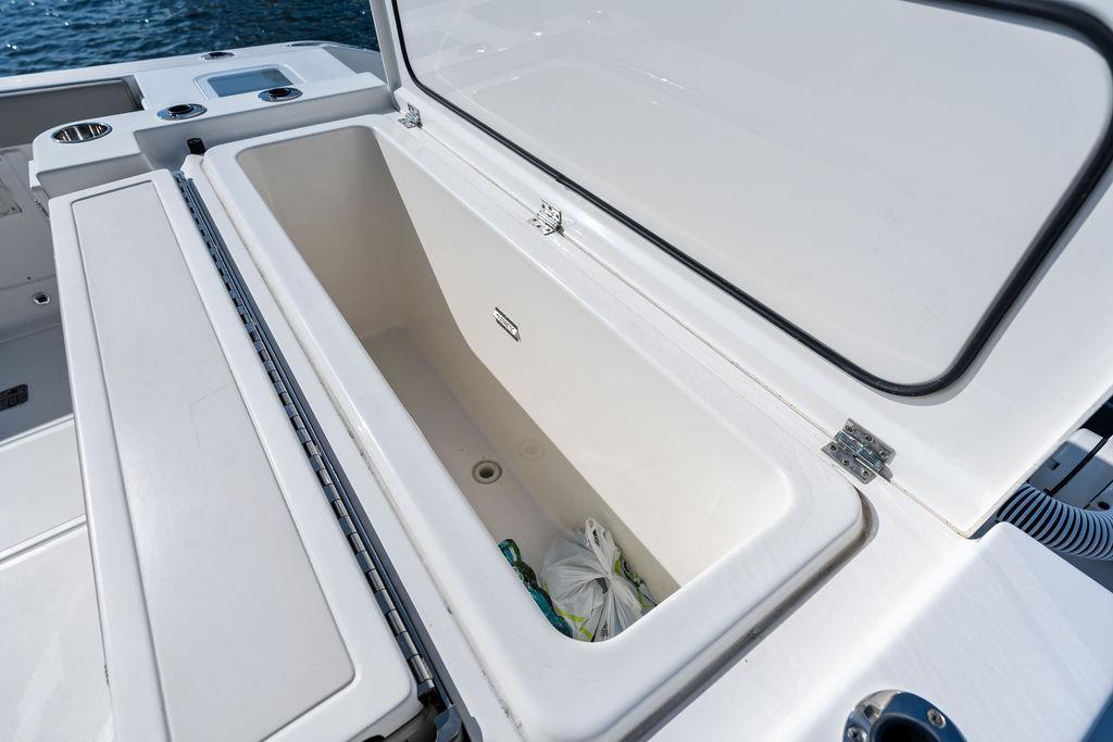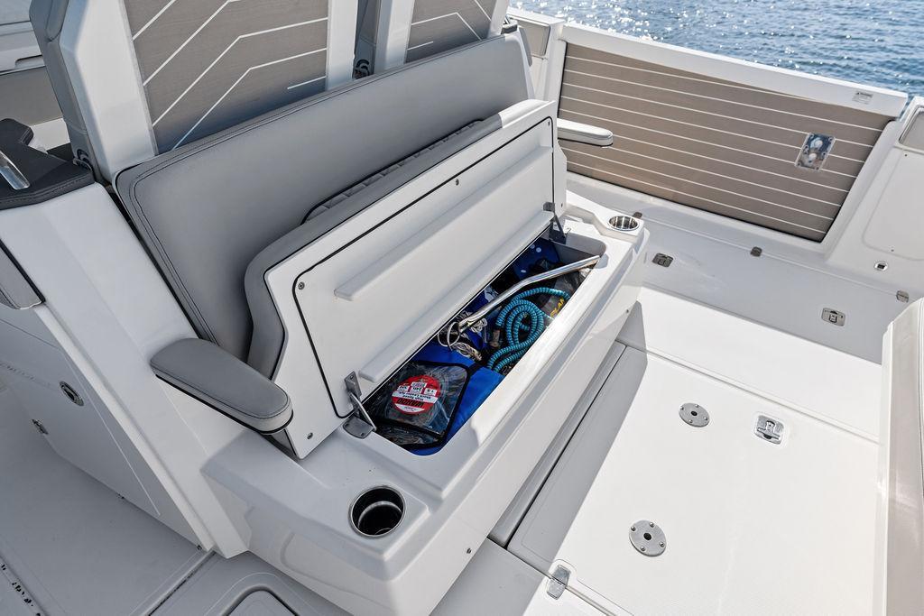 - Helm Seat Box Content: Slide-out Trash Can Access (Port Side) DC Panel and Battery Switch Access (Starboard Side)