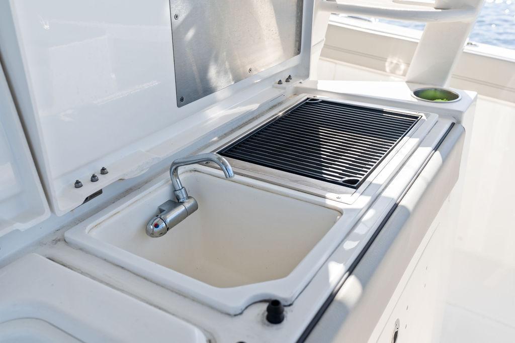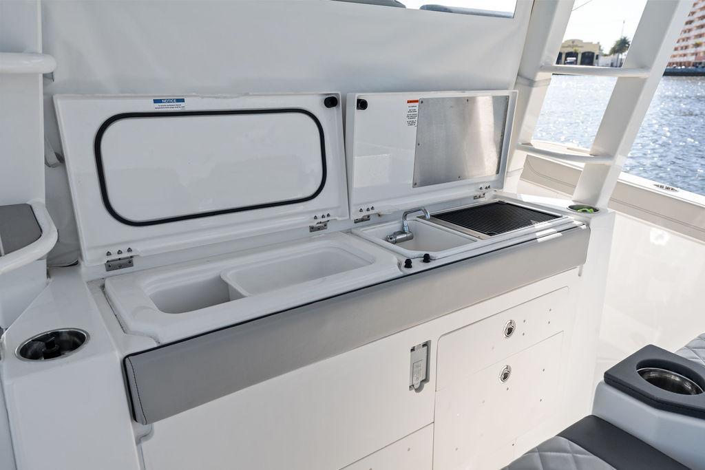 - Molded Cockpit Entertainment Center with Corian Accents, Molded Sink, Hot/Cold Mixing Faucet, Electric Cockpit Grill, Top Load Refrigerator/Freezer (11 gallon) with Digitally Controlled Thermostat, Sliding Storage Tray, Hinged Fiberglass Lids, Cutting Board, Dedicated Storage Drawers and 120V Outlet with GFI Protection