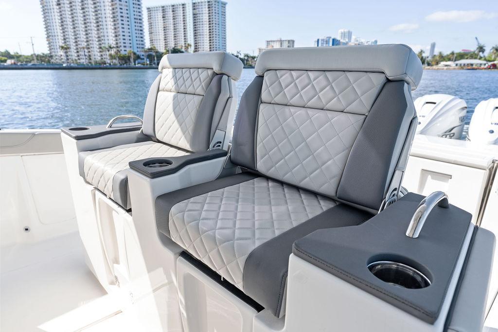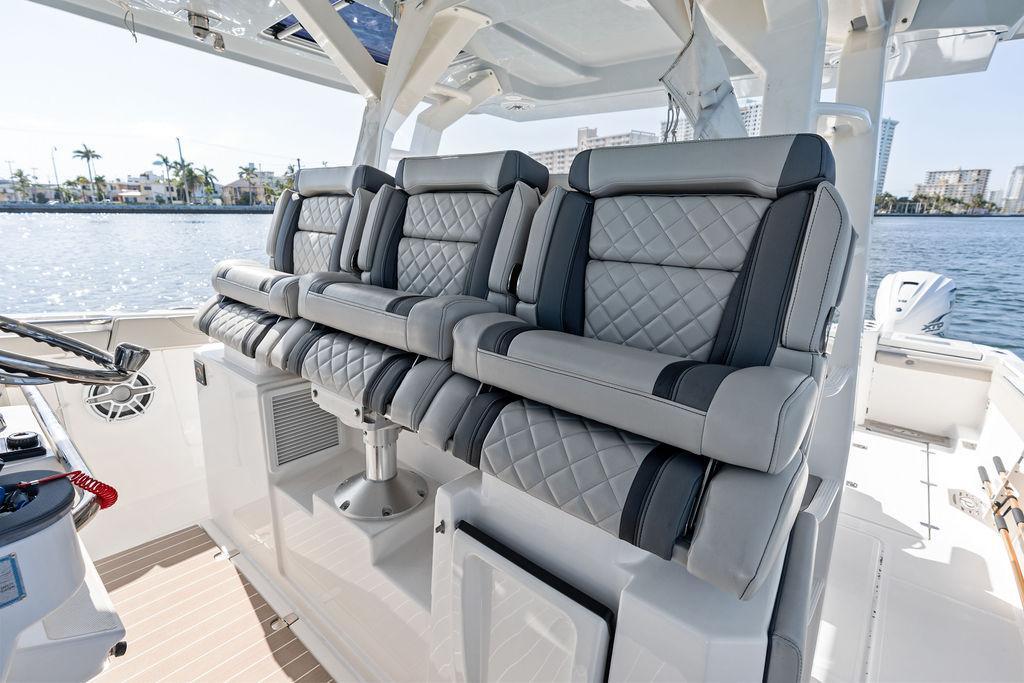 - Pursuit Custom Triple Captain’s Seats with Dedicated Folding Armrests, Three (3) Articulating Flip-Up Bolsters and Lumbar Support, Center Seat has Fore, Aft and Vertical Adjustments
