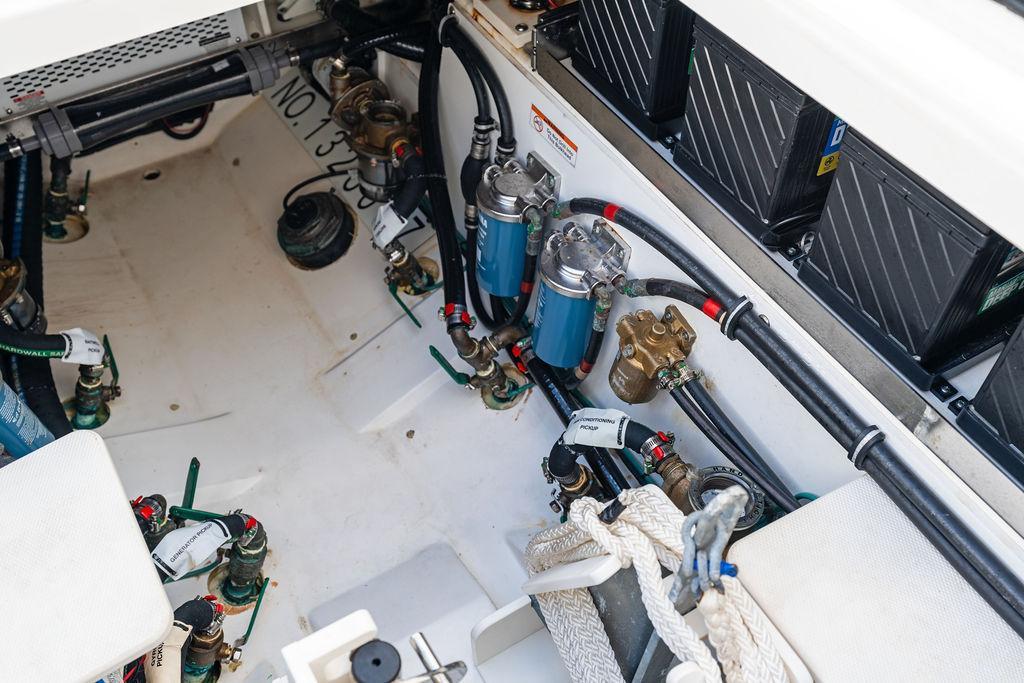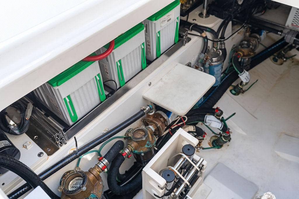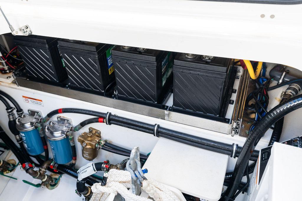 - Eight Battery System: Port Engine (1), Port Center Engine (1), Starboard Center Engine (1), Starboard Engine (1), Electronics (1) (AGM), House (2) (AGM) and Bow Thruster (1) (AGM)