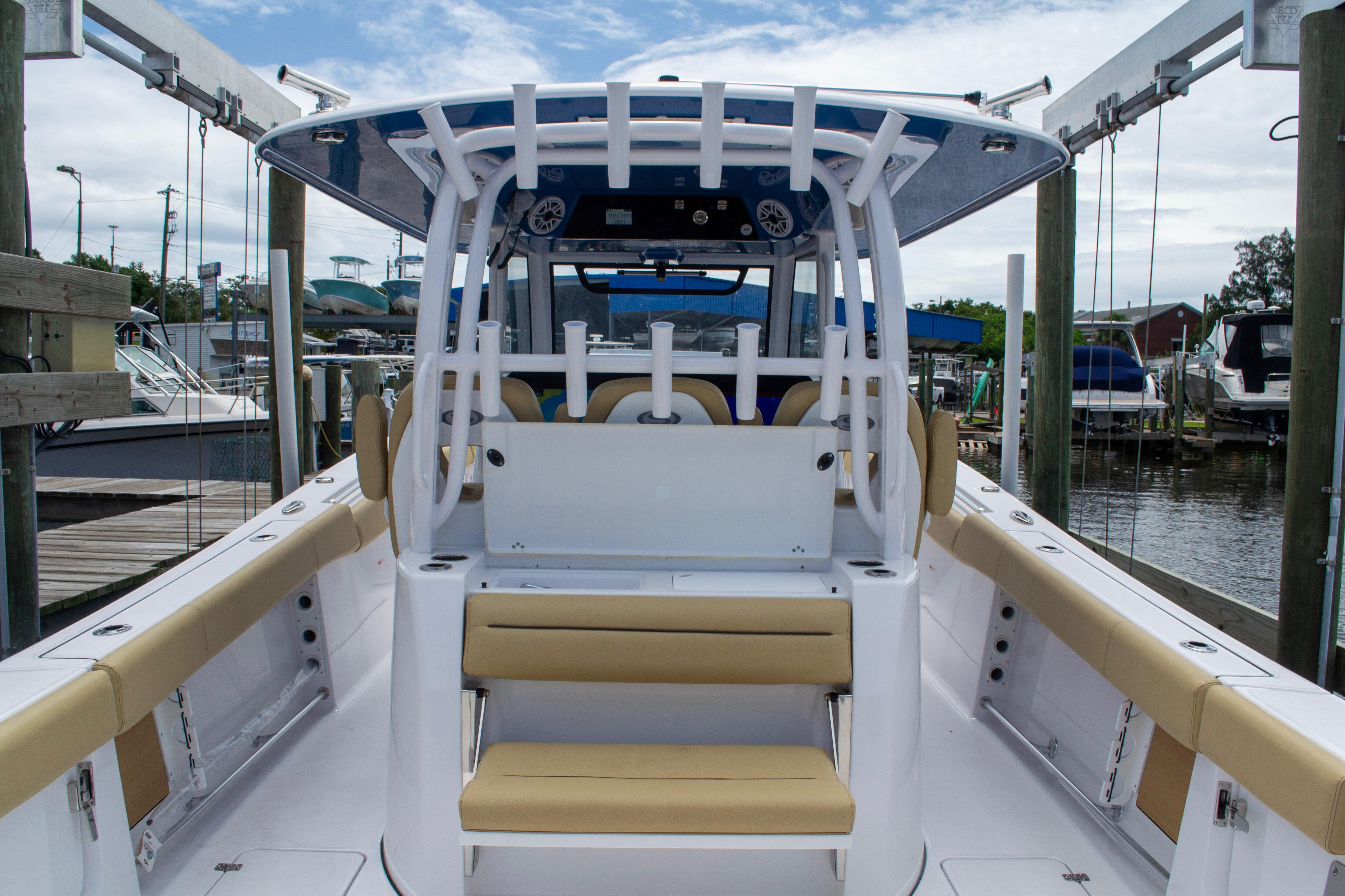 Starting at the transom, 2 30-gallon aquarium livewells with tempered glass windows, dual side entry doors, removable cockpit table, large center cooler and a large flip-up bench seat. Legendary bilge access compartment with a designed-in Seakeeper pod. Leaning post features triple captain's chairs, with table storage and rear facing seating. At the helm, a blacked-out command center with up to 2 22" Garmin displays, VHF, JL Audio M6 with MVi DSP amps and storage. Inside the console, a berth for up to 2 adults and a child, porcelain toilet, sink and plenty of storage. Console front, a sculpted seat for 2 with a 65 qt. cooler. At the bow, wrap-around seating with electronically actuated table, under gunwale storage, comfortable deep seating with backrests and windlass foot controls.