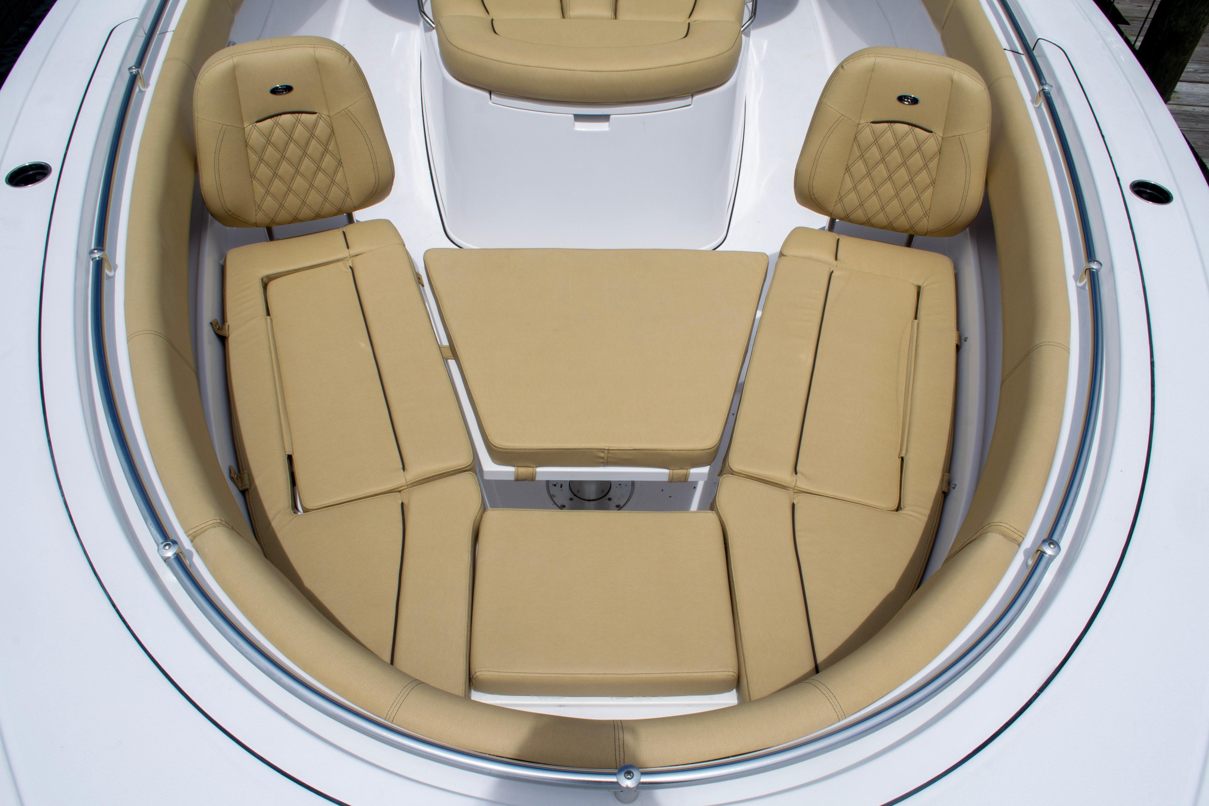 Starting at the transom, 2 30-gallon aquarium livewells with tempered glass windows, dual side entry doors, removable cockpit table, large center cooler and a large flip-up bench seat. Legendary bilge access compartment with a designed-in Seakeeper pod. Leaning post features triple captain's chairs, with table storage and rear facing seating. At the helm, a blacked-out command center with up to 2 22" Garmin displays, VHF, top of the line Garmin Fusion Signature speakers and storage. Inside the console, a berth for up to 2 adults and a child, porcelain toilet, sink and plenty of storage. Console front, a sculpted seat for 2 with a 65 qt. cooler. At the bow, wrap-around seating with electronically actuated table, under gunwale storage, comfortable deep seating with backrests and windlass foot controls.