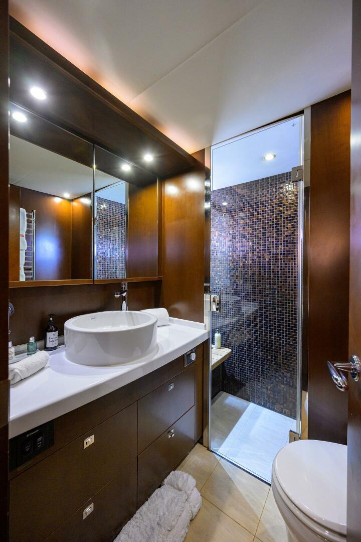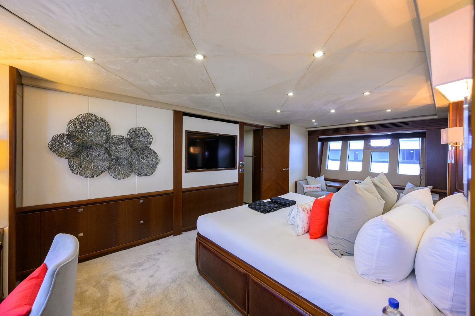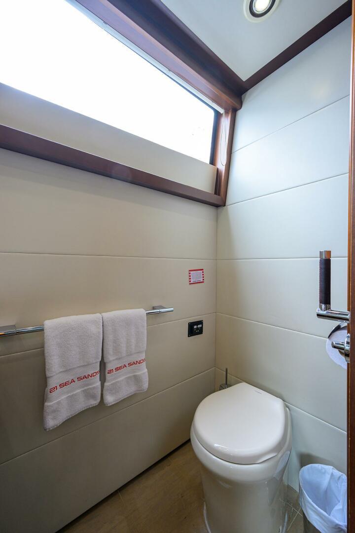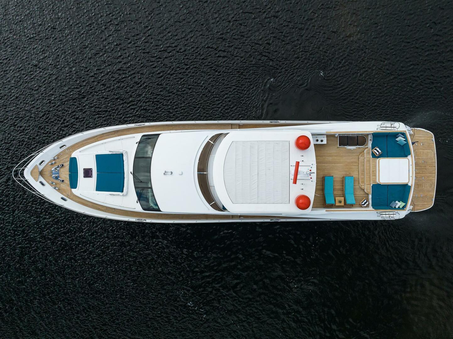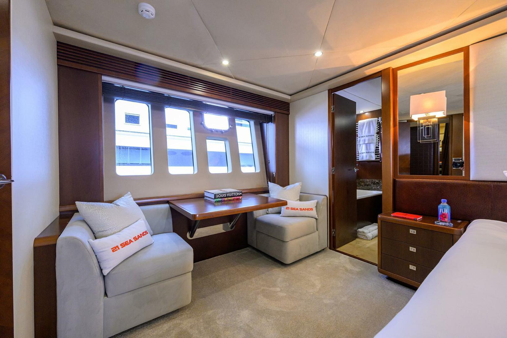 Accommodating up to eight guests, 21 SEA SANDS features four beautifully appointed staterooms. The owner’s suite is located amidship and offers a king-sized bed, while the forward VIP stateroom also boasts a king-sized bed. Additionally, there is a stateroom with a queen-sized bed and a twin cabin that can convert into a double. All staterooms are equipped with entertainment systems, televisions, and en-suite facilities. The custom-designed sundeck is ideal for outdoor entertainment, featuring a spacious relaxation area, a bar complete with a sink, fridge, ice maker, and Teppanyaki grill, along with an open-air cinema. For dining, an integrated sofa seats eight guests comfortably, all sheltered by a large sliding roof. Powered by twin MTU M93 2000 engines, 21 SEA SANDS cruises at 12 knots, reaching a top speed of 25 knots, and includes zero-speed stabilizers for comfort at anchor.