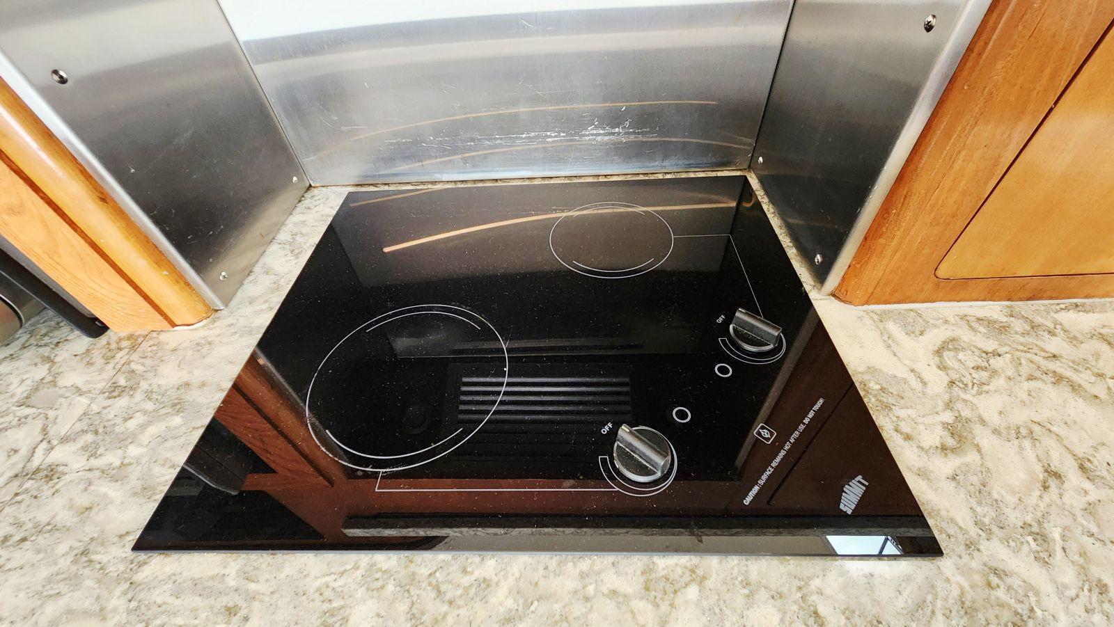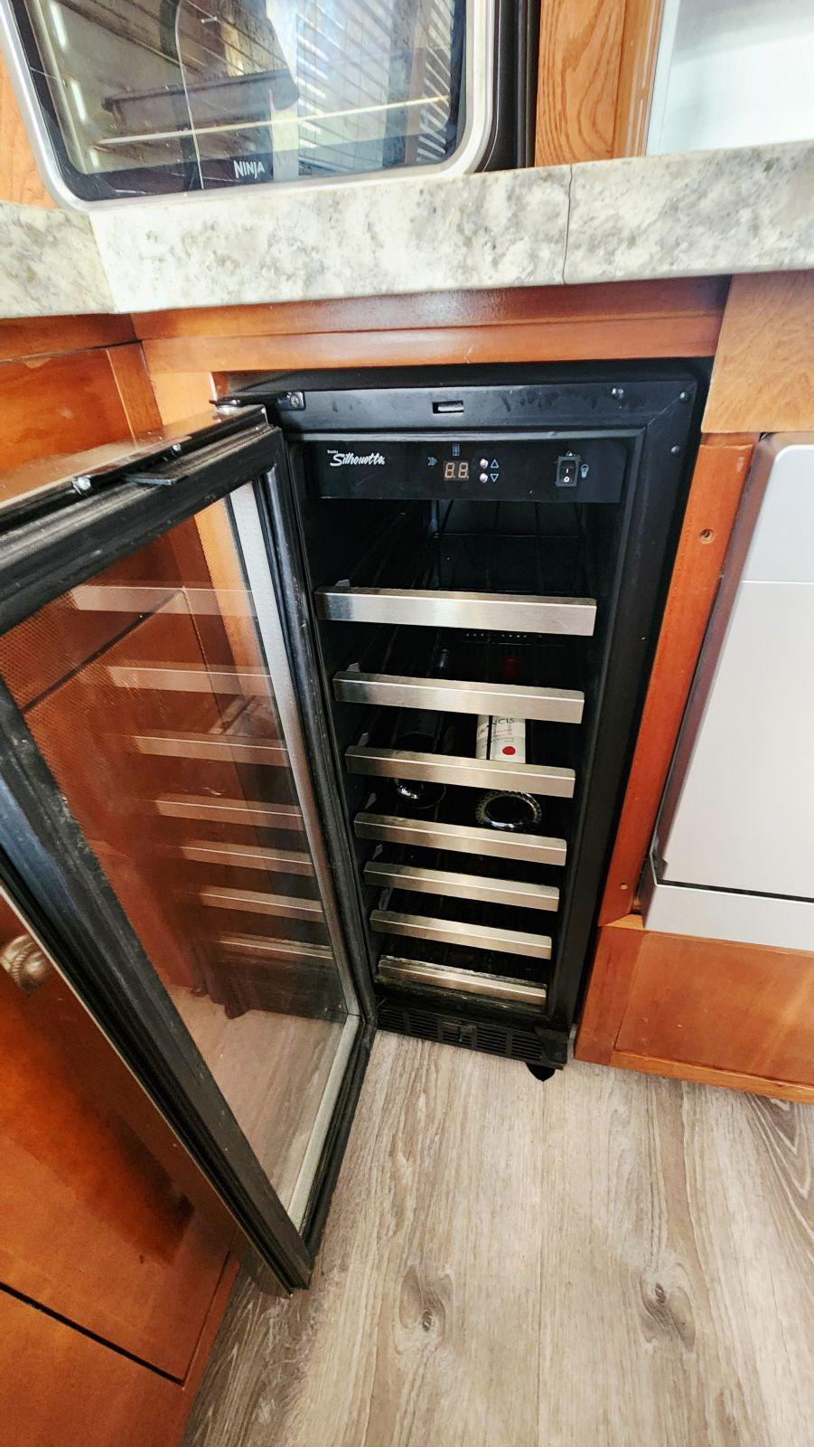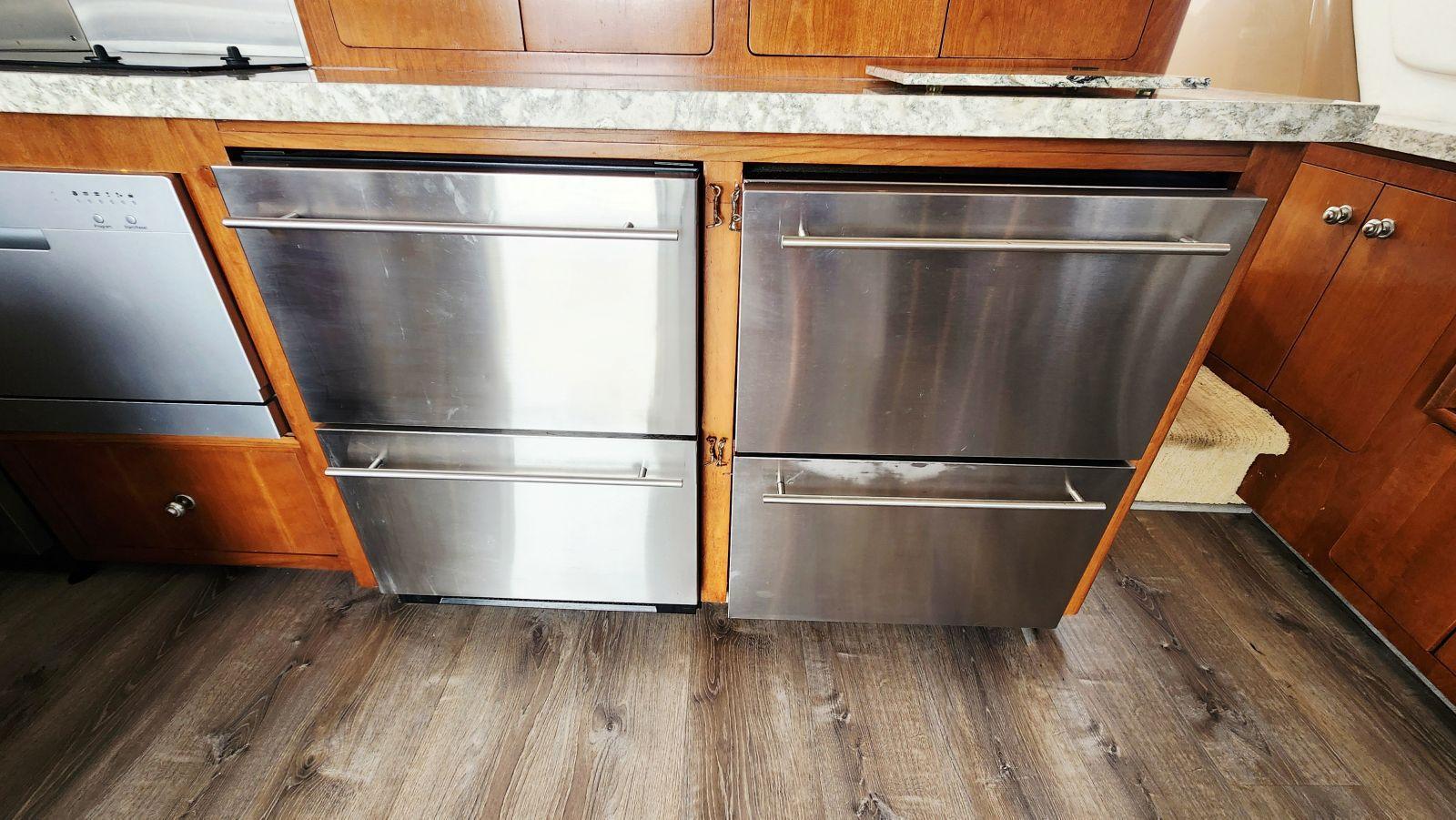 Appliances are thoughtfully selected for both performance and efficiency, including a Summit 2-burner electric cooktop, Ninja convection oven, SPT dishwasher, and Silhouette under-counter beverage refrigerator. Two drawer-style stainless steel refrigerator/freezer units provide additional cold storage with a modern flair, making meal prep easy whether you're dockside or at anchor.