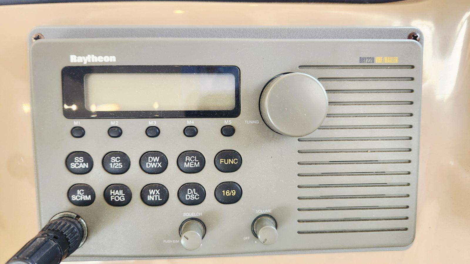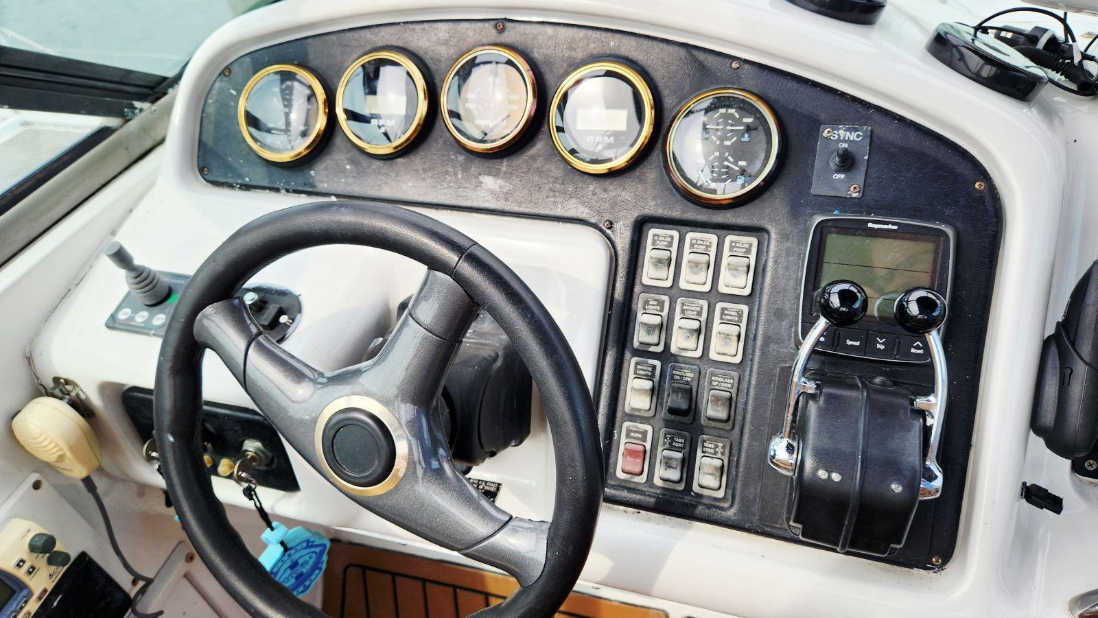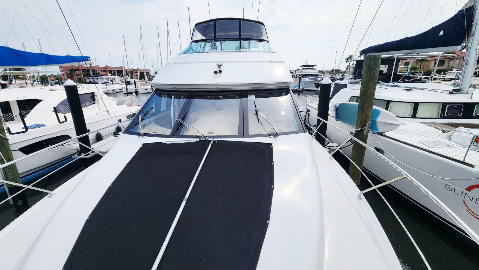 The entire flybridge is enclosed in crystal-clear Isinglass panels, which are in excellent condition. This enclosure creates a four-season space that protects from wind and rain while preserving the connection to your surroundings. When the weather is fine, the panels open easily for a true open-air cruising experience.