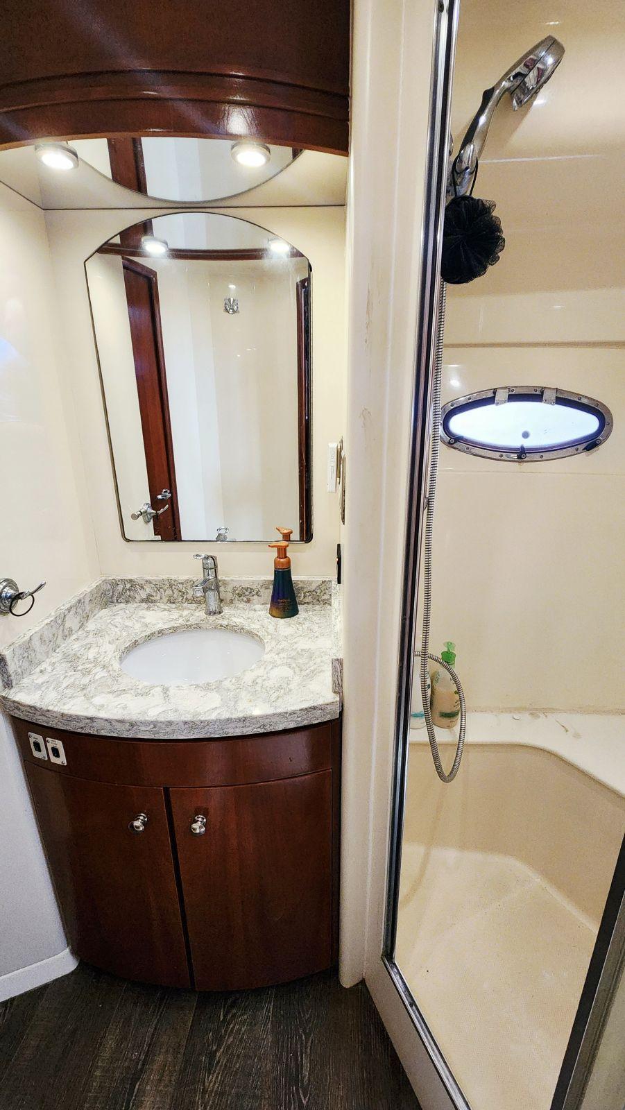 An opening portlight allows for fresh air and ventilation, and overhead LED lighting ensures the space remains bright and inviting at any hour. Whether accessed privately from the VIP stateroom or shared via the hallway, the guest head aboard Livin' the Dream I delivers comfort, convenience, and a polished finish that your guests will appreciate. Carver 530 Guest Head