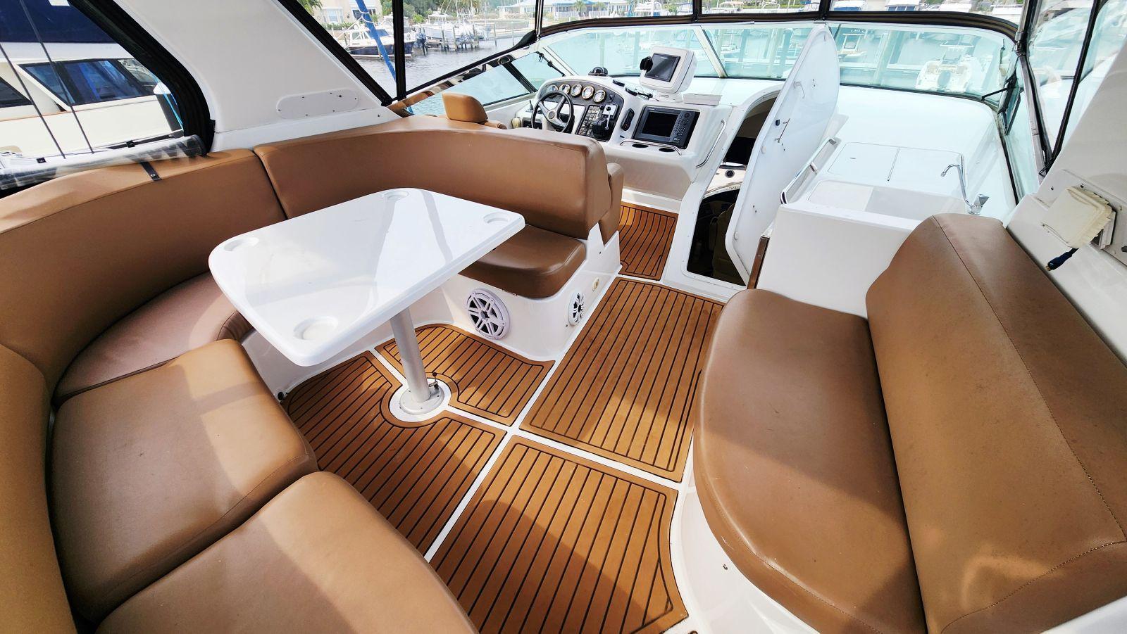 You can access the flybridge from the interior via a wide molded staircase leading up from the pilothouse or from the cockpit ladder below. Once on deck, you're greeted by elegant teak-style SeaDek flooring, which adds a warm, traditional look while providing a soft, non-skid surface underfoot. The wraparound seating has been tastefully reupholstered, giving the space a clean, modern aesthetic and exceptional comfort.