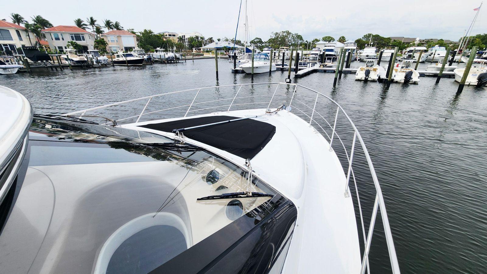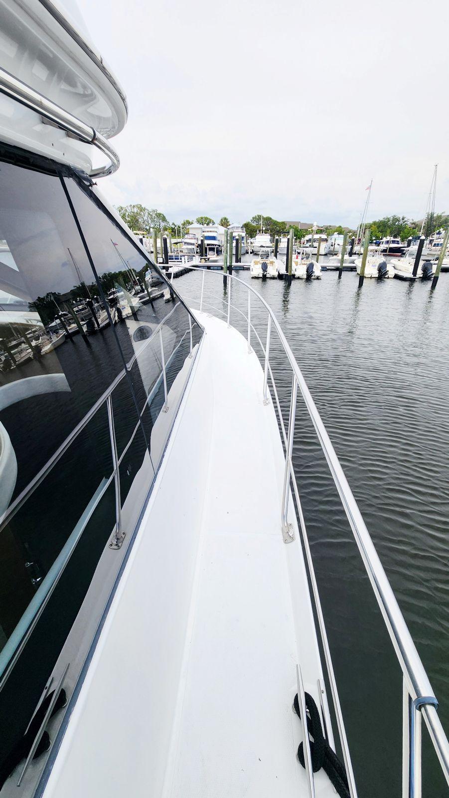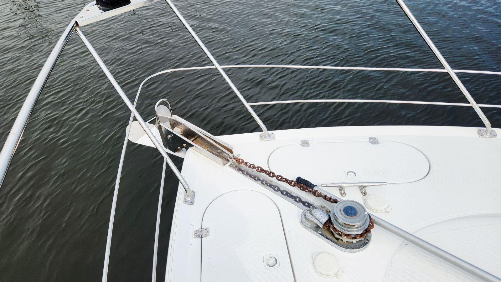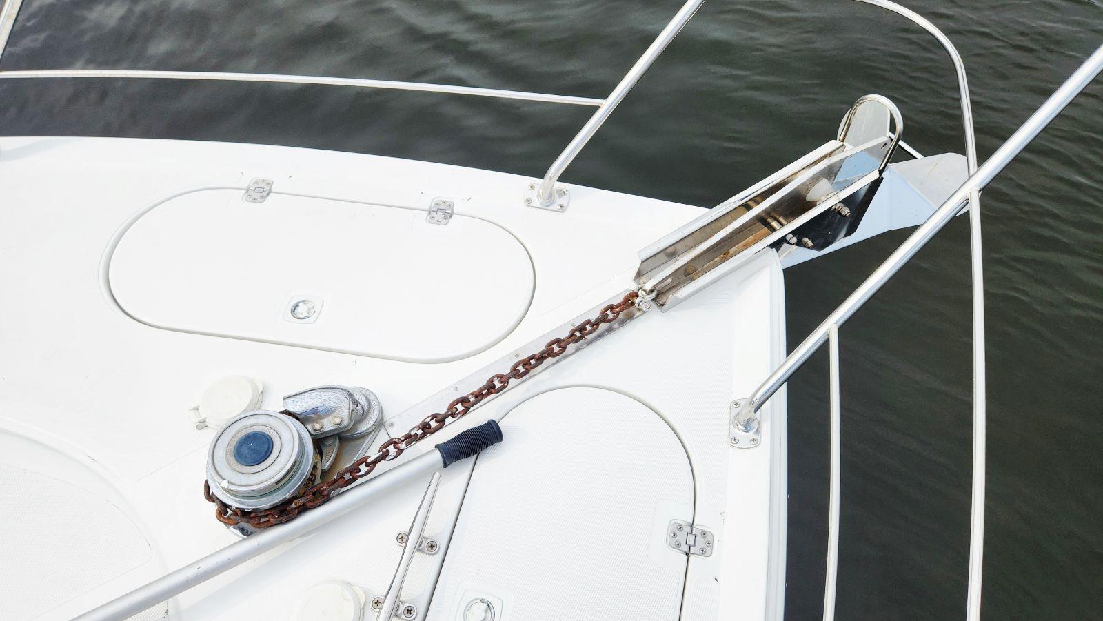 Moving forward, the foredeck is easily reached via the pilothouse starboard side door or the exterior molded steps from the cockpit. Whether anchoring out or prepping lines at the dock, you'll appreciate the wide side decks and high stainless railings that make moving about safe and simple.